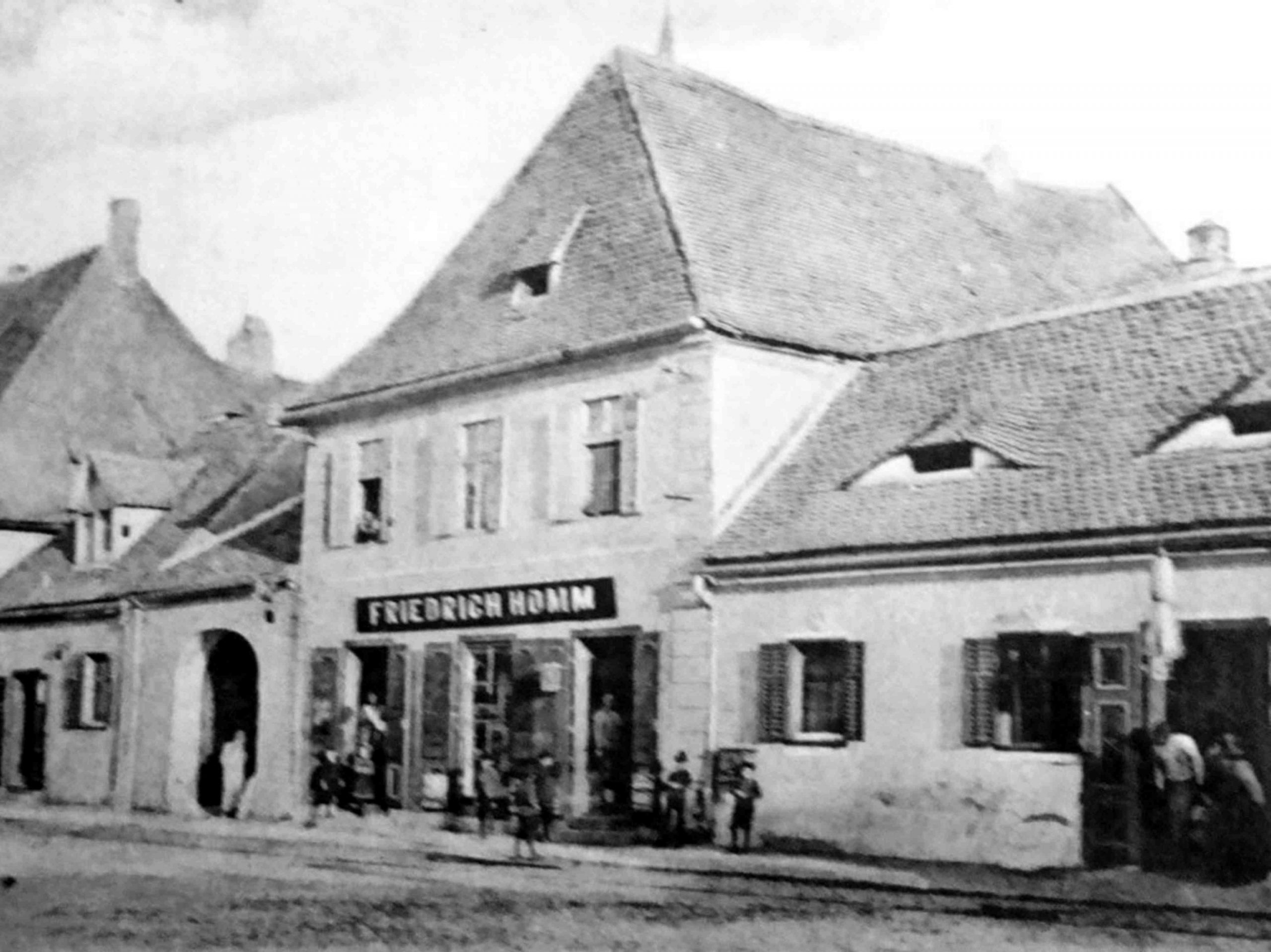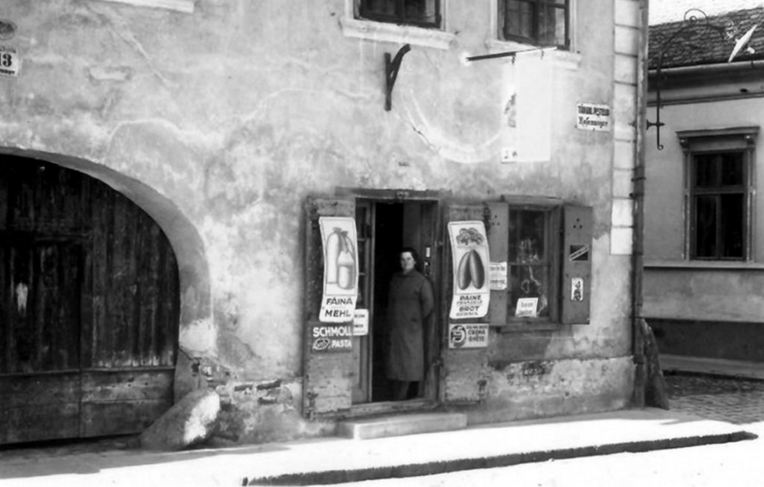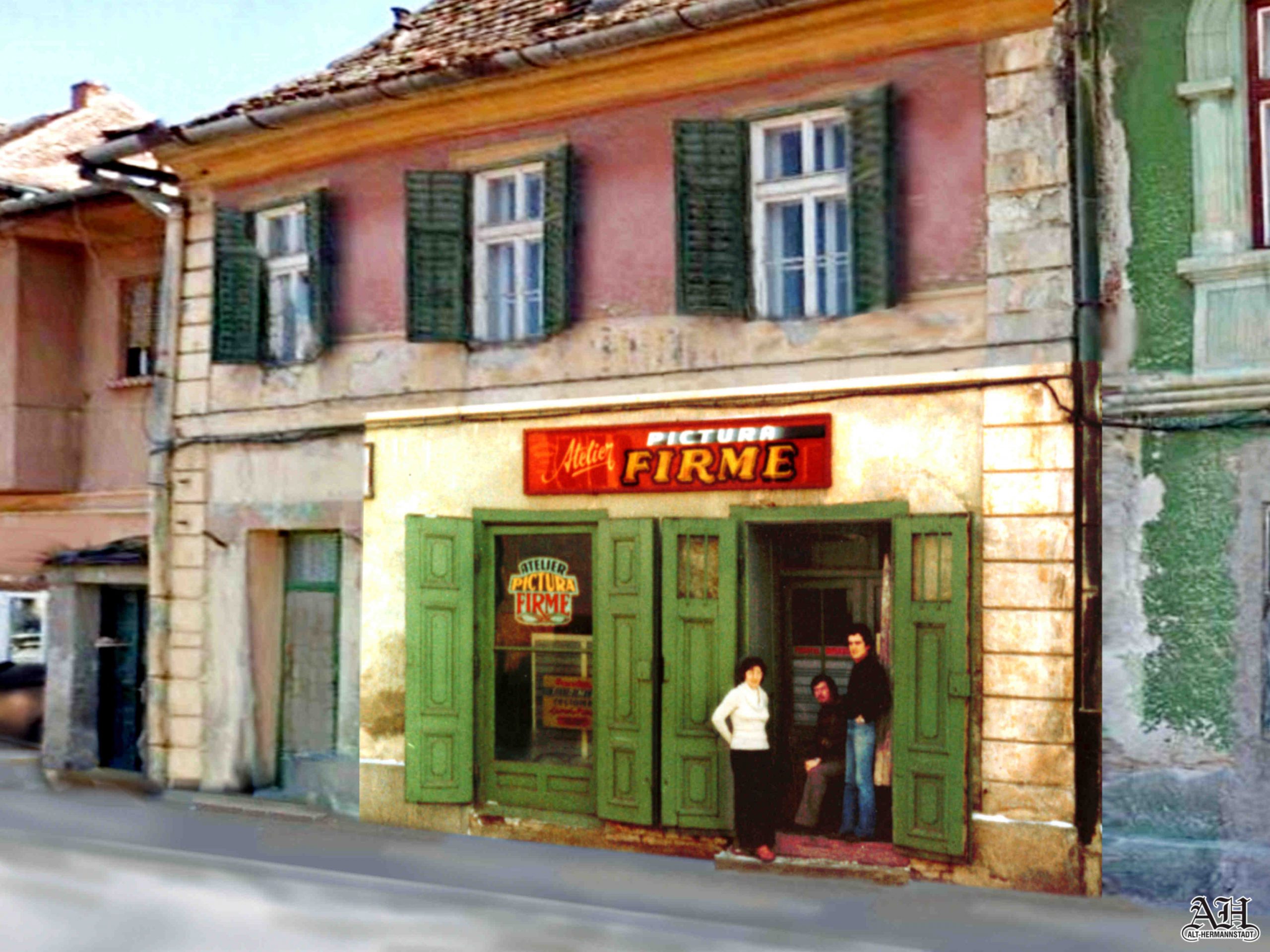 Clădirea noastră avea spre stradă la parter două uși și o vitrină cu obloane. Prin ușa din partea dreaptă se intra în atelierul nostru, prin ușa din partea stângă intr-o camera îngustă în care funcționa în anii 1970/80 o tutungerie. Între atelierul de firme si tutungerie se afla o ușă zidită! După desființarea tutungeriei s-a mutat în spațiul respectiv sifonăria coop. Igiena de pe str. 9 Mai (Elisabetgasse). Sifonarul Rühn era tatăl cunosutei gimnaste cu renume international Melitta Rühn, cea care a castigat o medalie de aur la Campionatul Mondial de gimnastica la Fort Worth 1979 și o medalie de argint și doua de bronz la Jocurile Olimpice de la Moscova 1980.