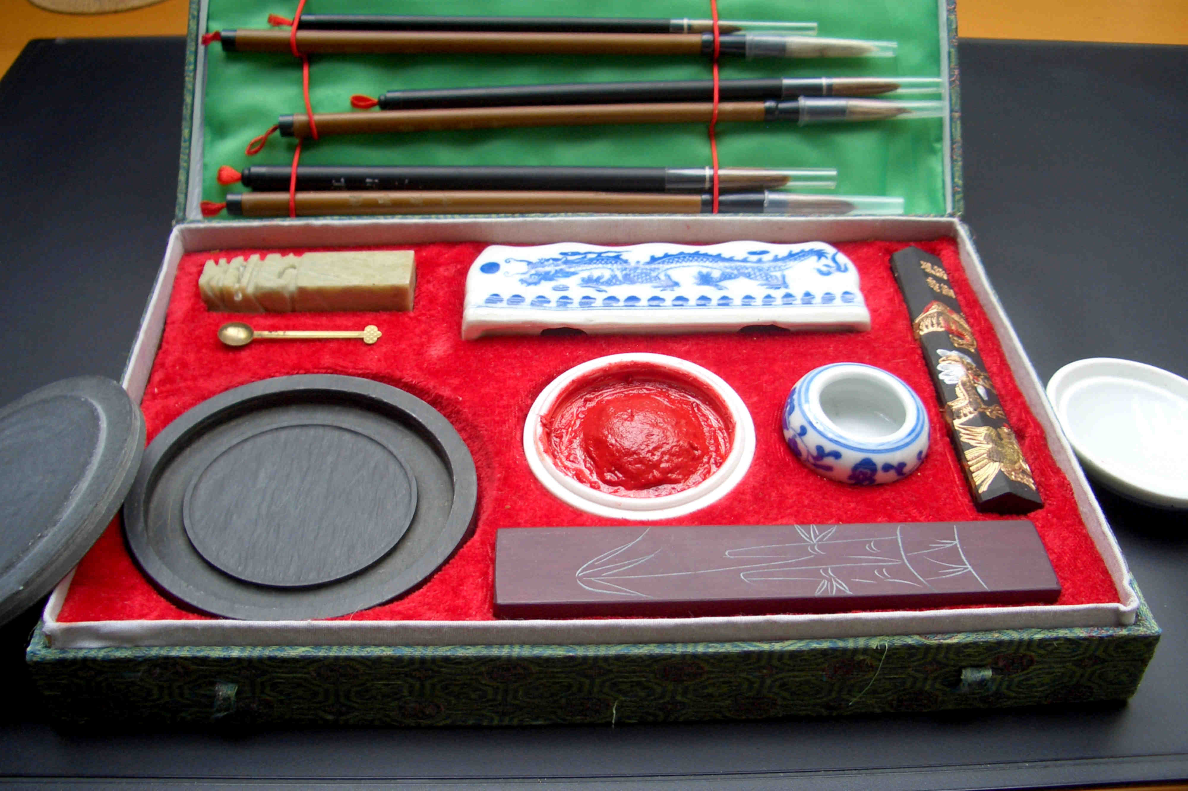1) Pensula 筆 (bǐ) a fost realizate din păr de capră (pensule moi), blana cozii de nevastuică (pensule dure) și bambus. 2) Cerneala 墨 (mo) se afla în stare solida având aspectul unor batoane fabricată din minerale (grafit sau cinabru) sau din cărbune amestecat cu rășînă de pin. 3) Hârtia 紙 (zhǐ) chinezească era produsă din fibre de plante strivite și amestecate cu apă. Hârtia absorbea foarte repede cerneala. 4) Piatra pentru cerneală 硯 (Yan) era folosită la măcinarea și amestecarea cu apă a batoanelor de cerneală.