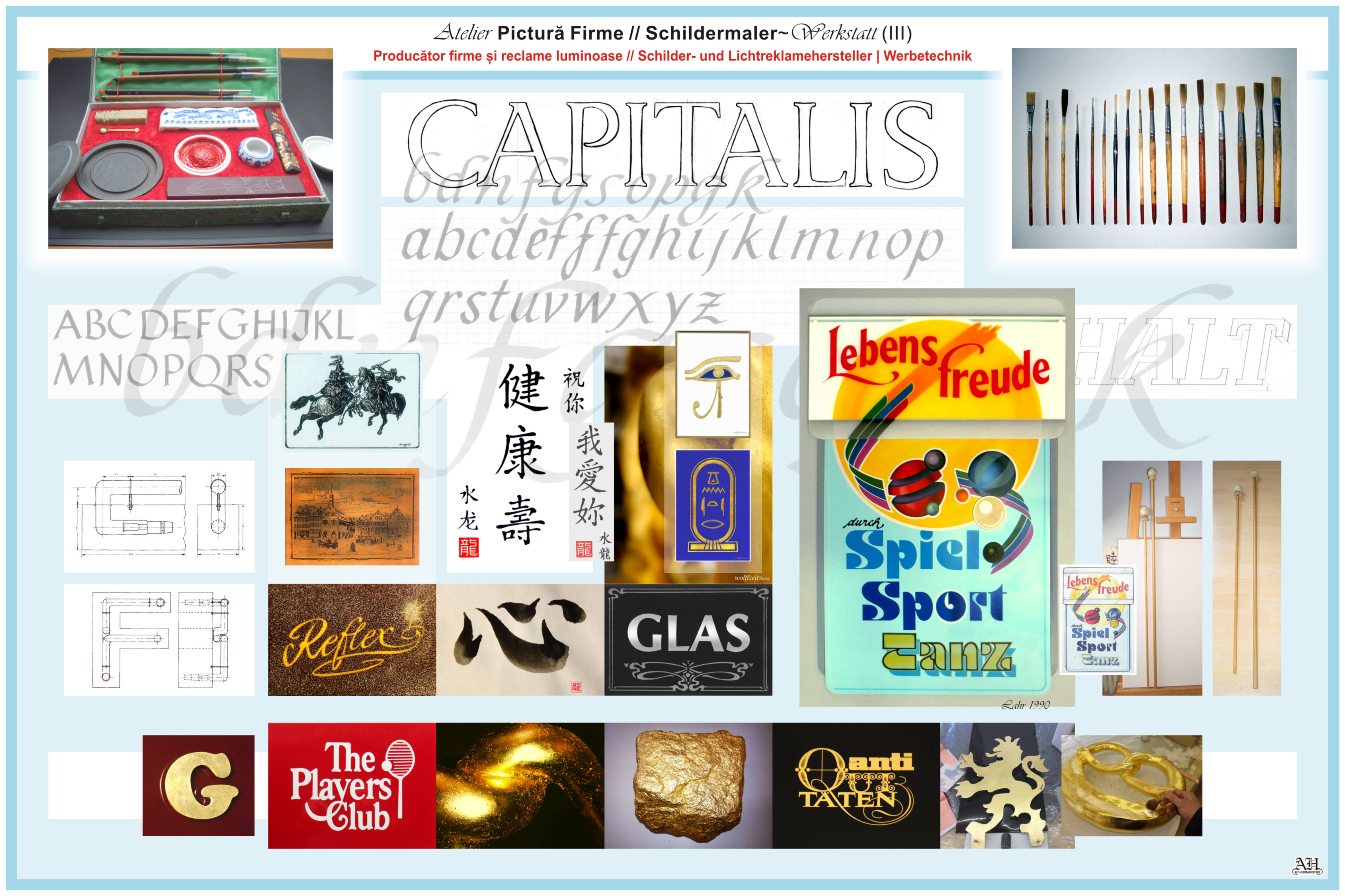 Inscripționările și picturile au fost realizate manual, fară mașini sau utilaje ajutătoare, pe diferite tipuri de materiale puse la dispoziție de clientelă. Pe lângă lucrări efectuate în atelier se executau și lucrări pe teren, cum ar fi reclame pictate pe vitrine, geamuri, uși sau inscripționări autovehicole comerciale si utilaje.