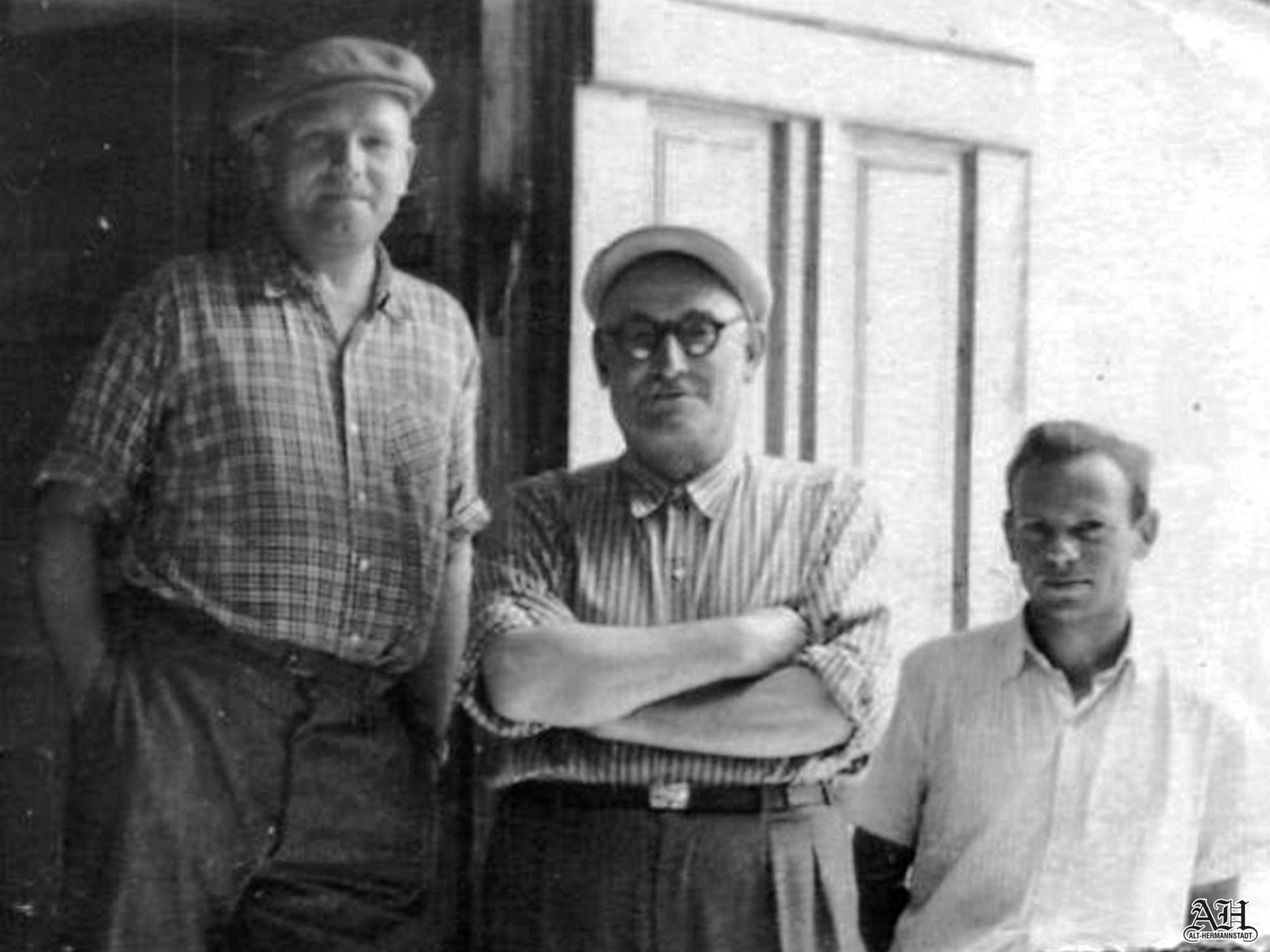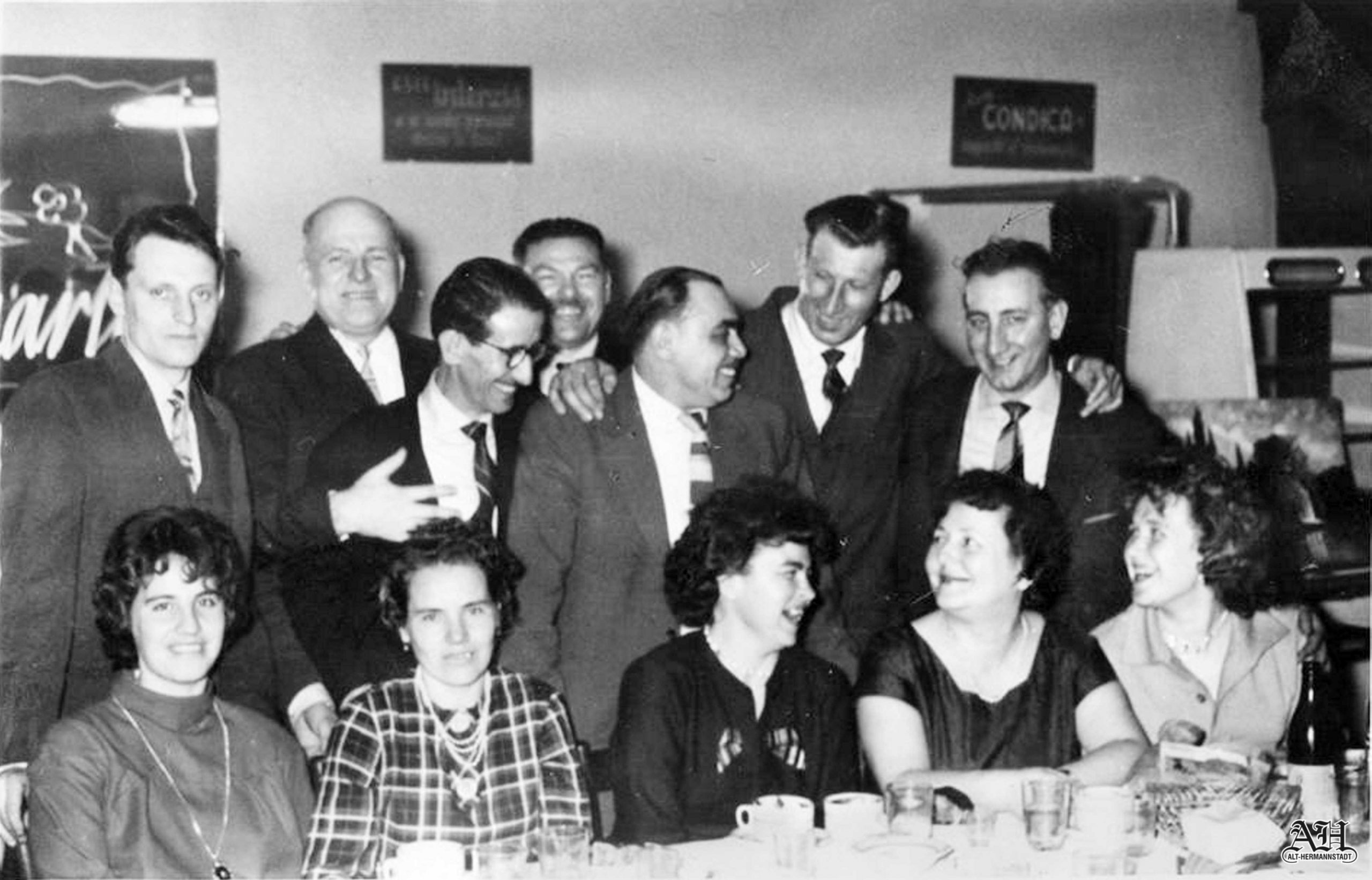 Pictori de firme din Sibiu la o petrecere organizată la restaurantul VENEȚIA 1963. În fotografie apare pictorul de firme Ladislaus Fleischer (al doilea din partea stângă) împreună soția Mathilde/ Tilli Fleischer (doamna din mijloc). În spatele Matildei stă pictorul de firme Nicolae Tălmăcean(?). Aceste 5 fotografii alb-negru din arhiva familiei Fleischer au fost puse la dispoziție de verișoara Alice, fiica unchiului meu Latzi bácsi!