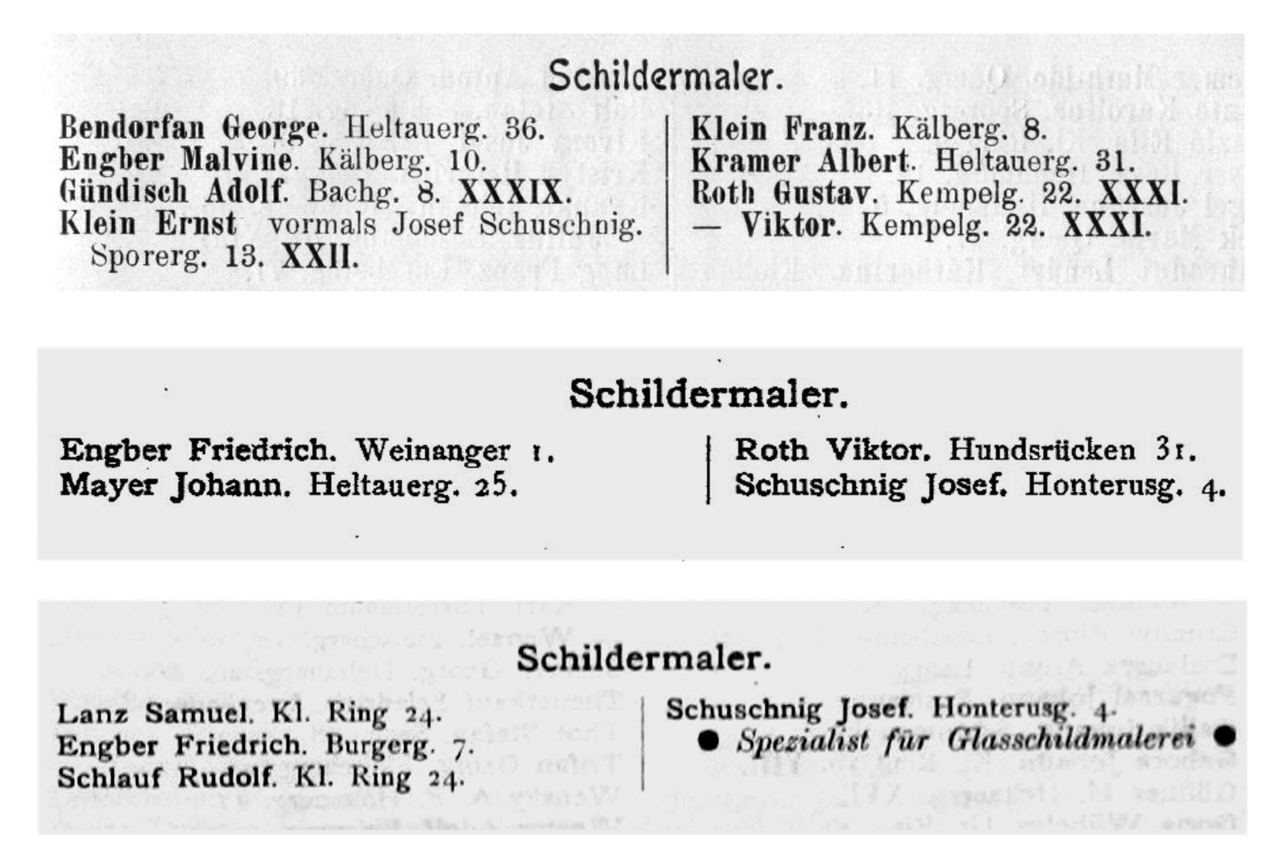 Materiale/ tehnologii // Materialien/ Technologien || Majoritatea reclamelor montate pe fațadele clădirilor, deasupra magazinelor (firme) sau pe pereții laterali (laterale) erau confecționate din placi de sticlă montate într-o ramă de lemn sau din panouri de tablă. Panourile reclamelor noi și vechi au fost livrate în atelier unde au fost vopsite în poziție orizontală, culcate pe șipci lungi așezate pe două capre/ bocuri din lemn (bocuri = Böcke). Se aplicau două straturi de vopsea pe bază de ulei de în cu o pensula rotundă cu păr lung, la un interval de uscare de 24 de ore. Al doilea strat de vopsea era prelucrat/ finisat/ netezit cu așa-numitul „Vertreiber”, o pensulă lată cu păr moale folosită pentru netezirea perfectă a stratului de vopsea proaspăt aplicat. Caprele și șipcile din lemn erau folosite ca suport la diferite procese de lucru, dar mai ales pentru a fixa/ sprijini rama din lemn lunga de 4 m, pe care se poziționau reclamele formate din mai multe placi de sticlă, pregătite pentru inscripționare (vezi fotografia alb-negru).