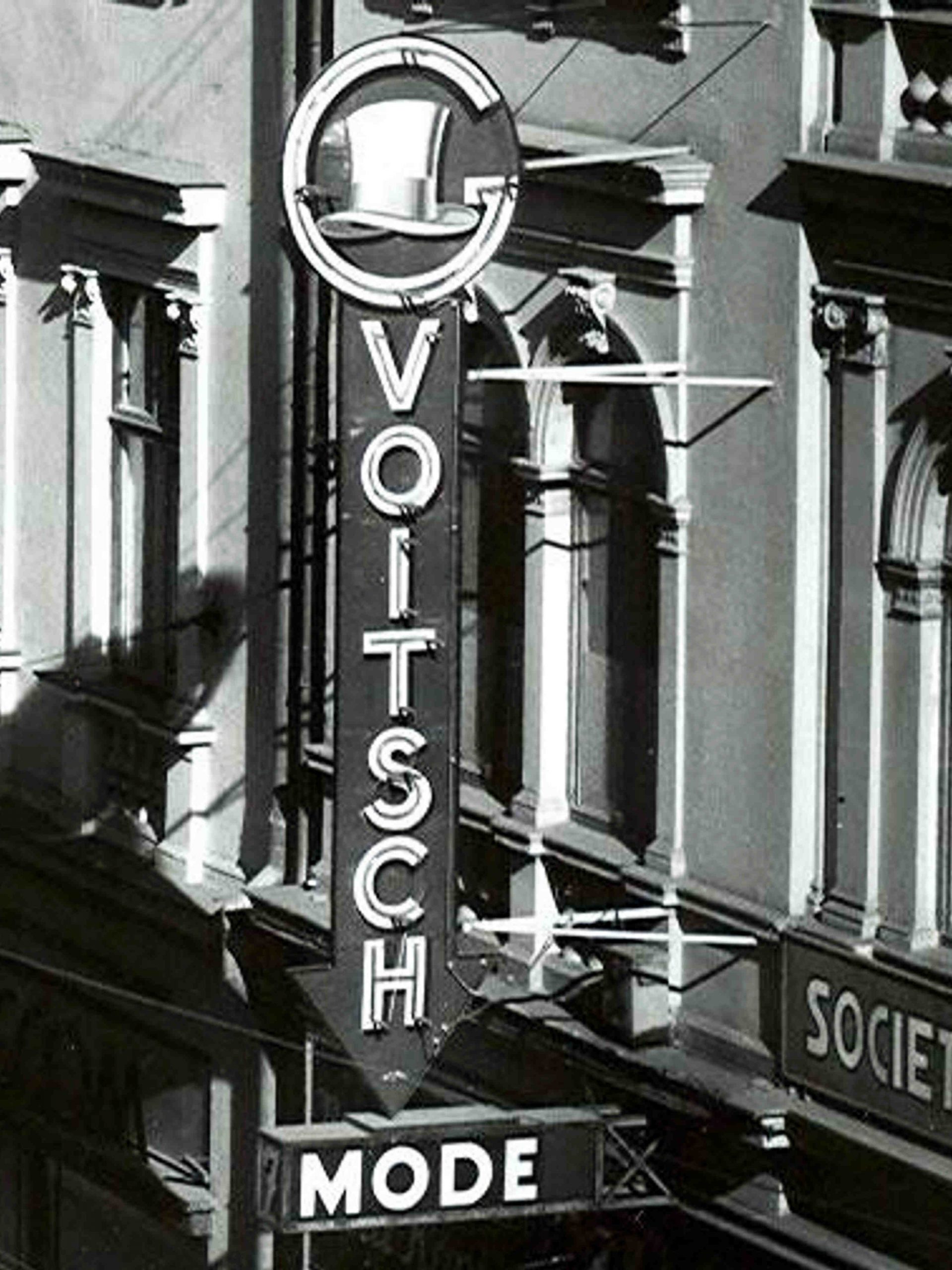 În fotografia alb-negru se vede reclama cu litere luminata cu tuburi de neon de la magazinul de modă și pălării de barbați, deschis de Paul Gvoitsch 1932 la parterul clădirii str. N. Bălcescu 5 (Heltauergasse).