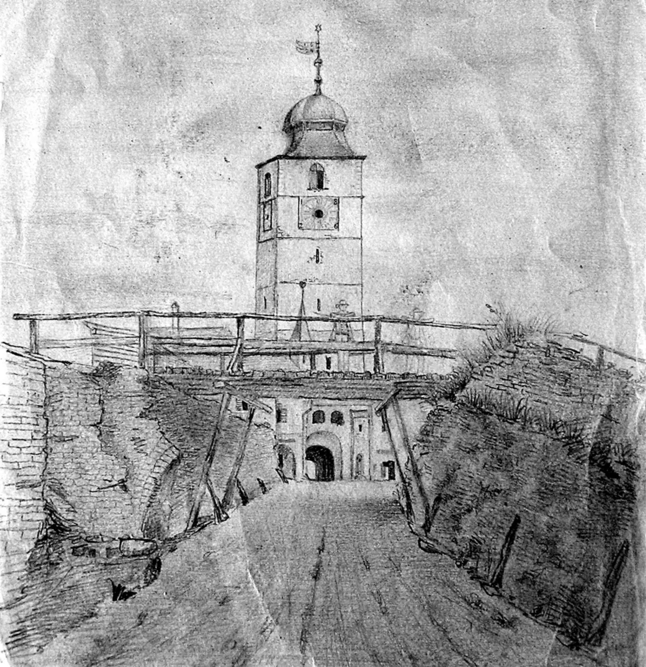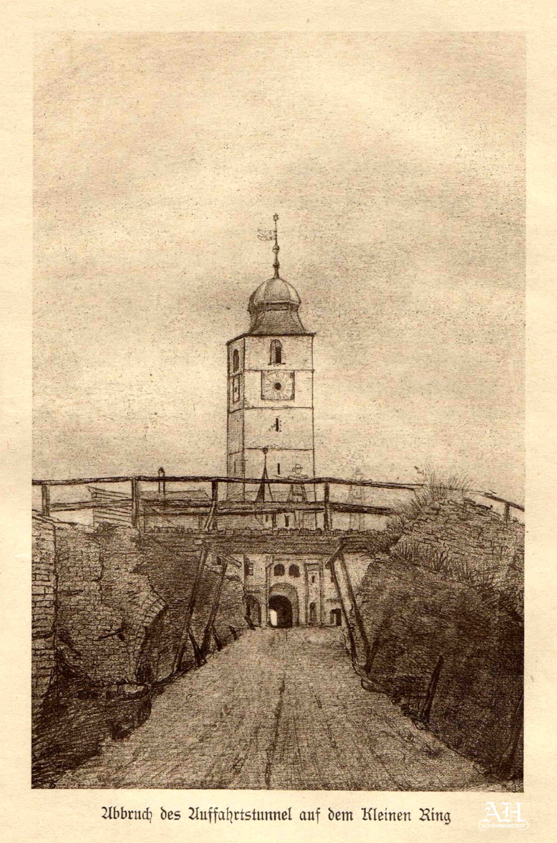 Textul explicativ pentru ilustrația sepia din cartea lui Emil Sigerus: „Abbruch des Auffahrtstunnel auf dem Kleinen Ring 1852. Über die bereits eingeschlagenen Gewölbe des Tunnels wurde eine hölzerne Notbrücke gelegt“. // „Demolarea tunelului din Piața Mică în 1852. Peste bolțile deja demolate ale tunelului s-a construit un pod provizoriu din lemn”.