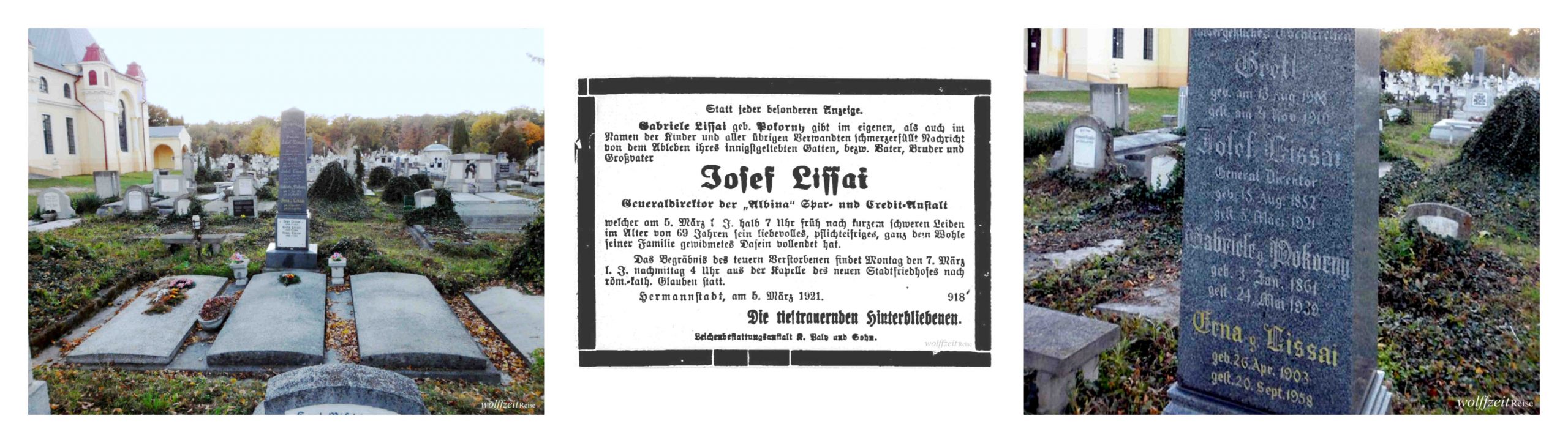 Gabriele Lissai născută Pokorny anunță cu adâncă durere, în nume propriu precum și în numele copiilor și al tuturor celorlalte rude, stingerea din viață a soțului ei iubit, resp. tată, frate și bunic Josef Lissai – Director general al Institutului de credit și de economii „Albina” – decedat în 5 martie, a.c. ora 6 jumătate dimineața după o scurtă și grea suferință, la vârsta de 69 de ani, după o viață dedicată în întregime bunăstării familiei sale. Înmormântarea vor avea loc luni, 7 martie a.c. ora 4 după-amiază după credința romano-catolică din capela noului cimitir al orașului. ~ Sibiu, 5 martie 1921. / Familia adânc îndurerata. / Institutul funerar K. Pály și Fiu.” (traducerea anunțului de deces publicat în ziarul Siebenbürgisch-Deutsches Tageblatt din 6 martie 1921)