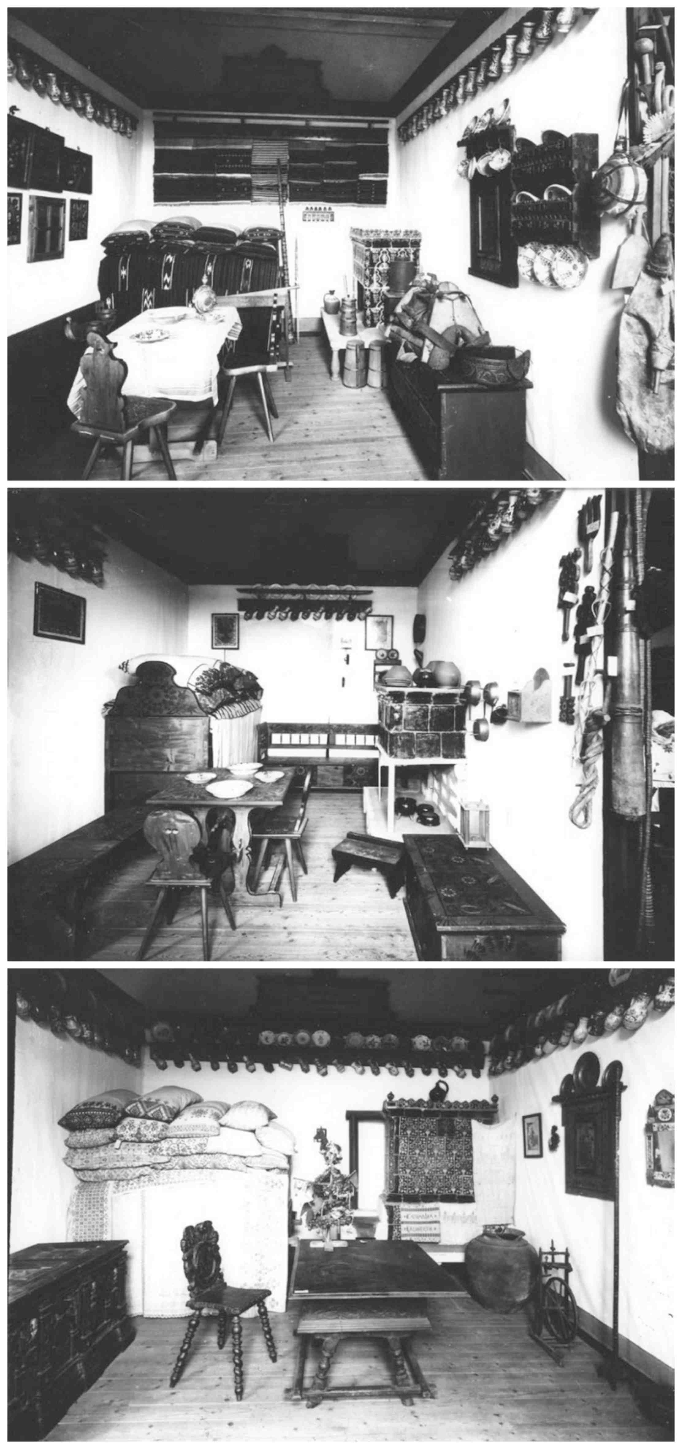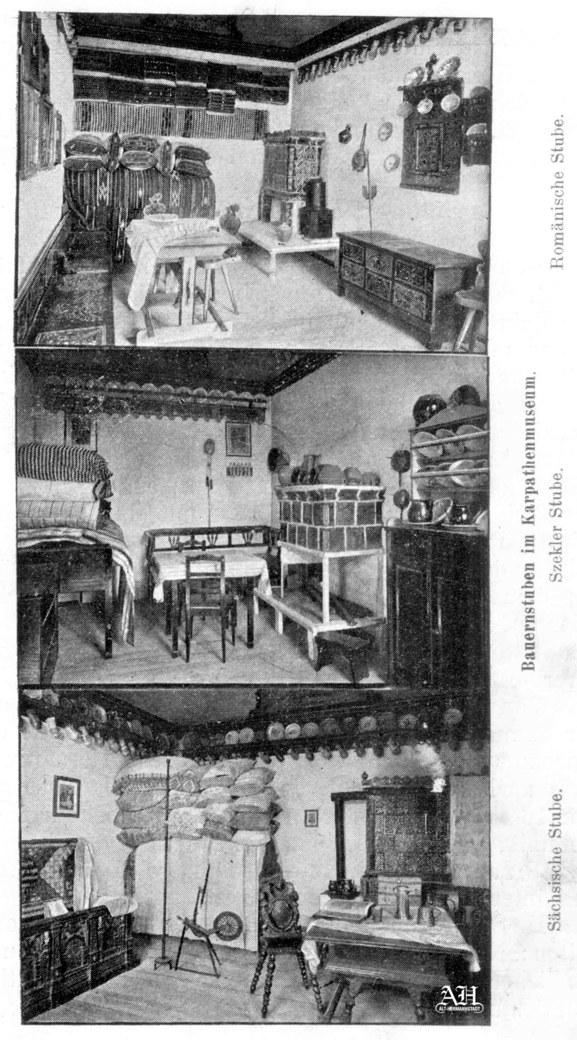 Trei interioare din Karpathenmuzeum/S.K.V/ // Muzeul Carpatin/S.K.V. înființat de Emil Sigerus 1885: „Romänische Stube ~ Szekler Stube ~ Sächsische Stube“.