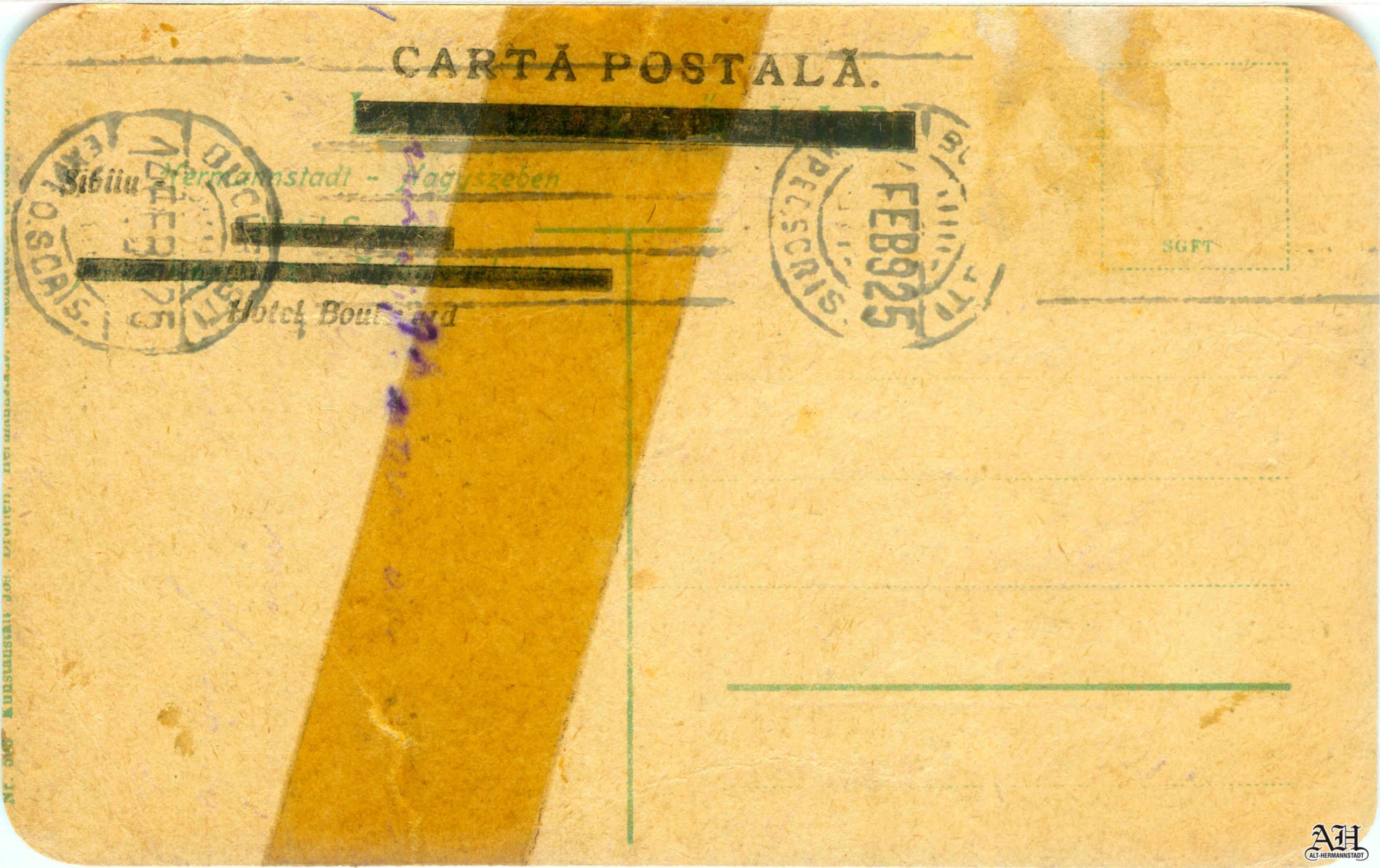 Carte poștală tip LEVELEZÖ-LAP – circulată 1925, tipărită la Institulul tipografic sibian „Kunstanstalt Jos. Drotleff, Hermannstadt“.