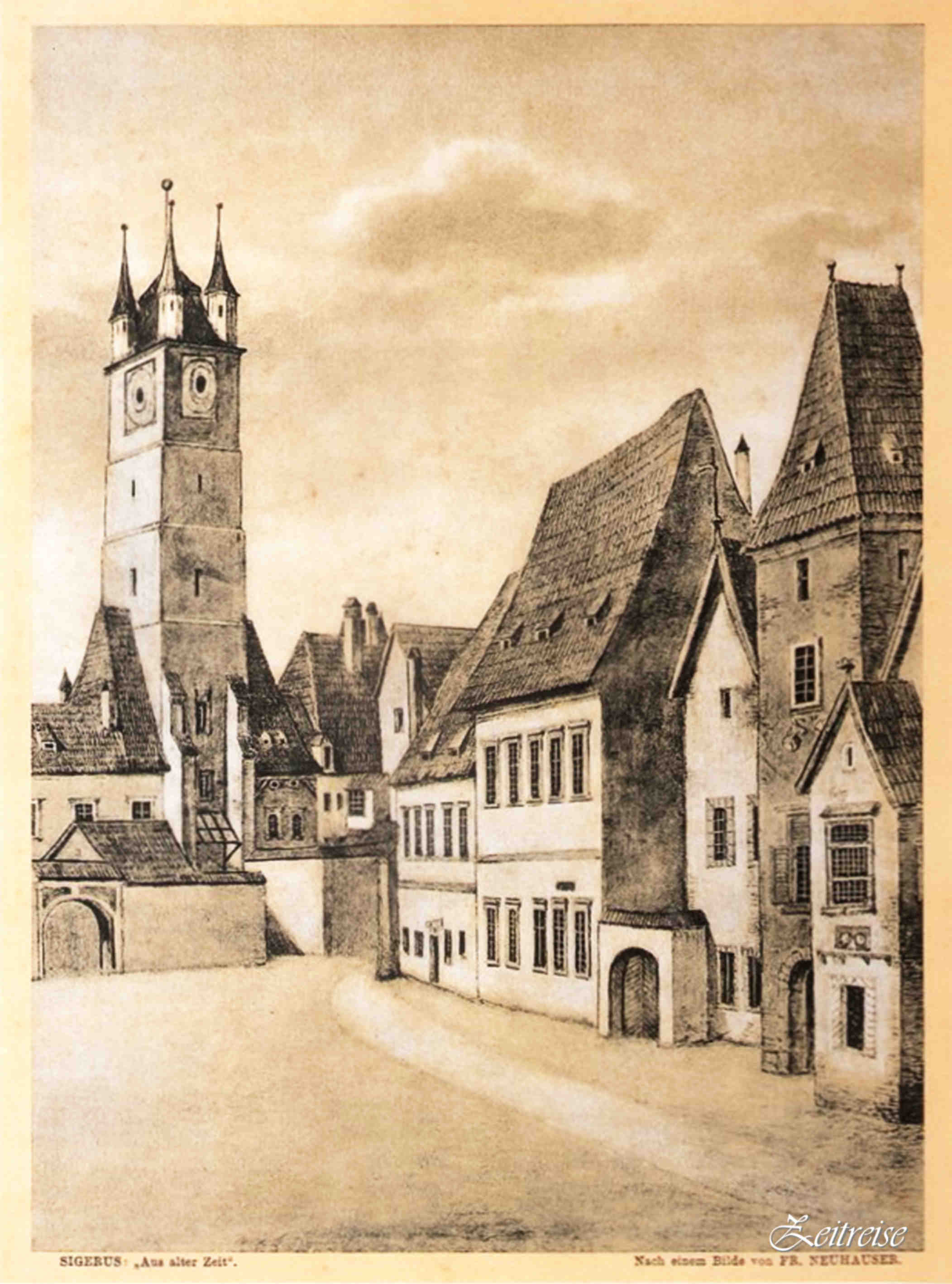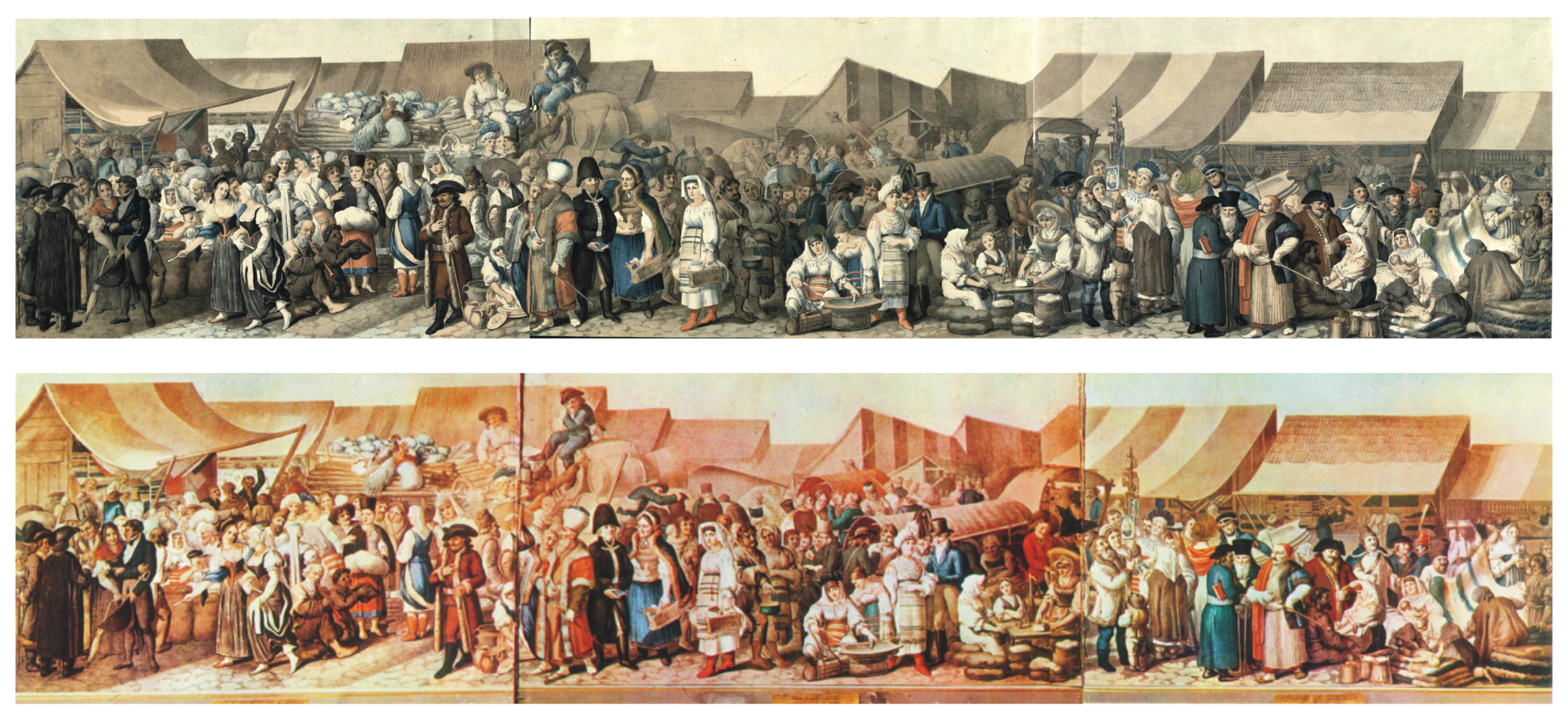 Iarmaroc în Sibiu! Neuhauser ni-l lasă zugrăvit în detaliu, document peste ani pentru istoric, pentru antropolog sau pentru bucuria simplă a omului. Lanczedelly după cîţiva zeci de ani, probabil impresionat, copiază pictura lui Nuehasuer, dar o prezintă în tonuri de gri şi alb, redîndu-i prospeţimea şi punînd în evidenţă personaje şi scene. S-ar putea scrie pagini întregi aici despre atmosfera, straiul, mîncarea, viaţa locuitorilor cetăţii: atît de multe neamuri la un loc şi totuşi în armonie, împreună, căci asta era frumuseţea şi pitorescul cetăţii.