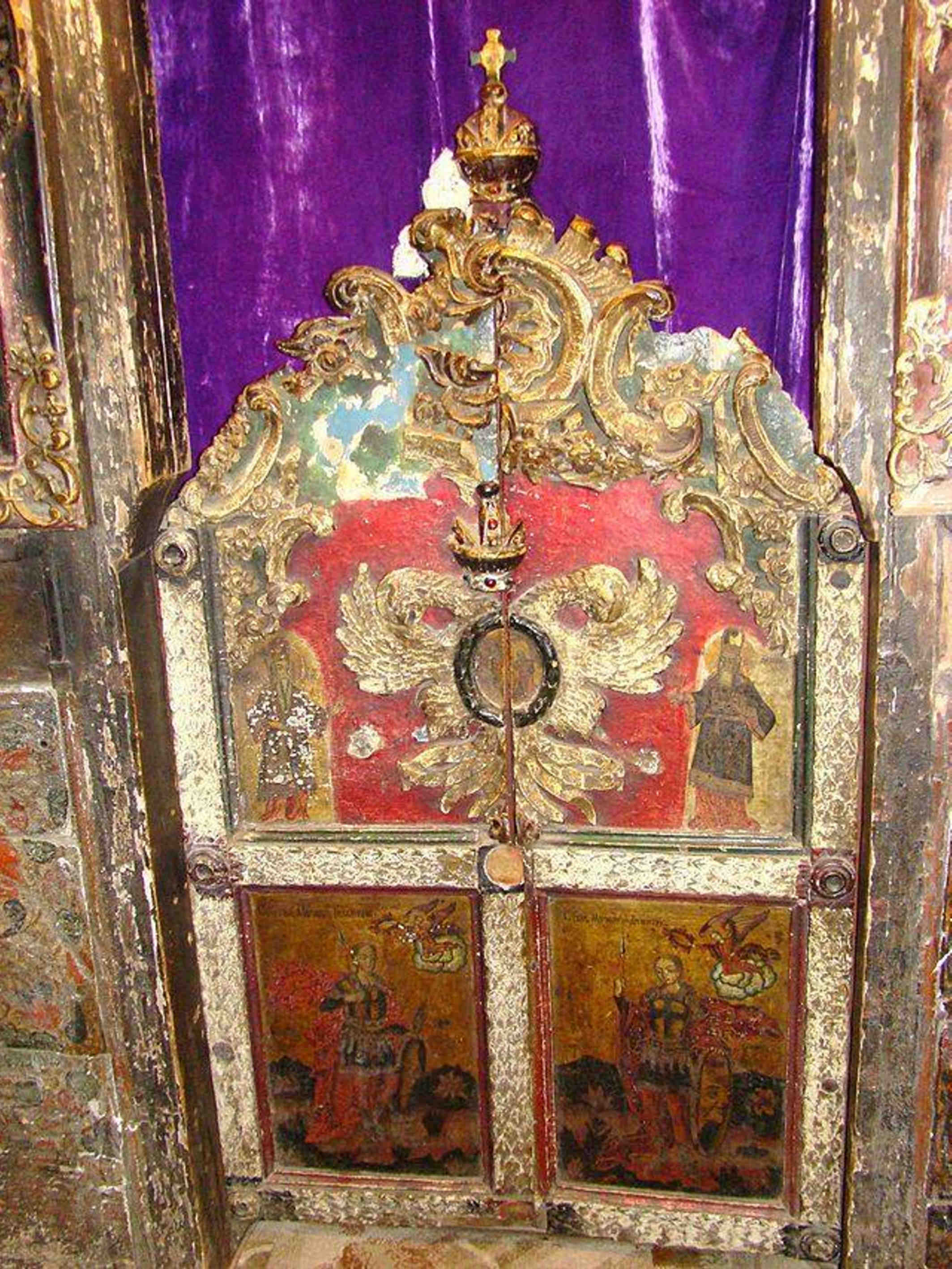 Icoanele vechi pe lemn ori pe sticlă, în ocru şi roşu coral, înnegrit de timp şi de lumînări, nu şi-au pierdut nimic din curăţenia şi frumuseţea zugrăvelii. Poarta altarului, în lemn aurit, mîngîiată de lumină, pare însăşi poartă intrării în Raiul făgăduit.