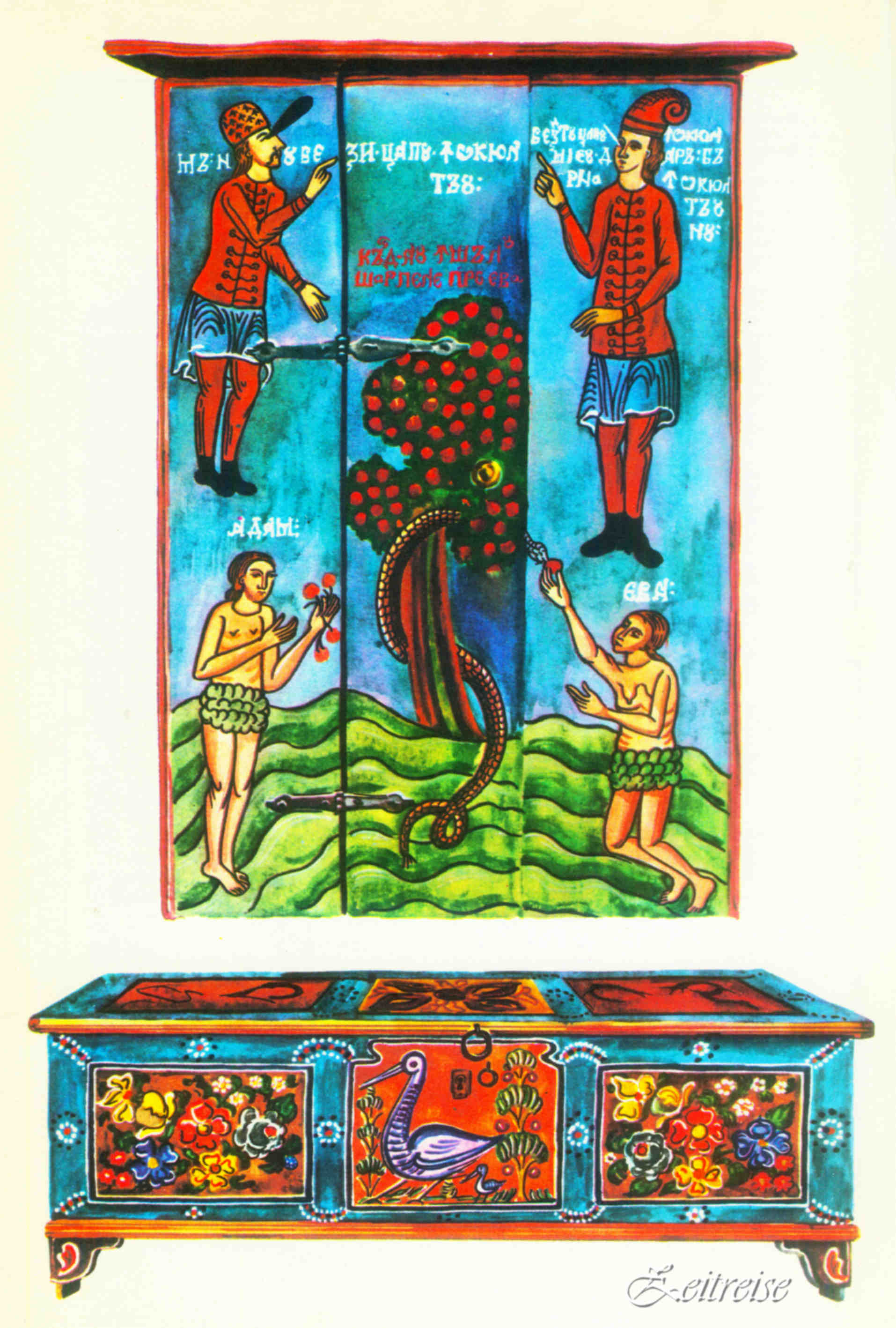 (sus) Colțar – sec. al XVIII-lea cu inscripția chirilică: „Mă, nu vezi tu țapul în ochiul tău? Vezi tu țapul în ochiul mieu, dar bîrna în ochilul tău nu.“ – „Cînd au înșelat șarpele pre Eva“ – „Adam Eva“