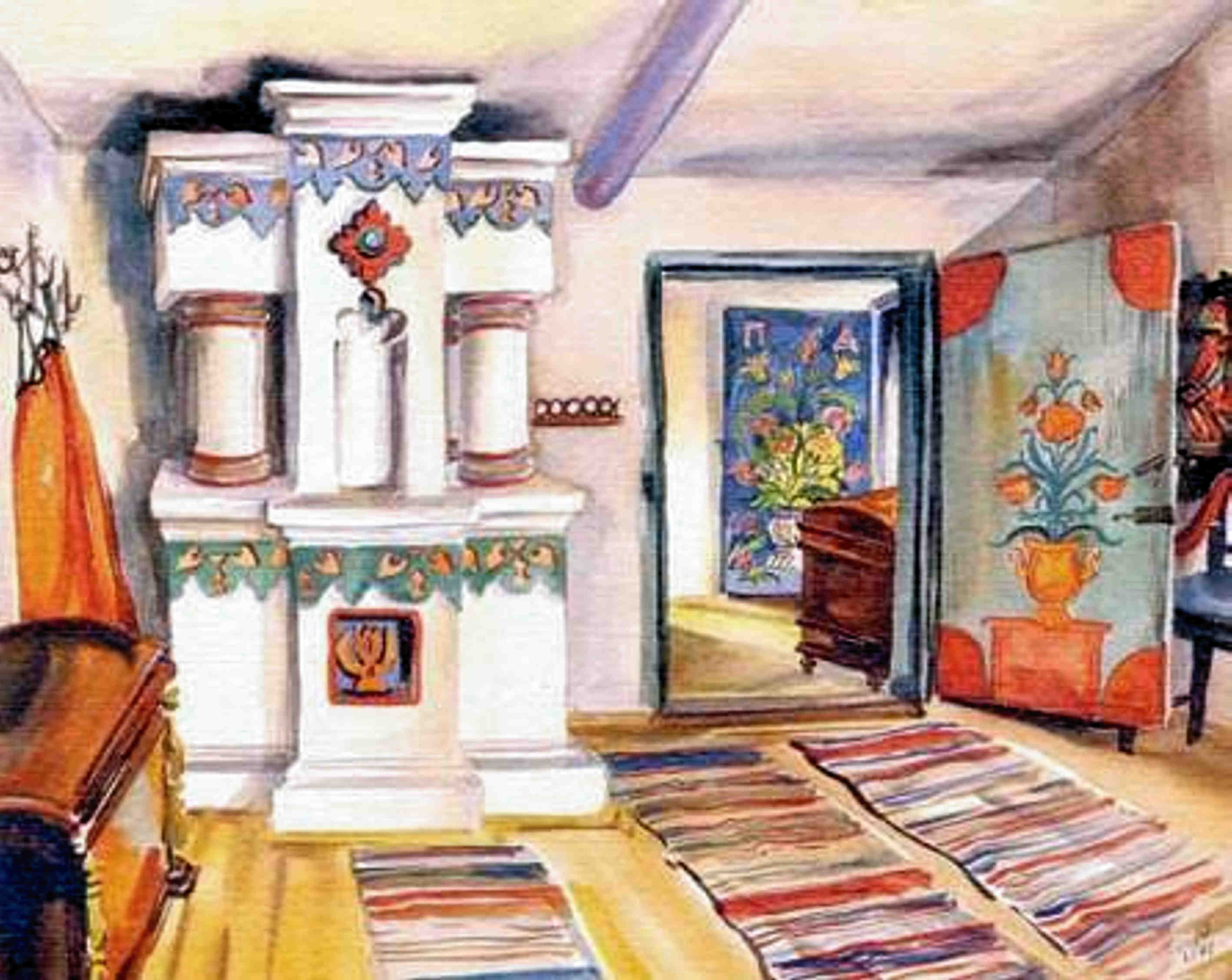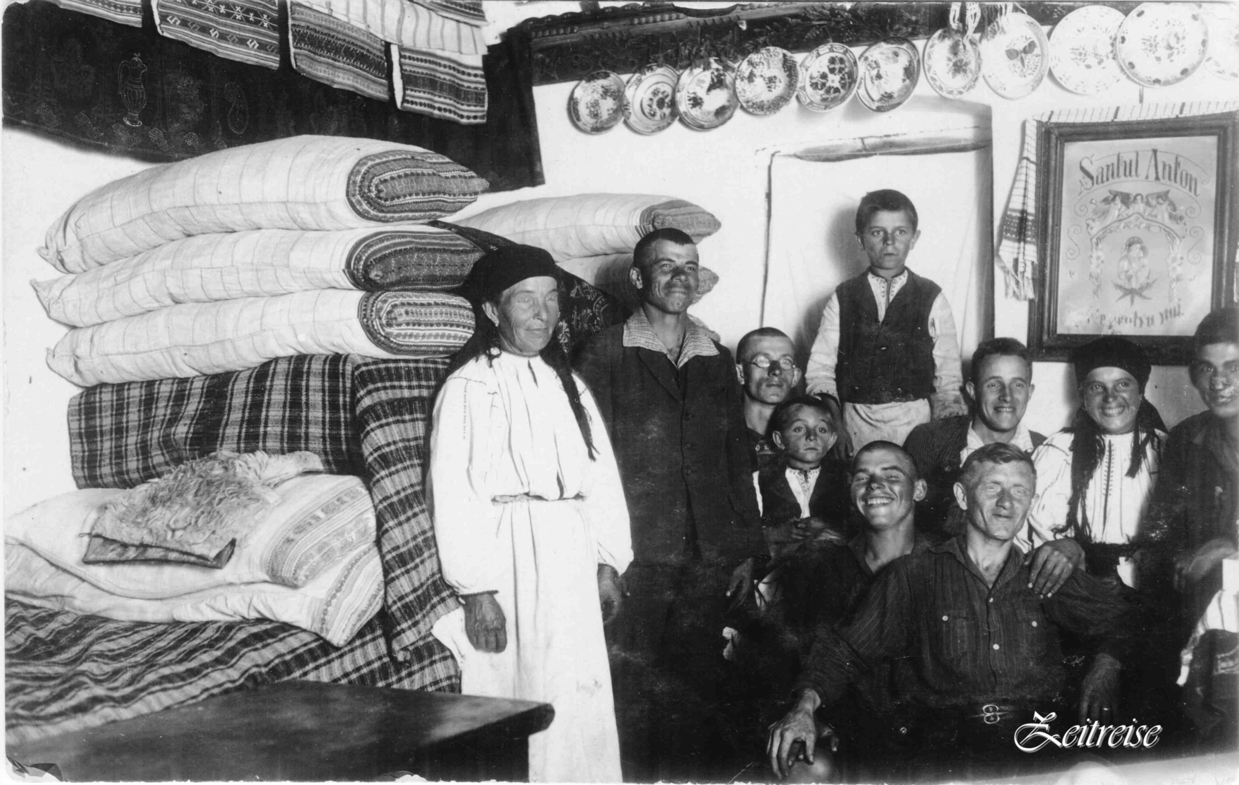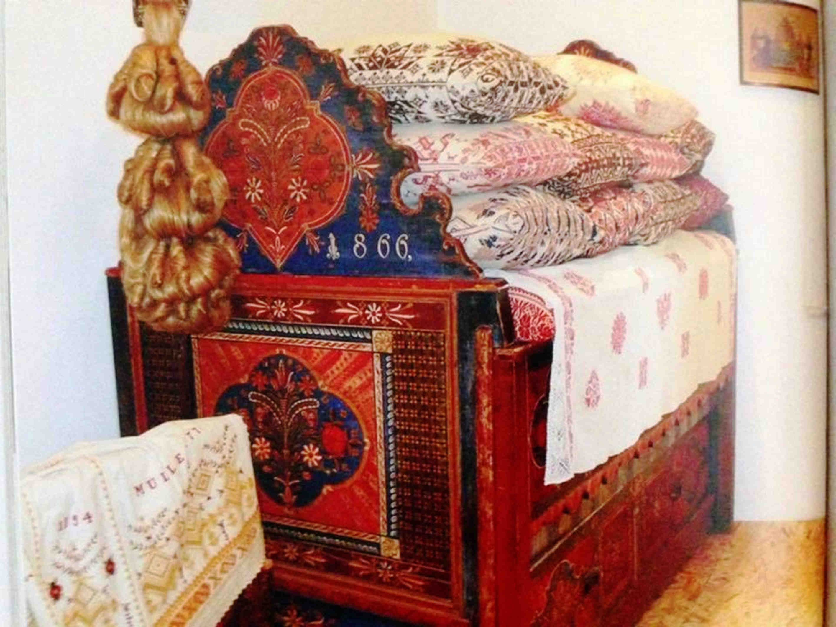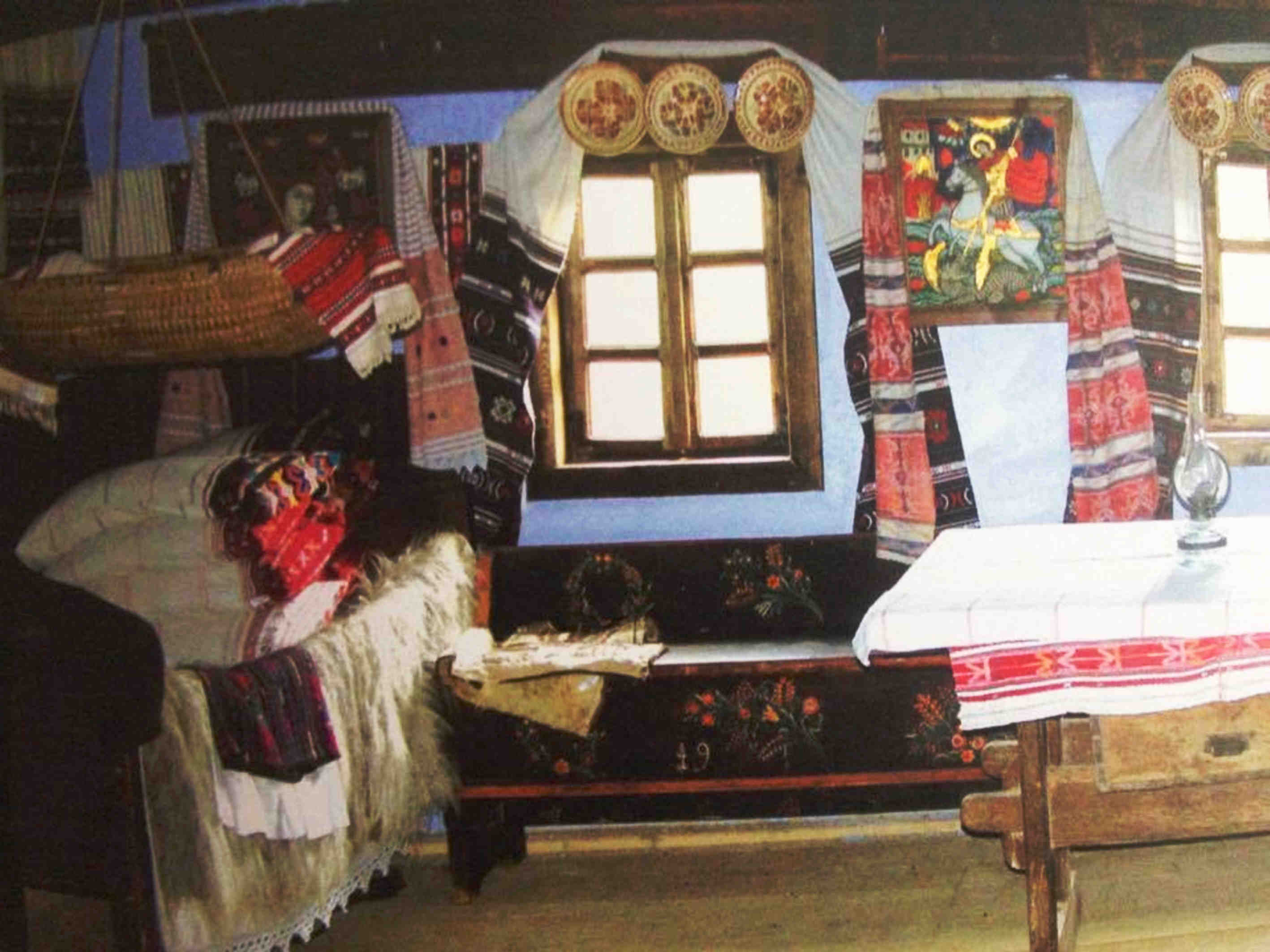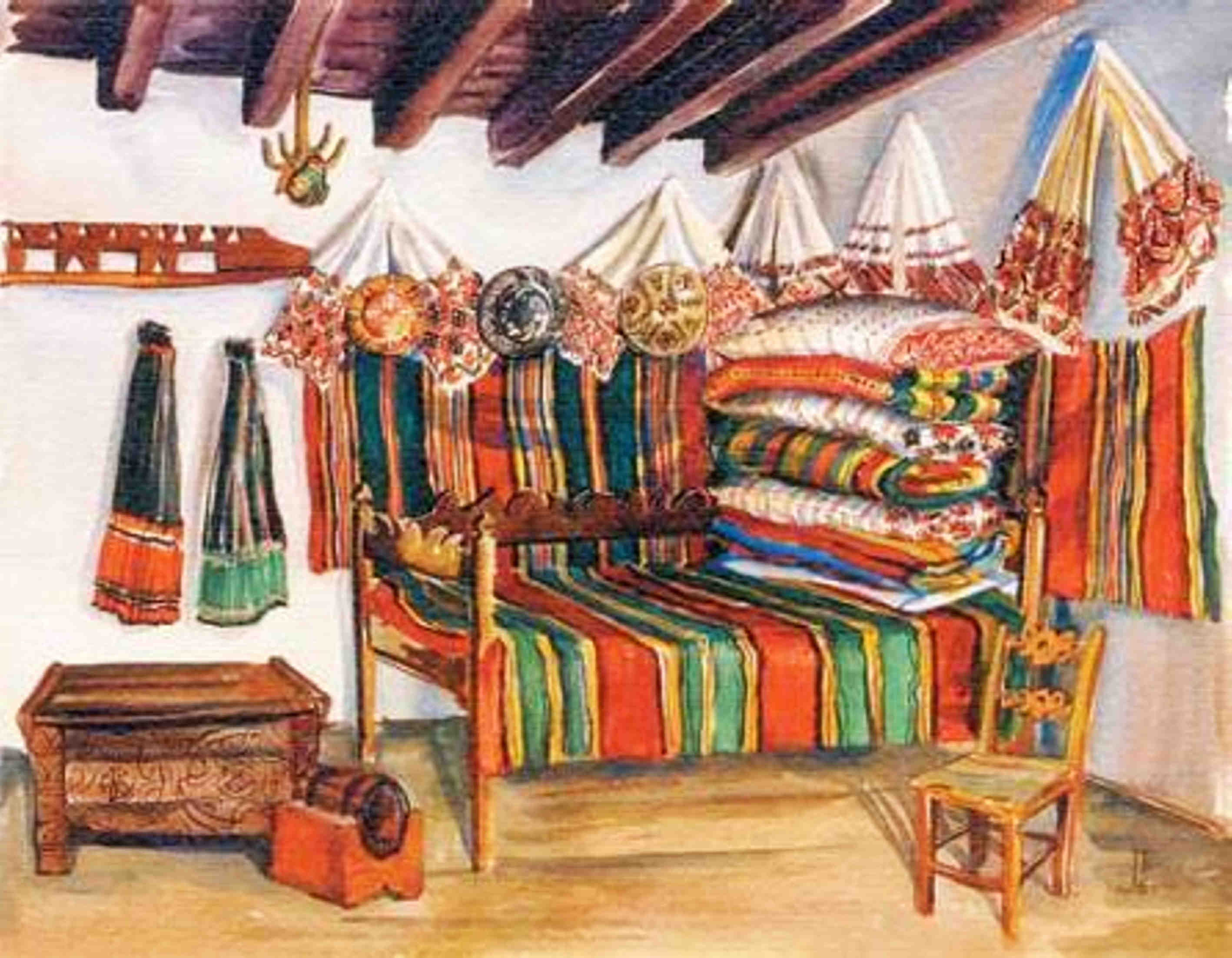 Perete de flori cu alesătură stau pernele aşezate, velinţe ţesute-n culori, tăblia-i de lemn de nuc uscat în bătătură, iată patul clădit! Înşirate stau farfurii şi ştergare. mîna olarului le-a mîngîiat cu lut şi încondeiat cu viaţa din jurul lui: pomi şi flori. Ștergare de pinză ţesute în casă fac aripi de ingeri la icoane si veghează casa şi om. De intrai în casa românului sau în casa sasului, frumuseţea aceasta simplă te aştepta în fiecare loc, în fiecare ungher. Meşteşugite în casă, în şezatoare, în sudoare, în cintec, în visare, iată frumuseţea sufletului cuprinsă în tot ce mîna meşterului atinge.