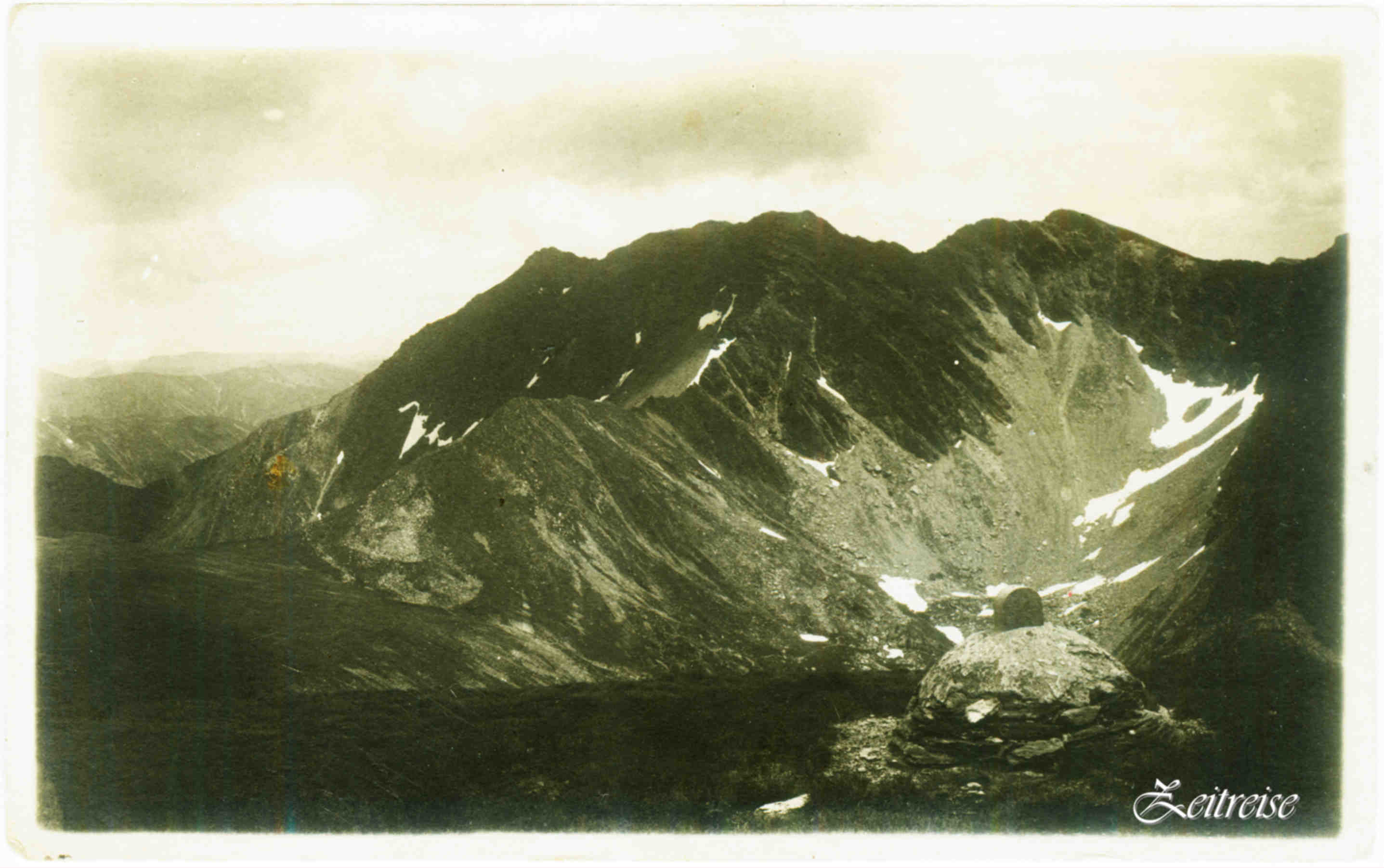 Traseu de creastă – Munţii Făgăraş 1925 – și o povestea în poveste cuprinsă, imagine în imagine prinsă! Fotografie(tablou) pe perete într-o cabană si Cartea Postală: Vârful Ciortea // Hohe Scharte // Csortea-csúcs, văzut de pe Bodislav (Carte Poșală circulată 1926 – Fotografie J. Fischer)