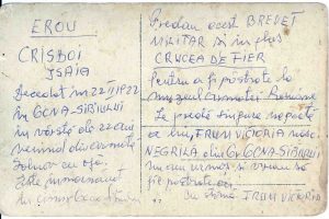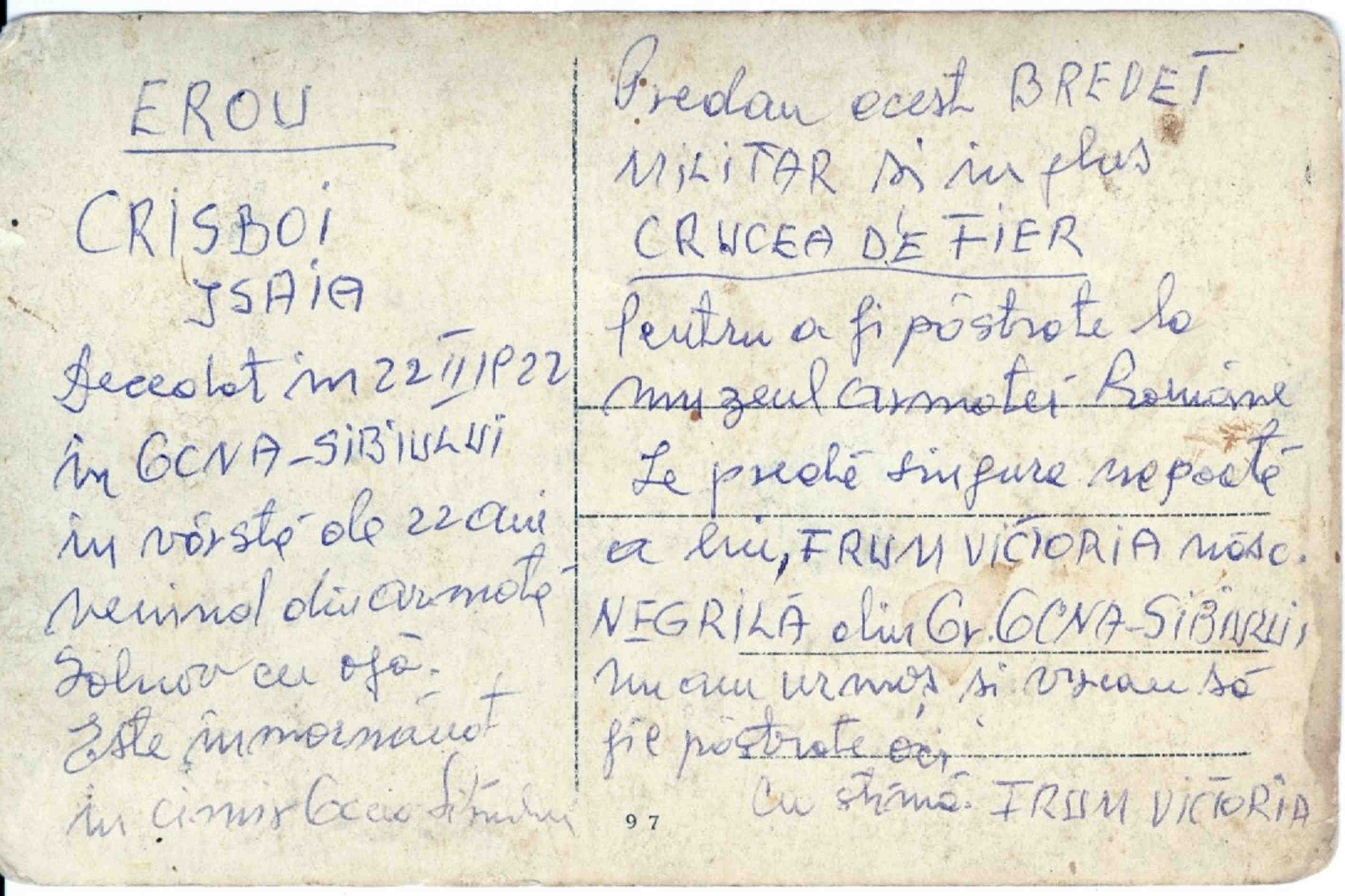 „Povestea Eroului Isaia Crisboi – Eroul Isaia Crisboi a luptat în Primul Război Mondial în armata austroungară . El a decedat in 22 februarie 1922, în Ocna Sibiului, în varstă de numai 22 ani. Se intorsese din armată foarte bolnav fiind în cele din urmă răpus de boală. Brevetul militar și Crucea de fier au fost predate pentru a fi păstrate la Muzeul Armatei Române, de singura nepoată a lui, Victoria Frum (născută Negrilă) din Ocna Sibiului, care a spus: „Nu am urmași și vreau să fie păstrate aici. Cu stimă Frum Victoria“. (sursa fotografie: www.europeana.eu)