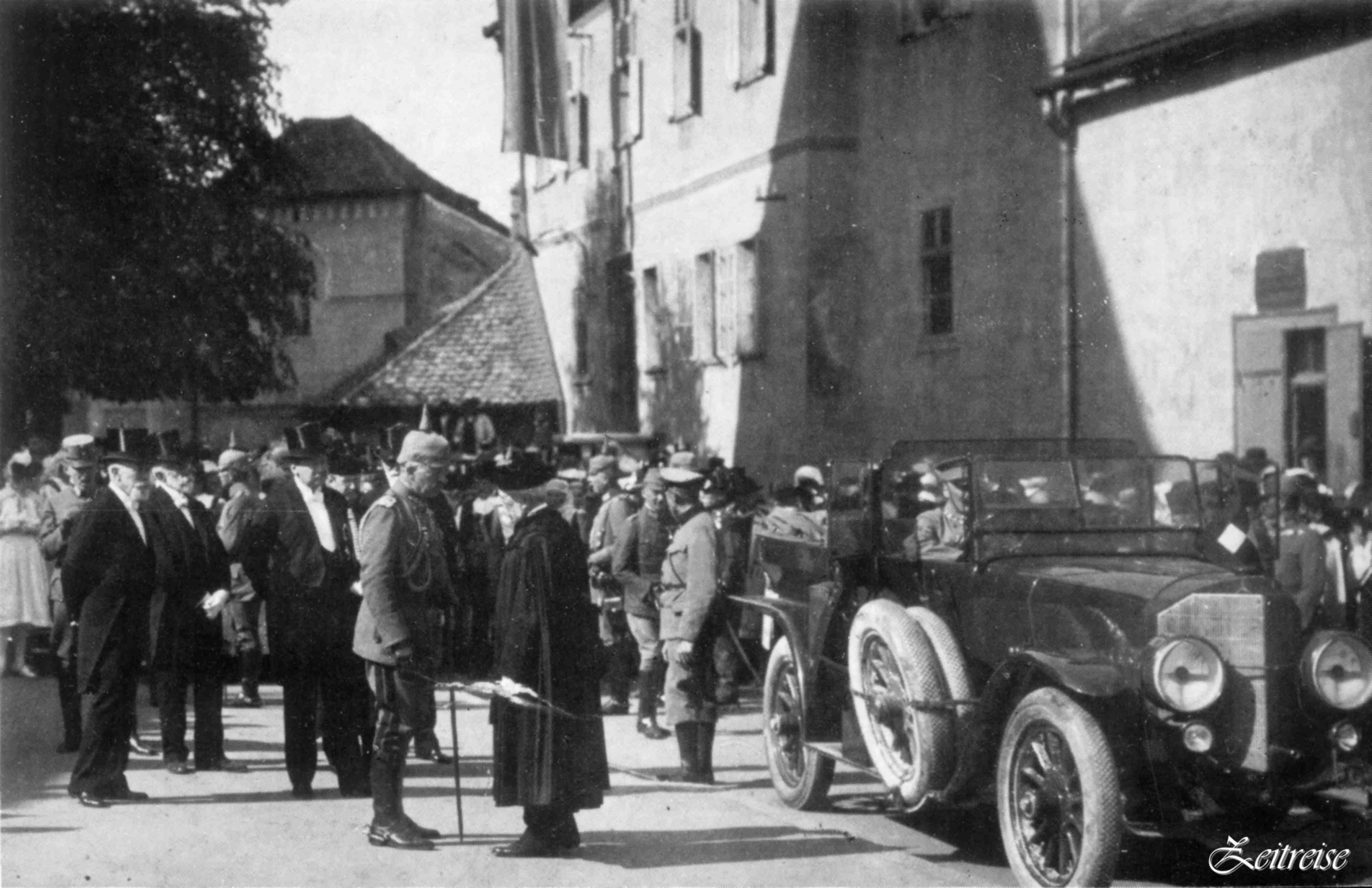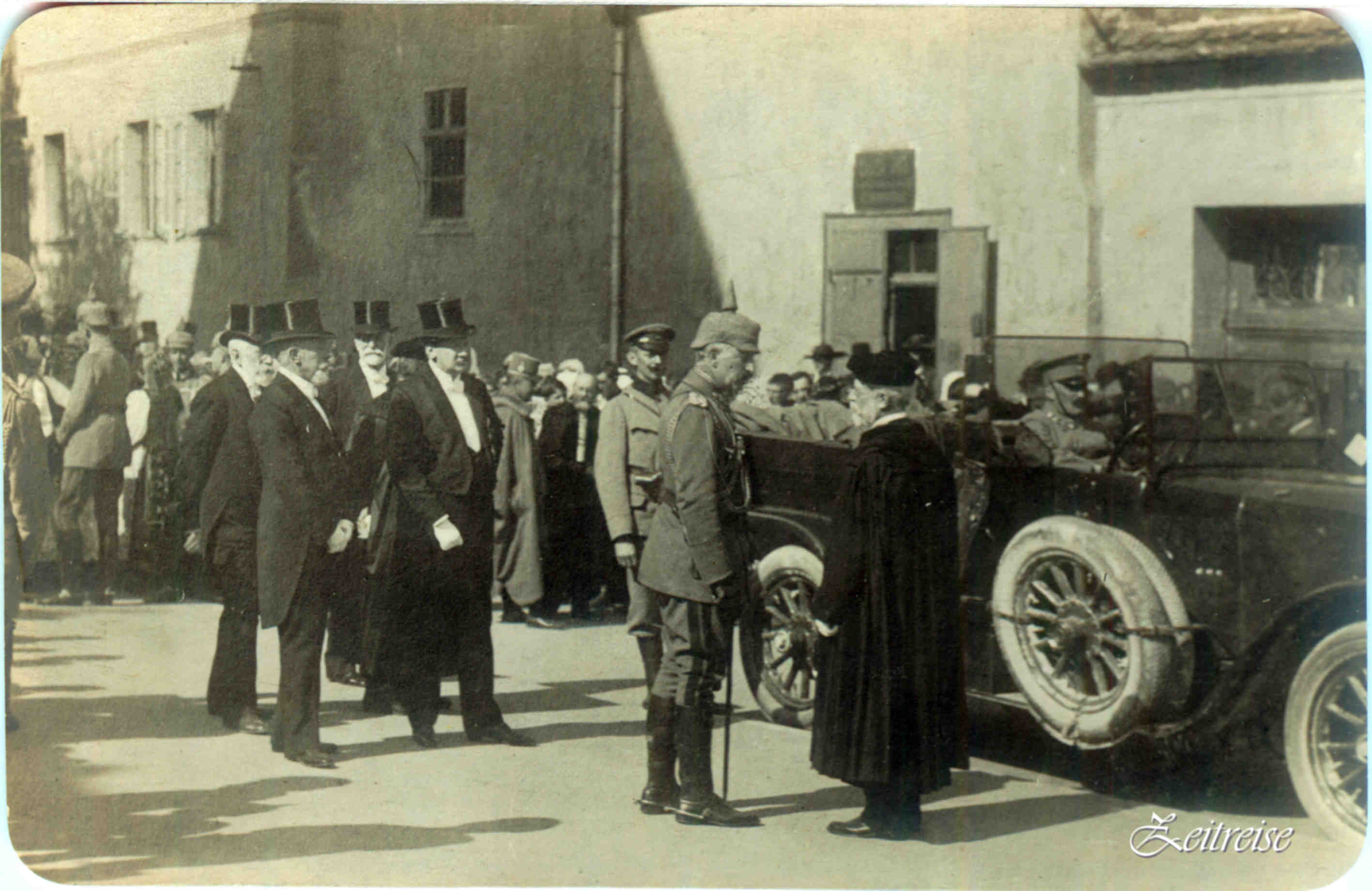 În şirul lung de vizite regale în Cetate, iată şi ultima din Imperiu: ultimul Împărat German şi Rege al Prusiei în anul 1917, Wilhelm al II-lea. Ce fotografie impresionantă! Nu numai datorită personajelor de excepţie Împăratul Wilhelm II şi episcopul Sibian Friedrich Teutsch, ci mai ales a anturajului, a vestimentaţiei. Fiind un instantaneu, povestea este fidelă realităţii istorice. Nu avem în imagine mulţimea curioşilor, poate oprită de o barieră în spate, ci doar acest detaliu: două profile de oameni puternici întreţinîndu-se şi concentraţi (hmm… oare ce şi-or fi spus, mă întreb) sub privirile serioase ale nobilului anturaj. Vă spun sincer, nu-mi pot dezlipi privirea de pe cizmele Împăratului! Maşina de război merge înainte şi noi purcedem la drum!