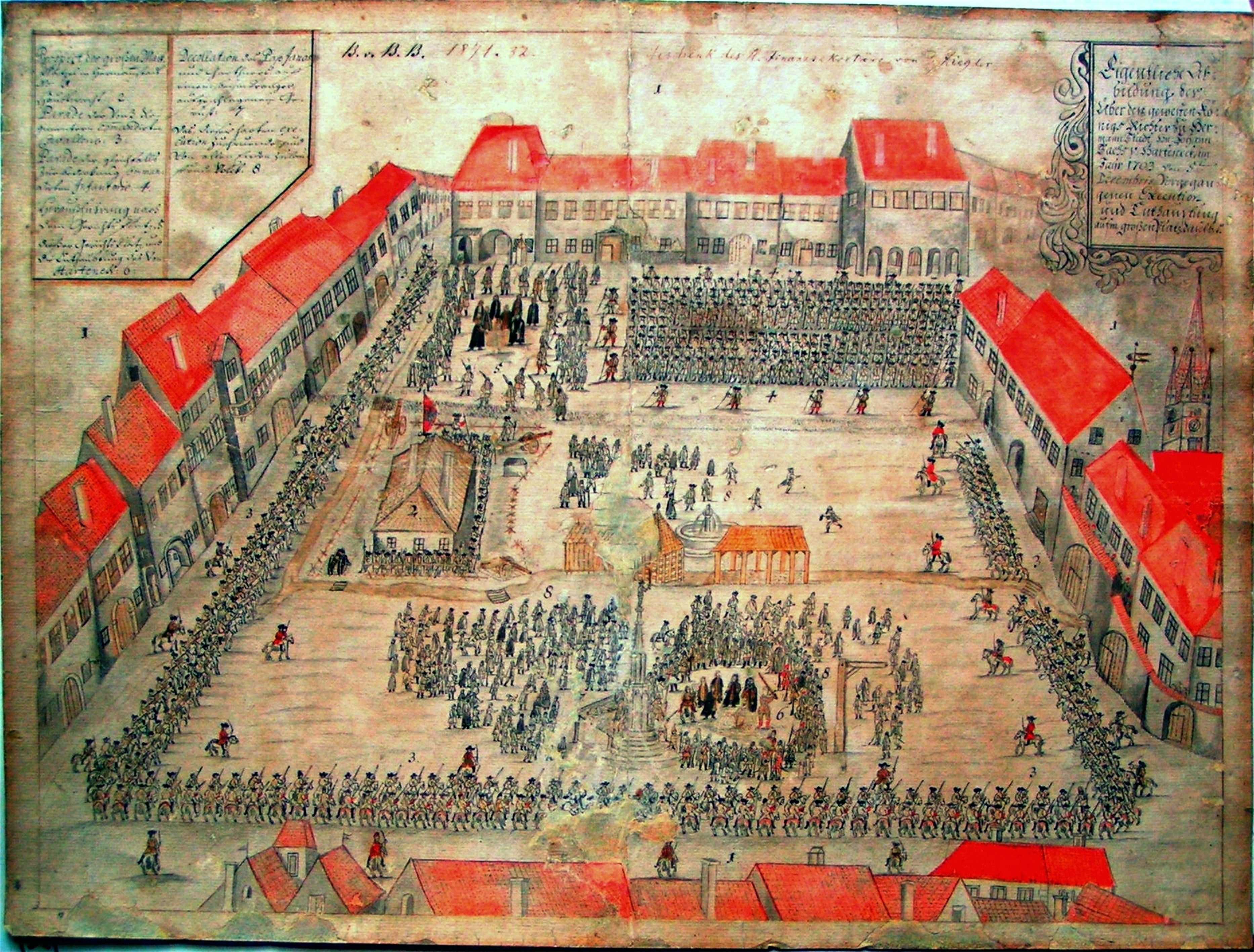 Nu-mi plac executiiile de nici un fel. Nici în viaţă nici în filme. Din păcate, istoria se desfăşoară în valuri şi azi culoarea portocalie, atît de dragă mie ,a devenit sinonimă cu execuţiile. Îmi place Evul Mediu privit din poveste, dar un Ev Mediu idealizat şi igienizat, văzut mai de departe din partea lui estetic frumoasă şi creatoare. Dar inevitabil, vorbind despre Piaţa Mare a Oraşului, trebuie să înfruntăm spectacolul execuţiilor. Harteneck (JOHANN ZABANIUS SACHS VON HARTENECK), primar, jude şi comite de poveste îşi va pierde aici capul – la propriu! Cu cîţiva ani înainte devenise nobil, primise particula „von“ pentru merite deosebite! Dar Harteneck deranjează, ca orice vizionar, ca orice spirit liber, cere dreptate şi împărţirea birurilor şi cine se atinge de „cele sfinte“ plăteşte cu propriul cap, căci Harteneck este victima unui complot şi învinuit de omucidere. Iată deci execuţia lui în Piaţa Mare aşa cum ne-a fost desenată. Acoperişurile portocalii, casele strînse una într-alta ca un zid, careul soldaţilor aliniat şi de nepătruns. Patru tunuri cu gura larg deschisă în colţul cădirii ce adăpostea (probabil) Corpul de garda şi Roland însuşi, cu sabia scoasă, tronează pe stâlpul infamiei în mijlocul pieții şi din înălţimea lui nobilă, priveşte neclintit… Sîntem în anul de graţie 1703! Fîntîna curge nestingherită, vălurind peste bazin. Desigur, ceva mai înainte femeile au spălat rufele, animalele s-au adăpat. Desigur au bătut toba şi au adus condamnatul. Nu se făcea vinovat decît de căutare de dreptate. A fost incomod, a fost scos din scenă. Capul lui s-a rostogolit în fundul sacului.
