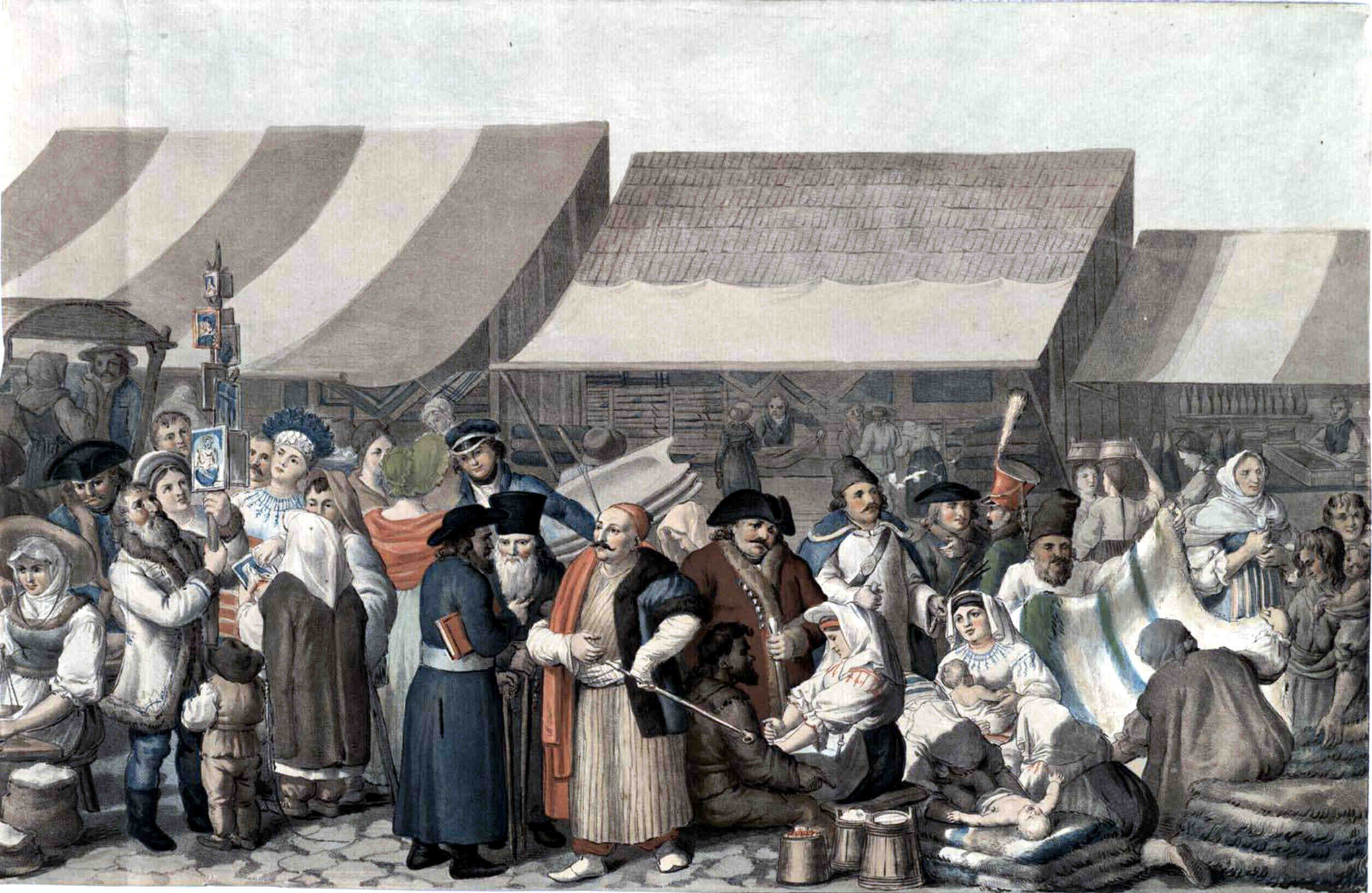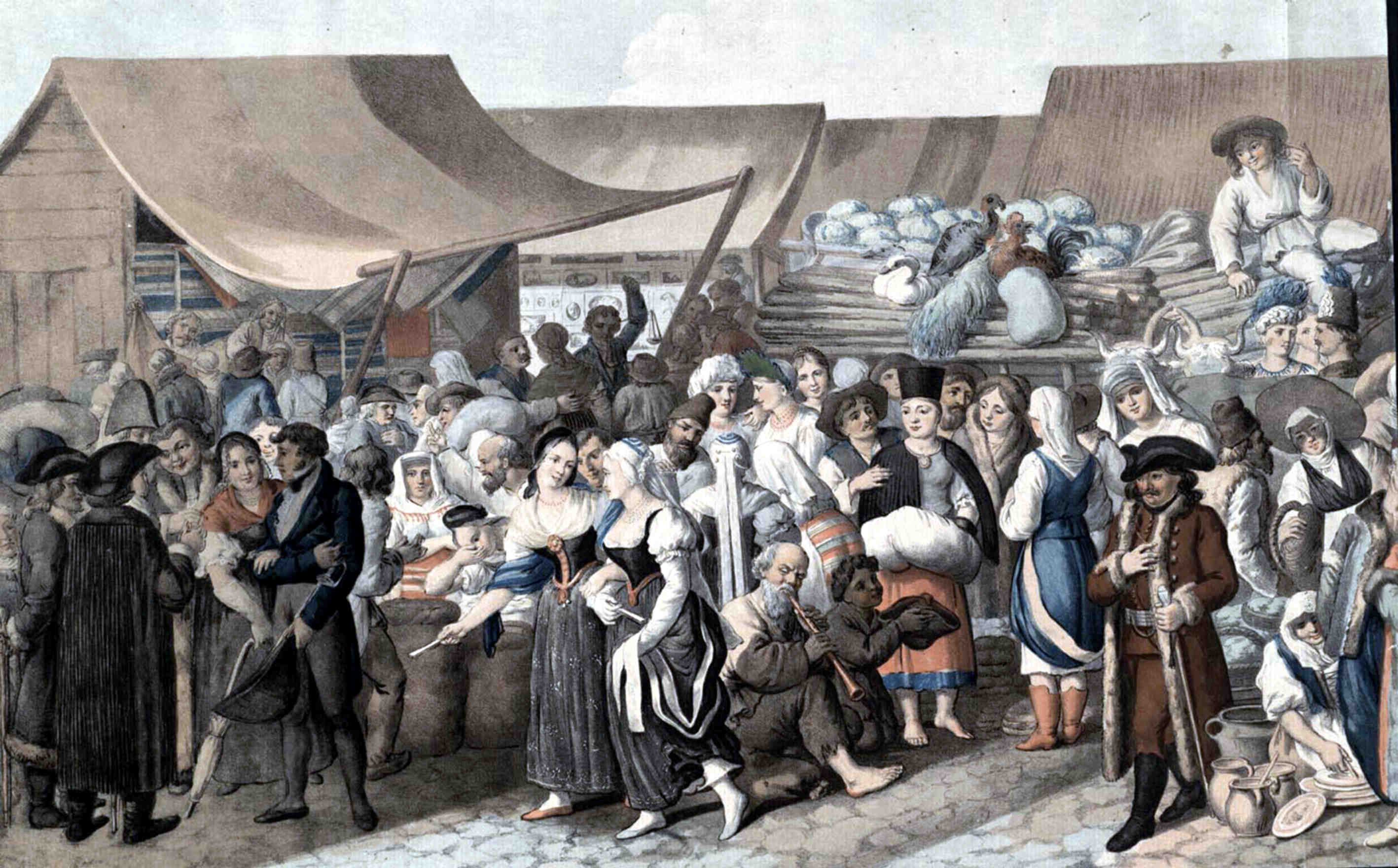 Josef Lanzedelli (1774-1832) – „Târg în Transilvania Sibiu 1818“, litografie după originalul lui Franz Neuhauser (1763-1836) – „Iarmaroc în Sibiu 1788“ (sursă foto: Wikimedia Commons)