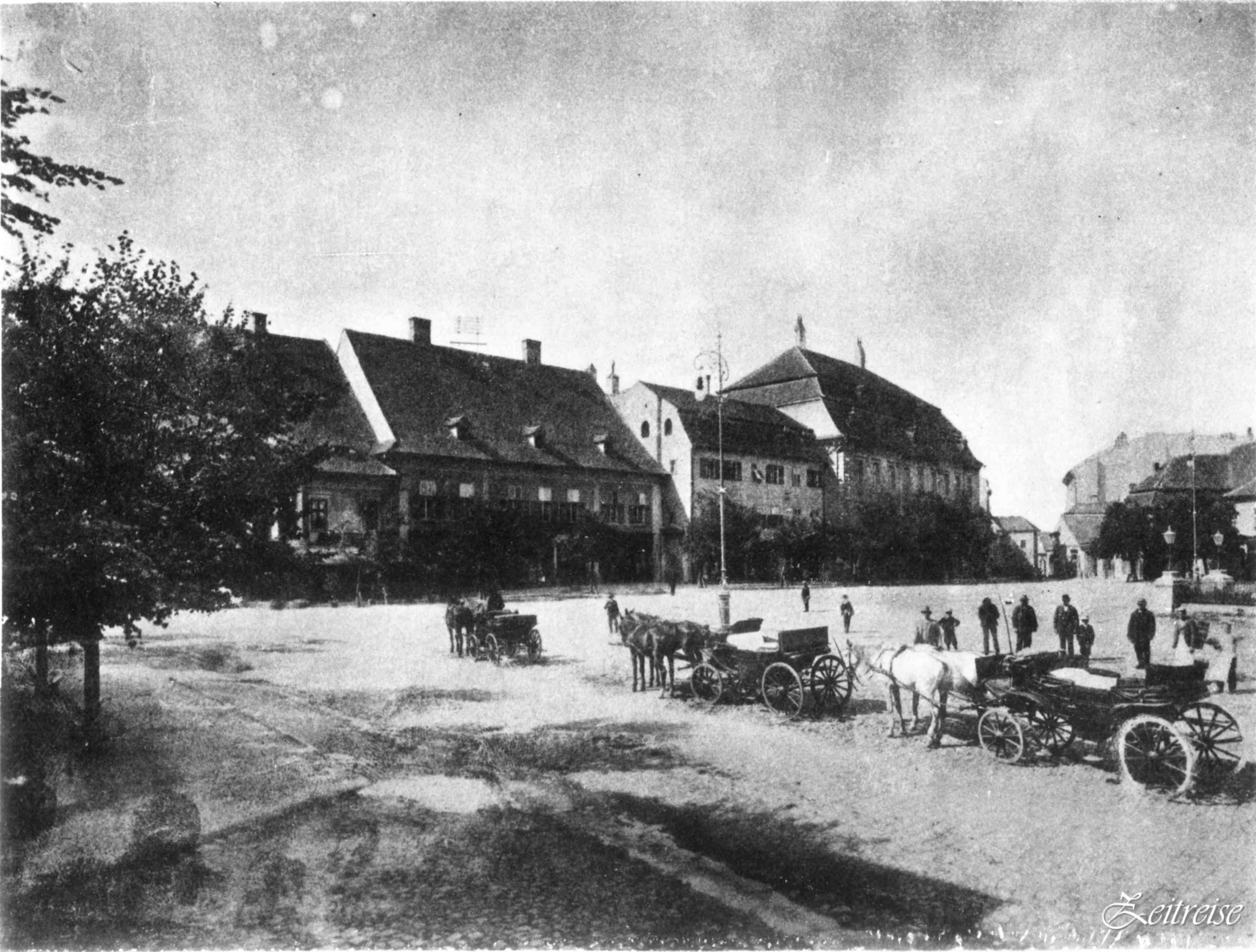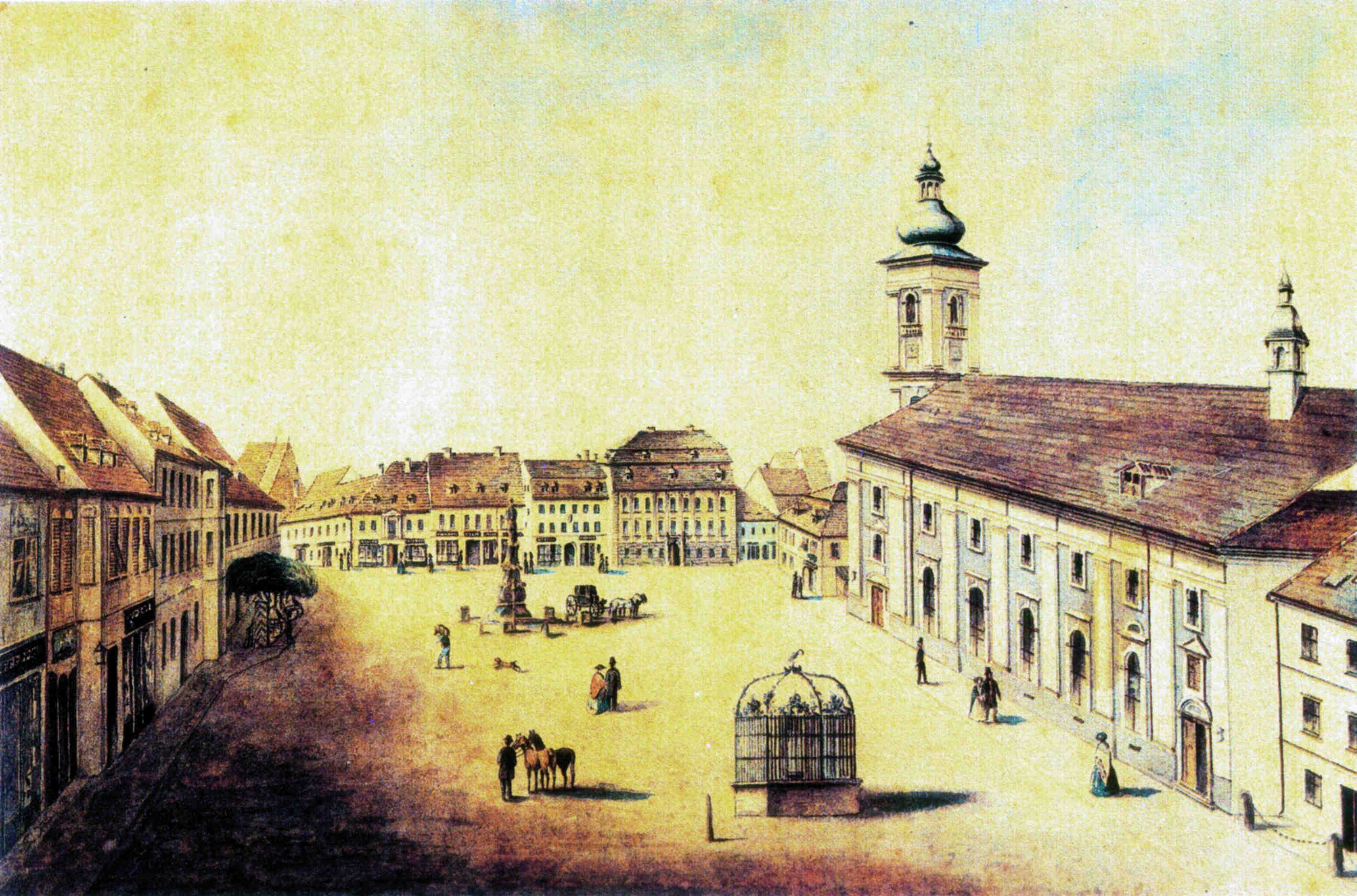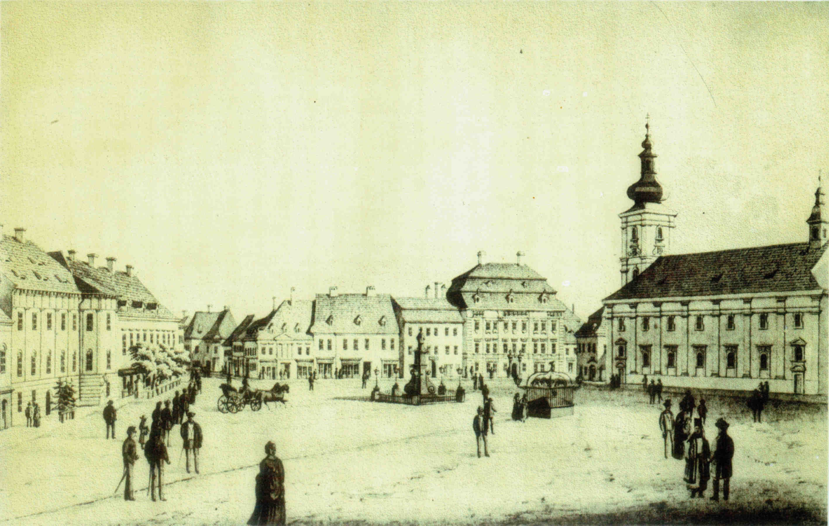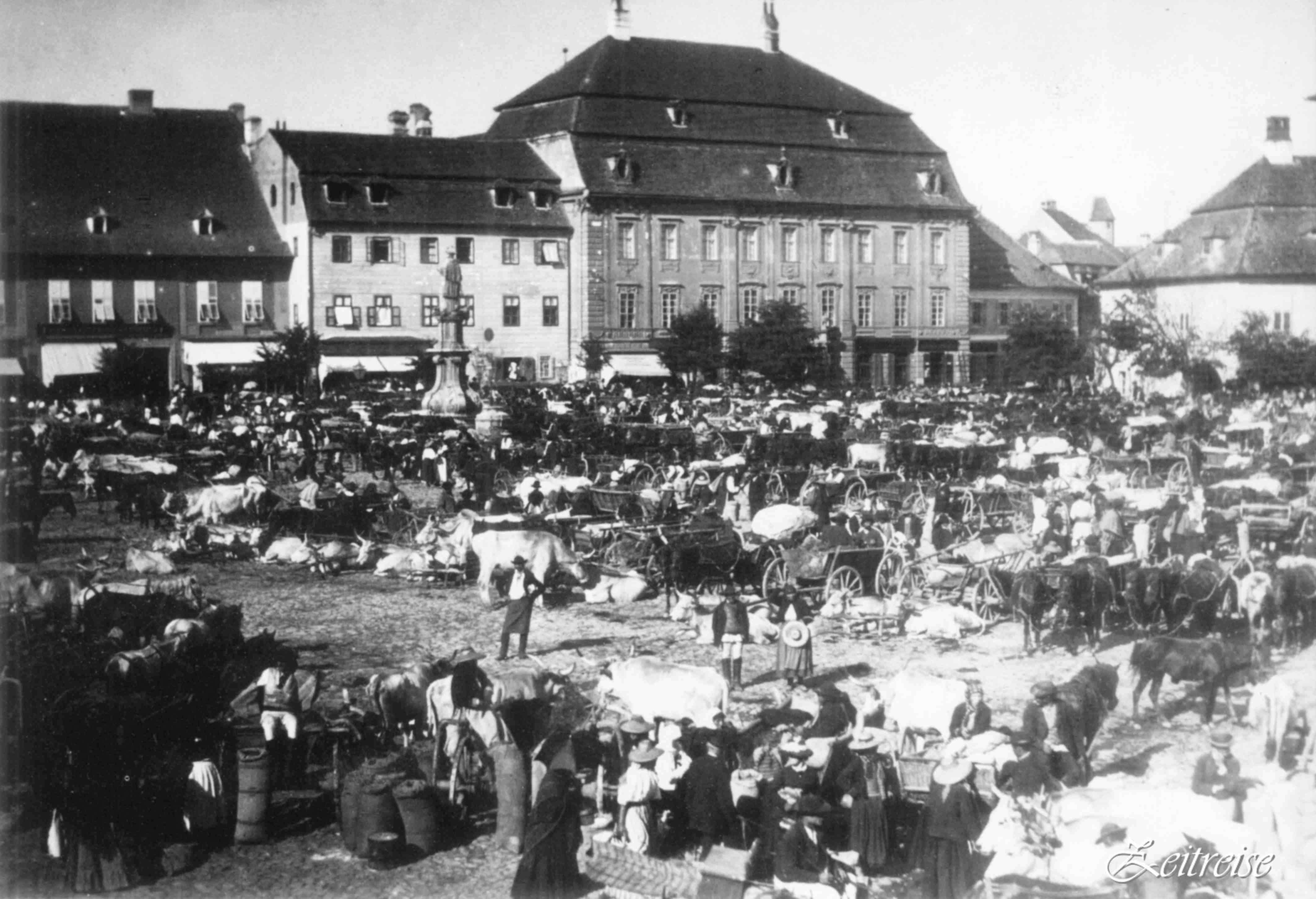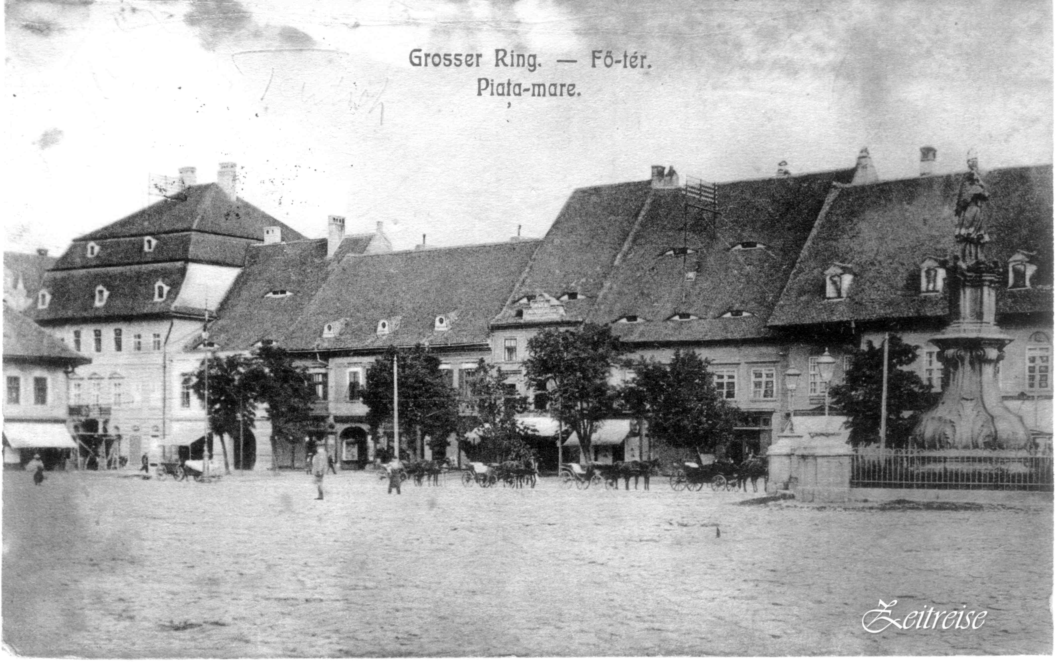 Piaţa Mare: 142 metri lungime şi 93 metri lăţime! Acelaşi spaţiu, neschimbat de-a lungul sutelor de ani. Doar decorul se schimbă de jur împrejur, se dărîmă case şi se construiesc altele noi, fîntîna se îmbracă în grilaj înflorit, felinarele risipesc întunericul, Nepomuk, pe soclul lui masiv veghează bunul mers al vieţii. În fiecare săptămînă, producătorii locali, ţăranii din satele vecine, soseau cu marfă la tîrg. Căruţele se aranjau rînduri -rînduri, astfel ca marfa să poată fi etalată şi cercetată de muşterii, direct din căruţă, sau din grămezile de pe caldarîm. Uneori, animalele toropite de căldură, se hodineau rumegînd chiar acolo jos, pe piatră.