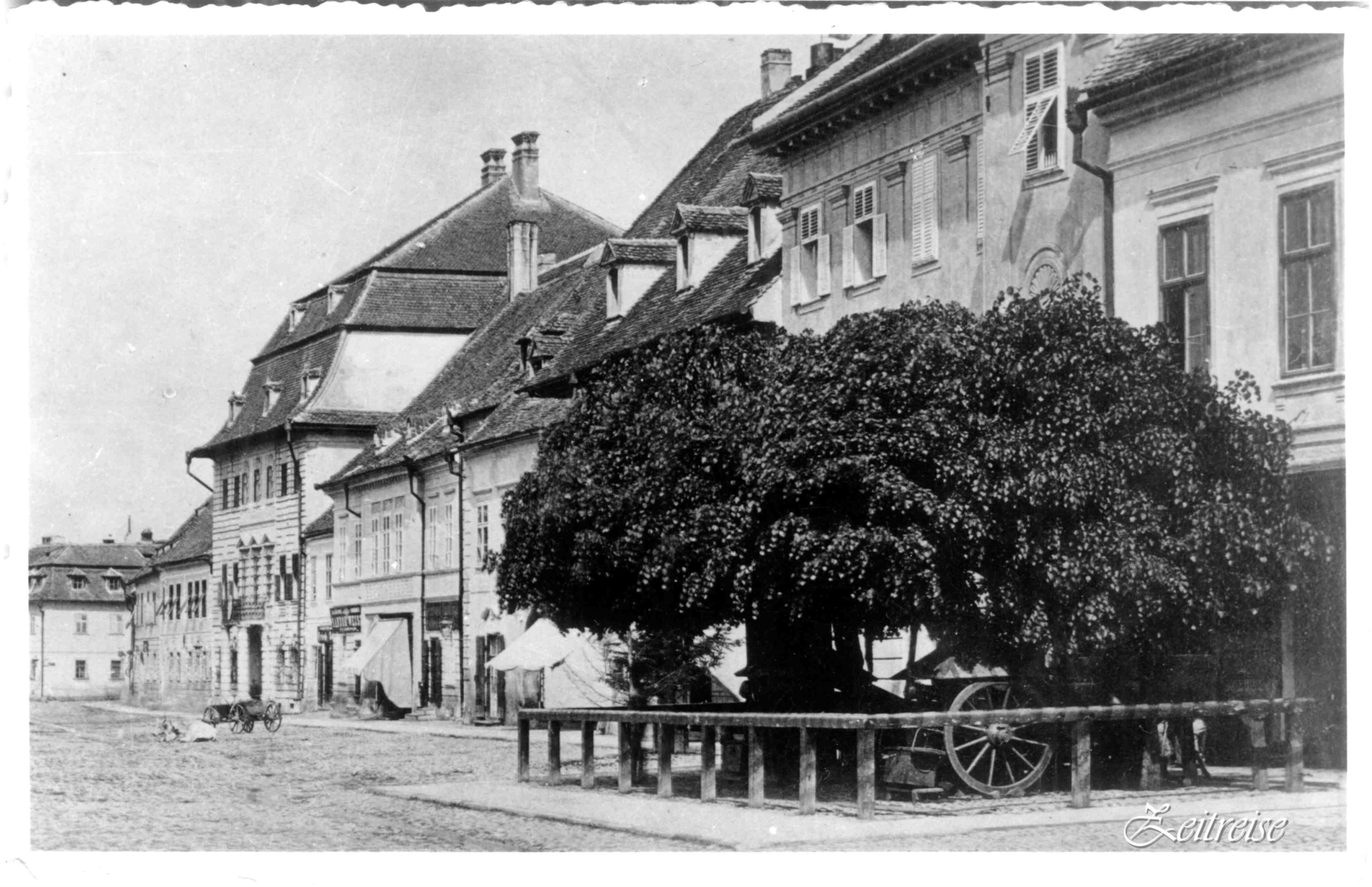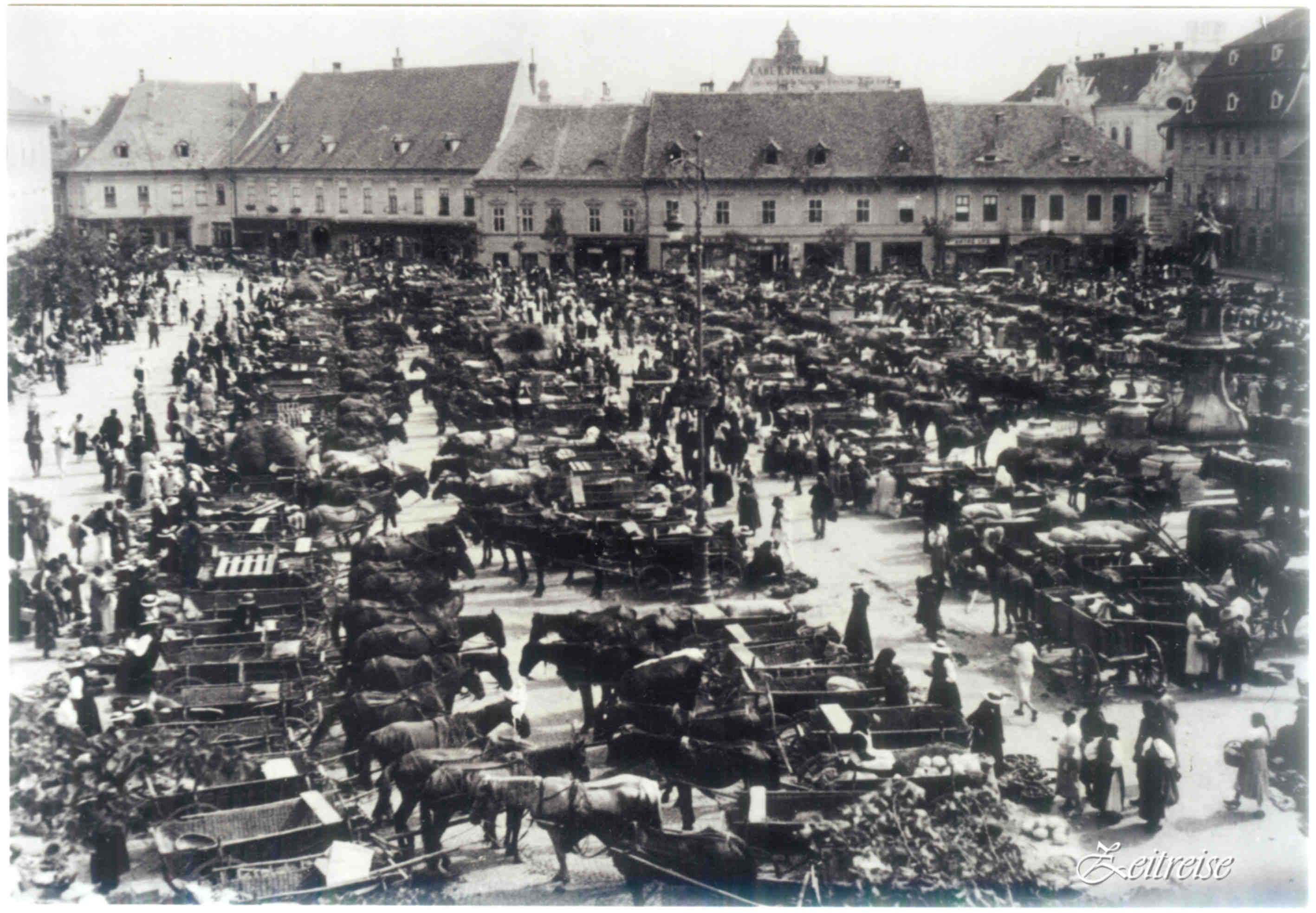 Se spune că, în zilele de tîrg anual, erau peste 1000 de tarabe aici în Piaţă. Se vindea şi se cumpăra sub ochii vigilenţi ai oraşului, căci iată, acoperişurile au deschis ochi! – „Zile de Târg în Piața Mare“ – sfîrșitul sec. al XIX-lea (fotografia de sus Emil Fischer)