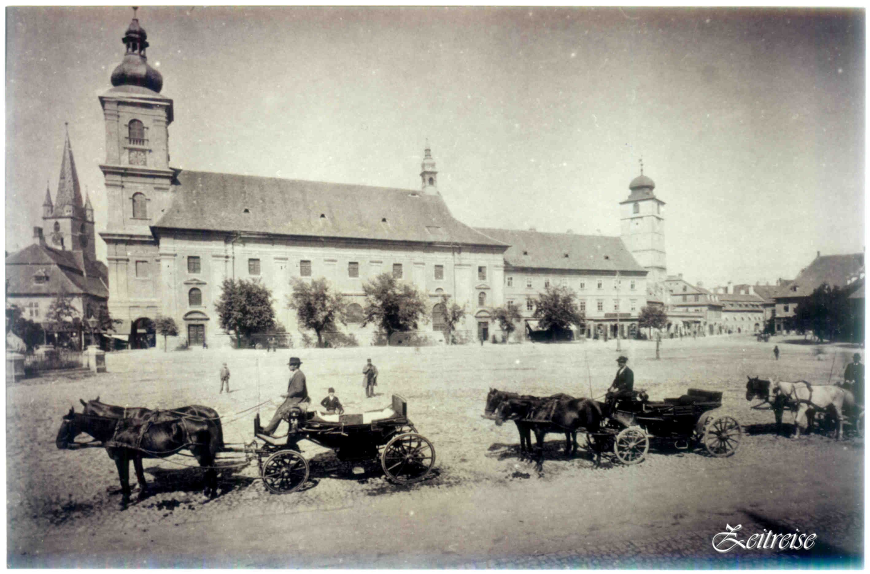 Ati văzut tristeţea băltită în ochii lui? Calul este darul divinităţii pentru om – spune un proverb arab. De la domesticirea lui, calul este fidel călăreţului, inima lui bate în ritmul celui care-l stăpîneşte. Este fidel soldatului pe care-l poartă printre săbii, iatagane, puşti, tunuri şi fum. Este fidel ţăranului trăgînd plugul în spate şi căruţa. Nu am putut citi niciodată Fefeleaga * pînă la capăt, fără să să mă cuprindă tristeţea pentru gloaba slabă, vîndută pentru cîţiva bănuţi de înmormîntare… Calul a fost fidel omului, dar omul? Un om bătea o iapă împotmolită în nisip. Omul era beat, iapa era fătată şi sleită de puteri. Am adunat turişti şi am tras iapa din nisip, din mîna ticălosului bătătuş. N-am mai călcat niciodată acolo în sat. Privesc trăsurile de altă dată din Piaţa Mare. După 1858 apar primele birje, aici, în piaţă. Ele sînt taxiurile nobile de atunci. Caii stăteau neclintiţi în aşteptare, în rînd. La Viena o mai fac şi azi, mîndri, nobili. In tîrgul nostru s-a păstrat doar amintirea lor în zile de glorie. Trăsurile se aliniau frumos în faţa Casei Generalului, acolo era staţia, mai tîrziu tramvaiul va opri în acelaşi loc. Piaţa Mare a fost totdeauna inima Cetăţii. Călători străini în Transilvania povestesc despre drumurile bune, întreţinute de săteni, fiecare umpleau şanţurile lăsate de roţi în porţiunea din faţa casei. Tot ei povestesc despre diligenţe cu 10 cai bine mîncaţi şi iuţi de picior. Din Ţara Românească pînă în Transilvania, drumul era greu, desfundat şi înnoroiat. Uneori doar boii reuşeau să scoată căruţele împotmolite! Dar, odată ajunşi în Transilvania, drumurile deveneau prietenoase, întinse, caii tropoteau vioi tragînd în spate diligenţe de poştă, ori carele de mărfuri, ori trăsura mai mică şi mai intimă. Aşa se ajungea din Sibiu la Viena, în Imperiu. (Clausewitz 1824, călători străini despre Ţările Române în sec XIX, vol II, editura Academiei Române)Iată trăsurile din Piaţa Mare, în aşteptare. Drumul nostru,acum, este doar drum în timp! Un cal este poezia in miscare! (* Fefeleaga – povestire de Ion Agirbiceanu) – Piaţa Mare – sfârșitul sec. al XIX-lea – începutul sec. al XX-lea
