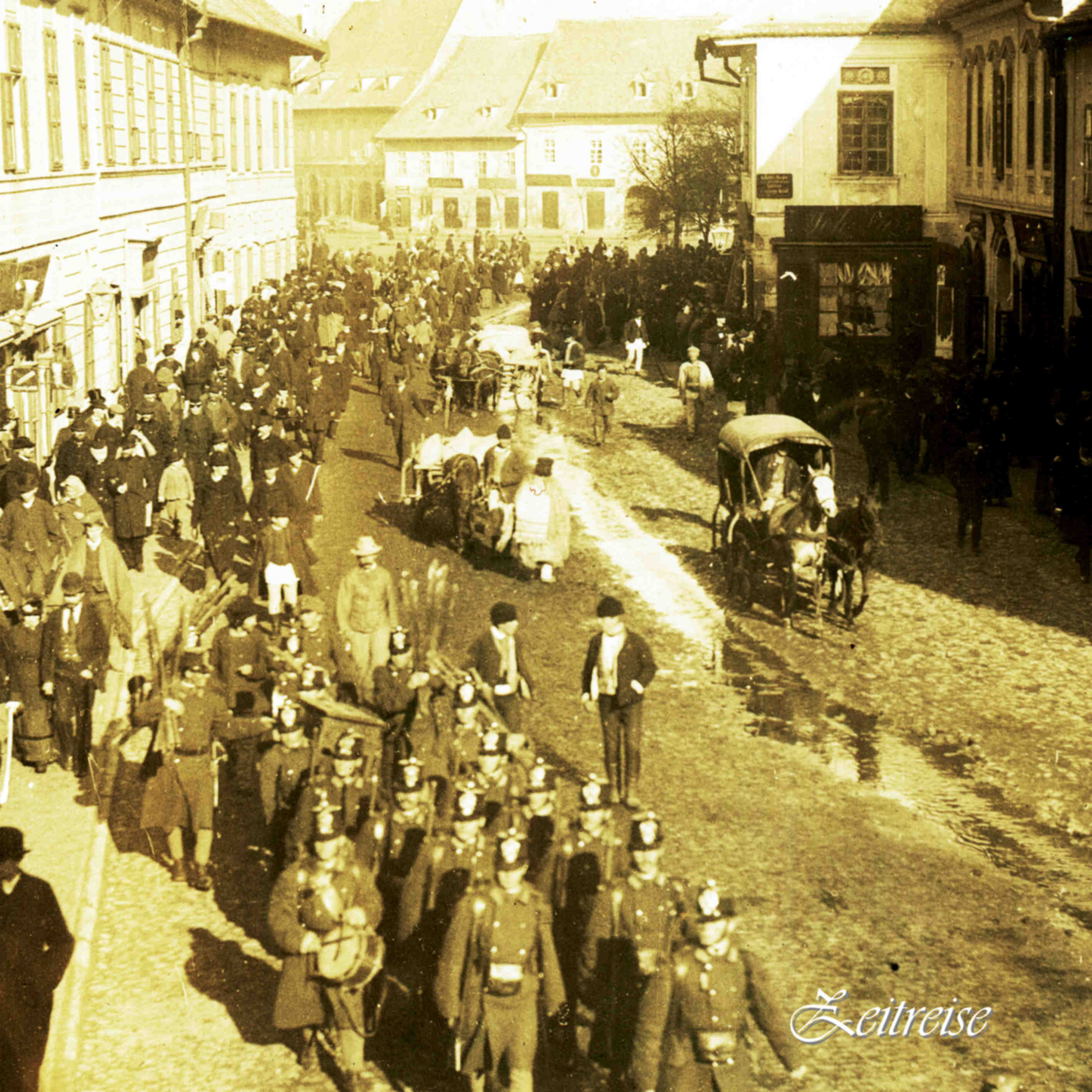 Anul de graţie 1886, sfîrşit de secol în Cetate. Toamna învăluie străzile burgului într-o lumină aurie. Pe Heltauergasse nu apucă să se usuce noroiul. Pîrîul ce se scurge din Sevis, venind din Parcul Subarini, bălteşte pe alocuri şi trecătorii duc dintr-o parte în alta umezeala. În căldura amiezii, noroiul se usucă gălbui pe ghete. Azi e forfotă mare, piaţa plină de curioşi, strînşi cu toţii în faţa Casei Generalului. Cum părăseşte Garda o casă? Desigur, cu fruntea sus, privirea umbrită de cozoroc, în pas marcat de ritmul toboşarului. O defilare ad-hoc de la un colţ la altul al centrului, prilej de emoţie şi agitaţie în calmul oraşului nostru de provincie. Ţărani în iţari albi şi cămaşă şi ciobani cu cojoc în spinare nu se clintesc din mijlocul drumului, birja porneşte spre vreun cartier îndepărtat, dar mulţimea entuziasmată şi veselă urmează Garda. Soldaţii cu arma la umăr, unii cară un piedestal sau vreun lădoi de lemn alţii duc hărţi în braţe. De eraţi curioşi, aveţi aici cuprins, spontan, mozaicul societăţii transilvănene, orăşeni băţoşi şi bine strînşi în veste şi doamne cu corset şi pălărioară, tineri cu mîinile în buzunar, ţărani şi studenţi… o adunare pestriţă şi zîmbitoare în soarele tomnatec.Strada N. Bălcescu / Piața Mare 1886 – În această fotografie se vede ultima strajă/gardă din Piața Mare în drum spre cazarma de Infanterie din Piața Unirii, cunoscută dupa 1920 sub numele de Cazarma 90.