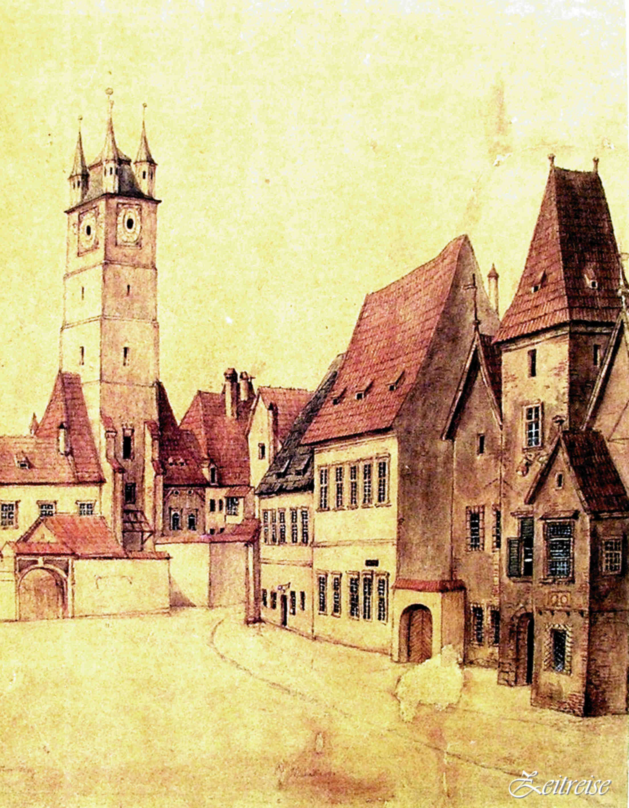 Din turnul Bisericii Evanghelice se oferă ochiului, pînă departe în zare, întinderea oraşului tăiat de străzi, înconjurat de ziduri şi porţi. Unele au fost demult sfărîmate şi uitate, altele s-au păstrat în amintire pentru posteritate prin fotografii şi prin picturi. Pe vremuri, turnurile erau aparate de o breaslă anume şi purtau numele ei. Calfe şi meşteşugari fugeau degrabă sus în turn în apărarea oraşului. Apoi, cînd oraşul s-a deschis şi început să crească, ca o coca dospită, oraşul de afară a cuprins pe cel dinăuntru, porţi şi turnuri au fost dărîmate. Un şef brutar cu pasiune a pictat oraşul, aşa cum a frămîntat şi aluatul, cu sîrguinţă şi exactitate: Johann Böbel.Altă dată, de te urcai în turnul Bisericii Evanghelice, puteai vedea în depărtare şi turnul Lăcătuşilor, zis „Turnul lui Herbert“ şi vechiul han, a cărui poveste pierdută rămîne pe vecie. Doar imaginea lui Böbel a apucat să o zugrăvească!