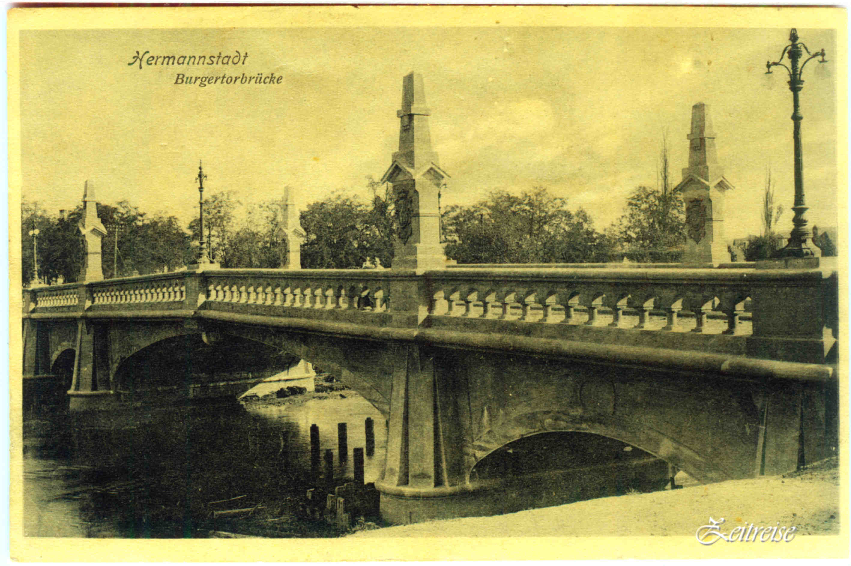 Desigur, numele lui este mai sofisticat, istoria lui mai lungă… Podul de la Poarta Ocnei // Burgertorbrücke! Neuhauser ne pictează un falnic pod de lemn şi îl face punctul central al tabloului său din 1808. El va fi ulterior înlocuit cu unul şi mai impunător din piatră şi va deveni primul pod peste Cibin construit în piatră! Sînt doar un povestitor în trecere pe pod. Mă opresc şi-l privesc, acum de departe şi în timp şi în spaţiu. Îl privesc mai degrabă în imagini vechi căci acolo îmi pare măreţ şi gîndul mă duce la Podul Carol şi Praga. Dar noi nu am avut Vîltava cea învolburată! Doar un rîuleţ nervos uneori, Cibinul, şi limpede în anii copilăriei că te puteai scălda liniştit. Apoi, nu l-am împodobit cu statui aurite dar ne-am străduit să-l dichisim cît de cît.Dau fuga prin imensul vitual căutînd povestea lui şi mă întîlnesc mereu cu aceeaşi explicaţie şi aceeaşi propoziţie repetată la nesfîrşit că nici nu mai ştiu exact cui aparţine, de fapt: „În 24 octombrie 1864 este inaugurat podul din faţa fostei porţi a Ocnei“.