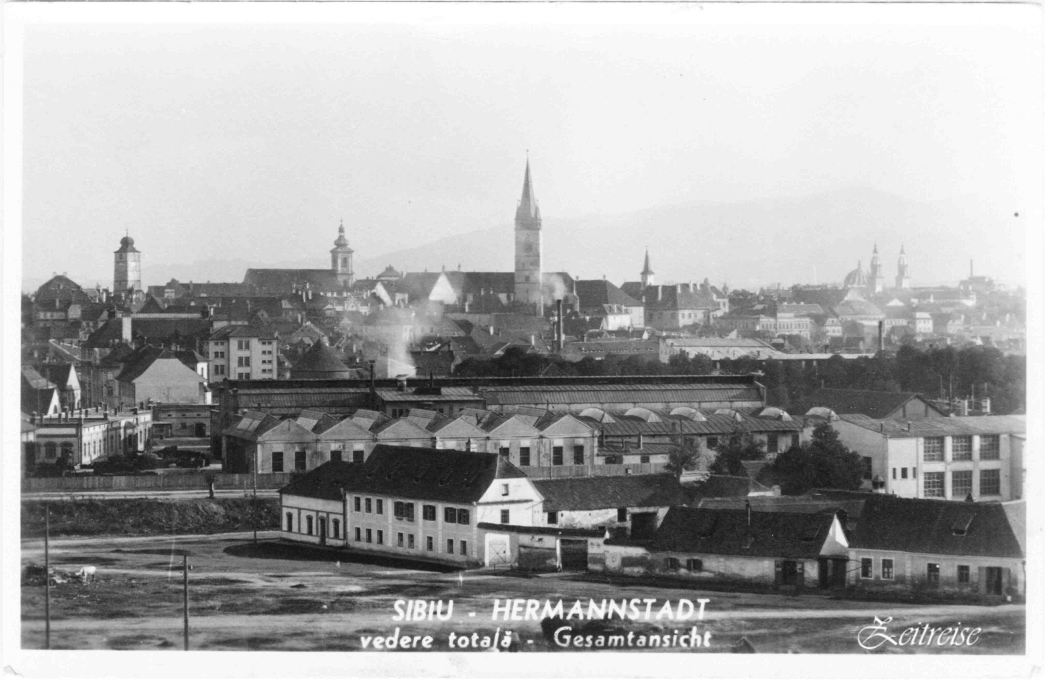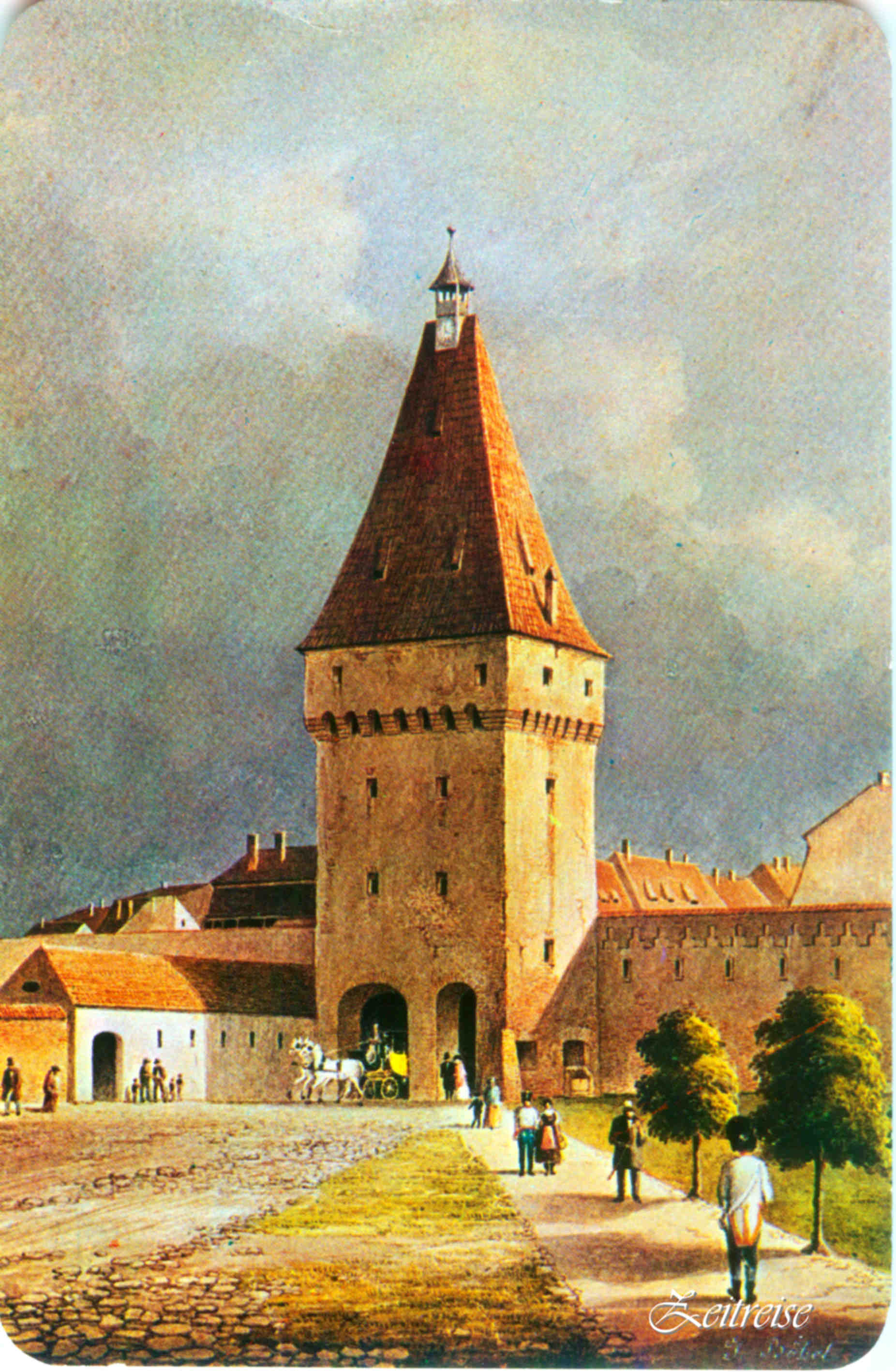 „Poarta Cisnădiei din Sibiu, vedere dinspre oraș“ // „Heltauertor Hermannstadt, Innenansicht“ – demolată 1839. În dreapta se vede fosta clădirea din str.Tribunei nr.1 – Carte Poștală, dintr-un set cu picturi executate de Johann Böbel, tipărite la Intreprinderea Poligrafică Sibiu