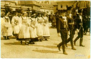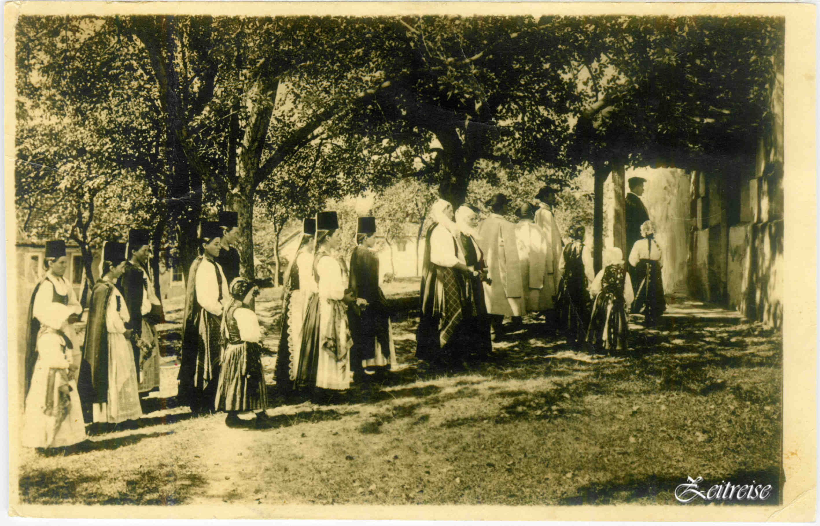 Săsoaice din Cisnădioara în drum spre biserică – Carte Poștală circulată 1933
