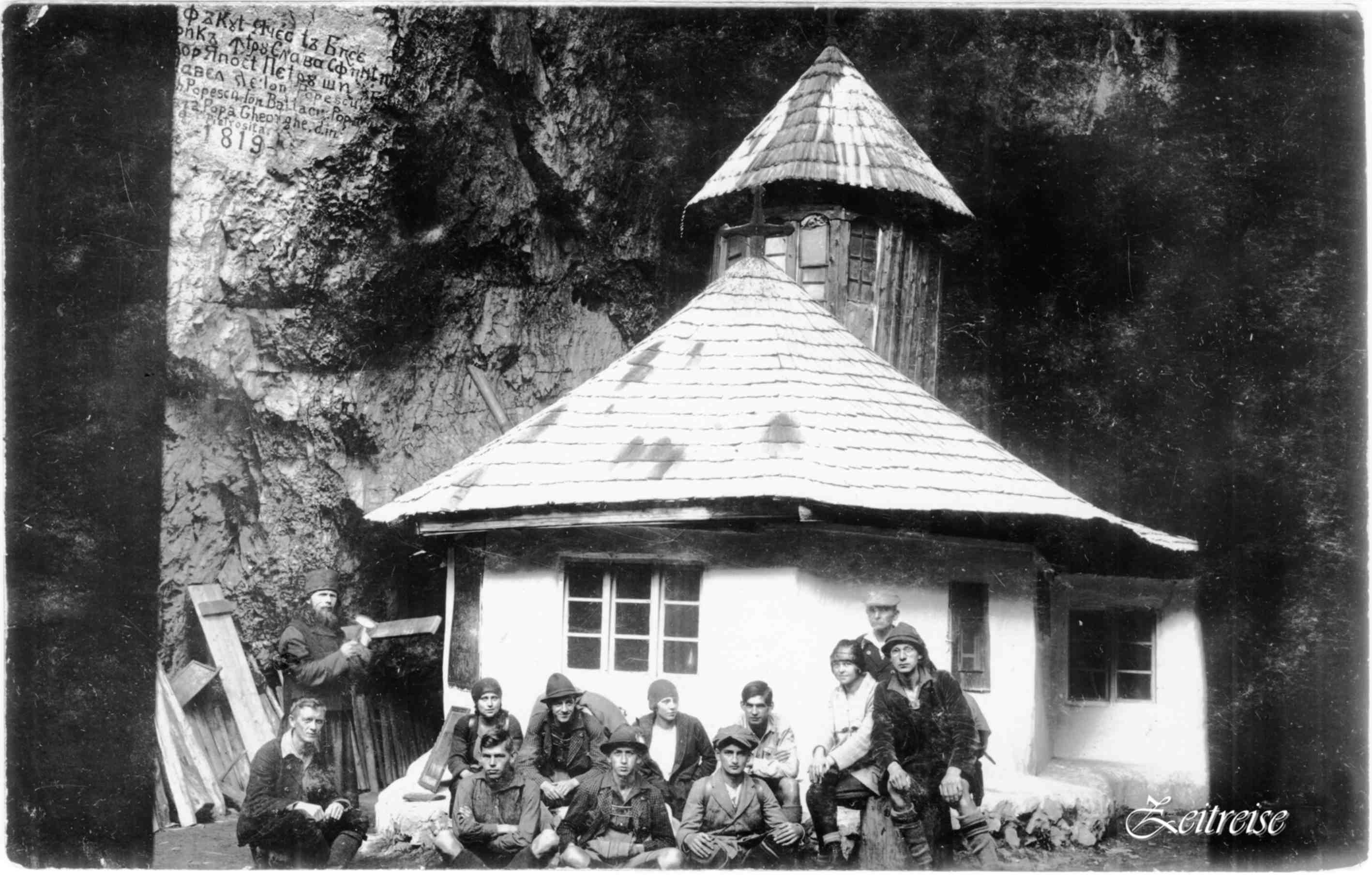 Călugăr bătând toaca – Schitul Mănăstirea Peştera Ialomiţei / Fotografie facută în data de 1 iunie 1925 – SKV Siebenbürger Karpatenverein // Societatea Carpatină din Ardeal