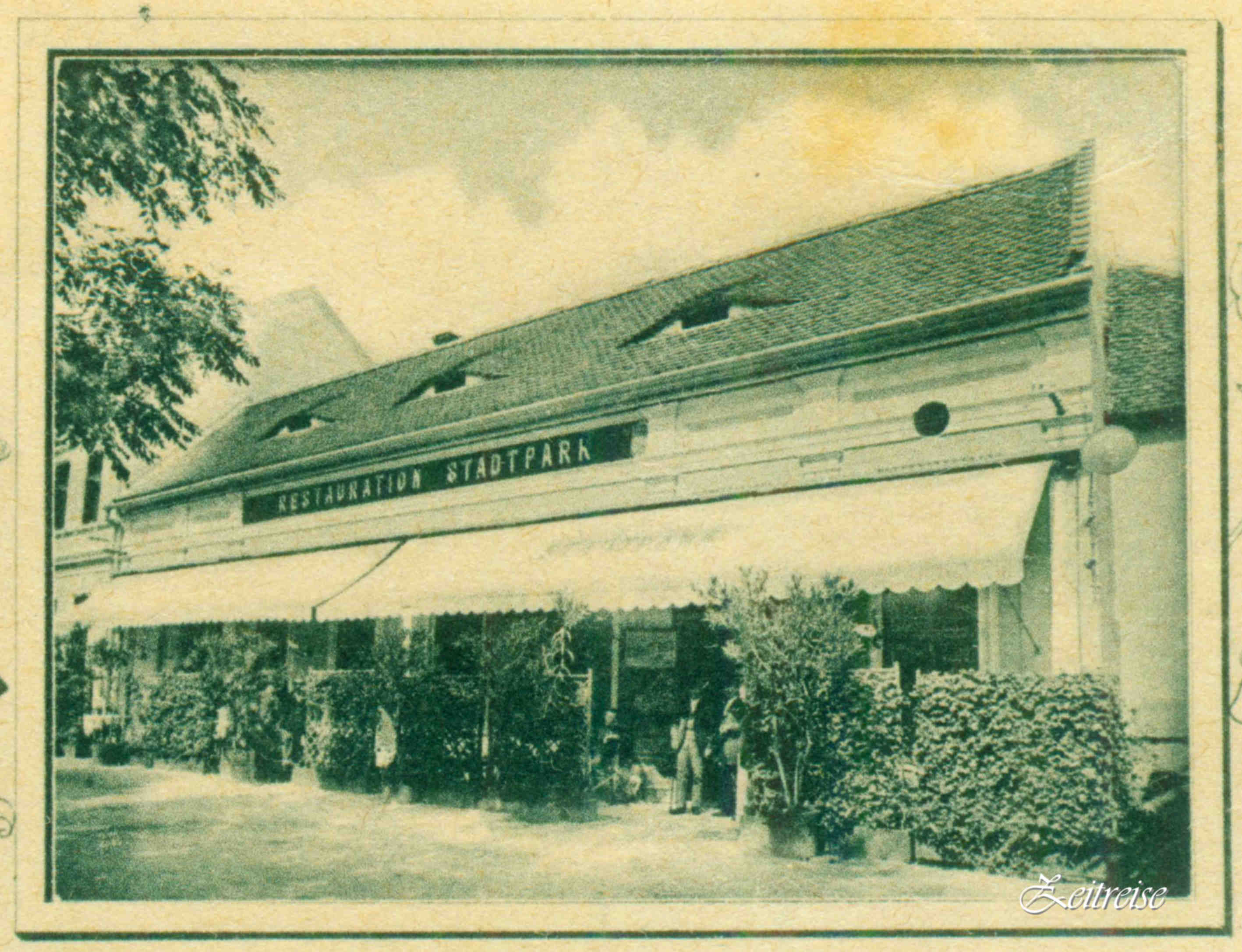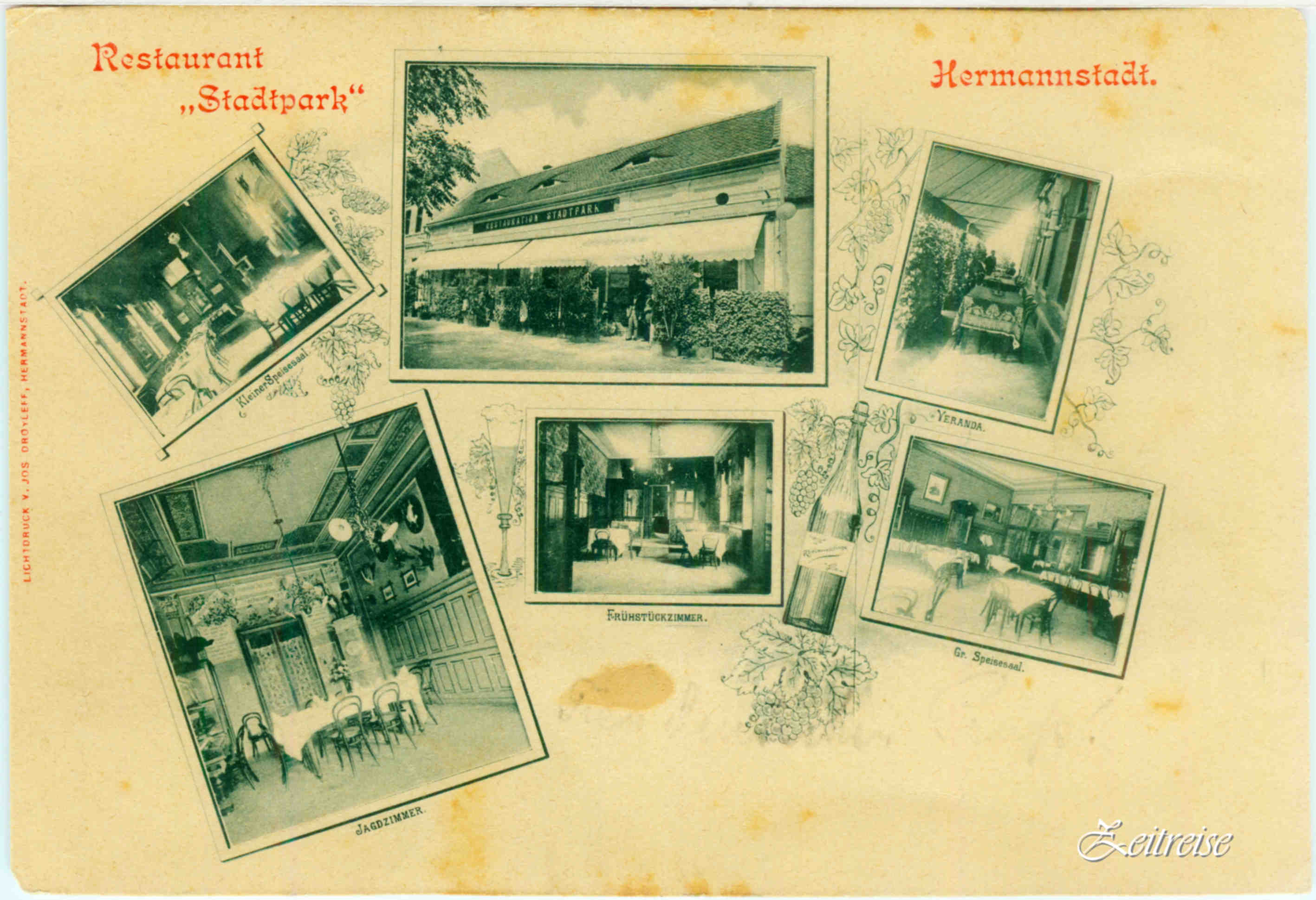 Călătorule insetat, de treci pe sub bolta casei cu reclama Fritz Sift, venind de pe str.Tribunei ori N.Bălcescu ca printr-un arc în timp, pofteşte de te răcoreşte la Restaurantul „Stadtpark“. Terasa (Veranda) restaurantului stă pitită sub marchiza în umbră verde, sub ochii protectori ai oraşului. Berea urcă în halbe cu guler înalt dantelat şi-n lujerii învîrtiţi, adesea, păsări mici poposesc.