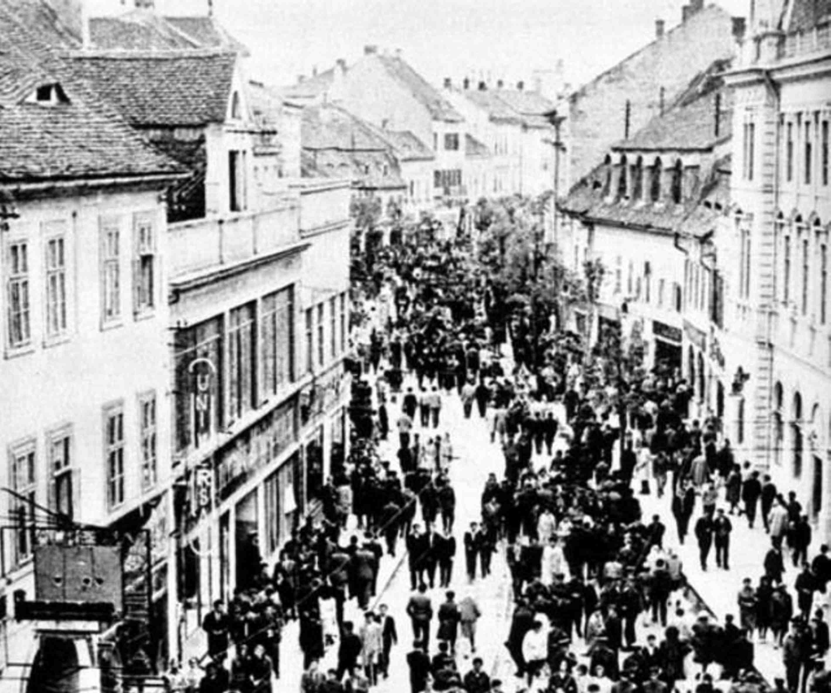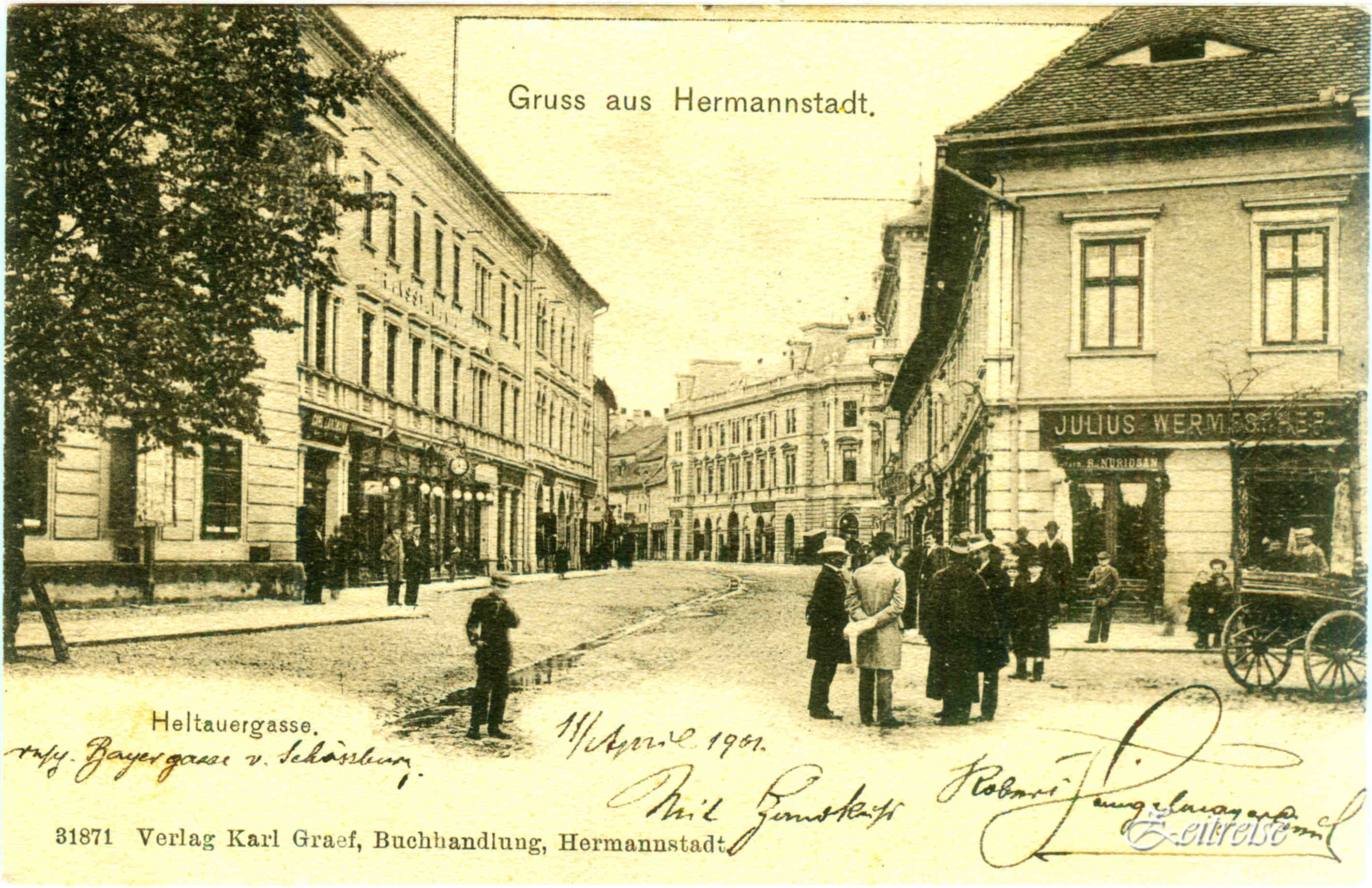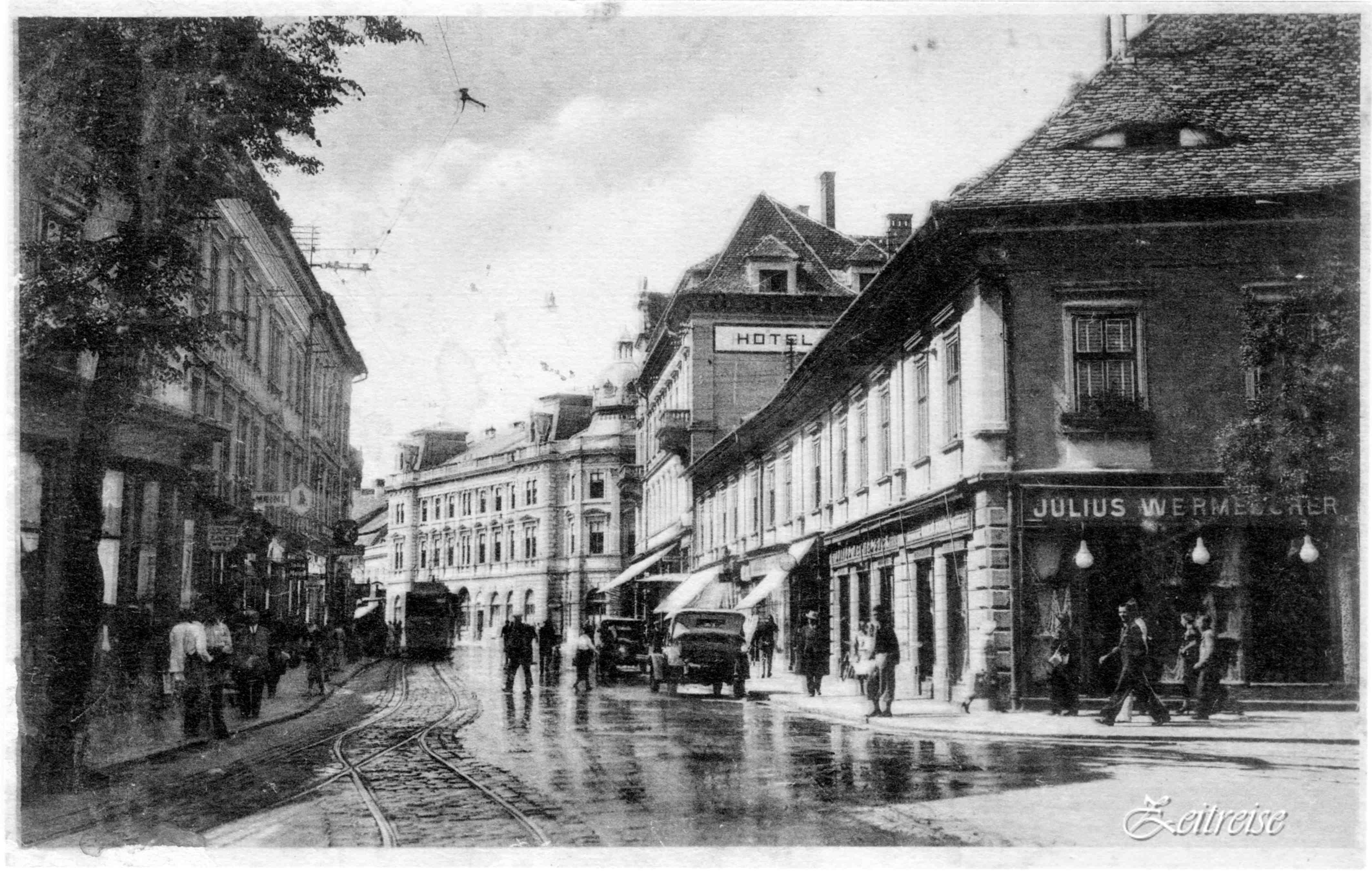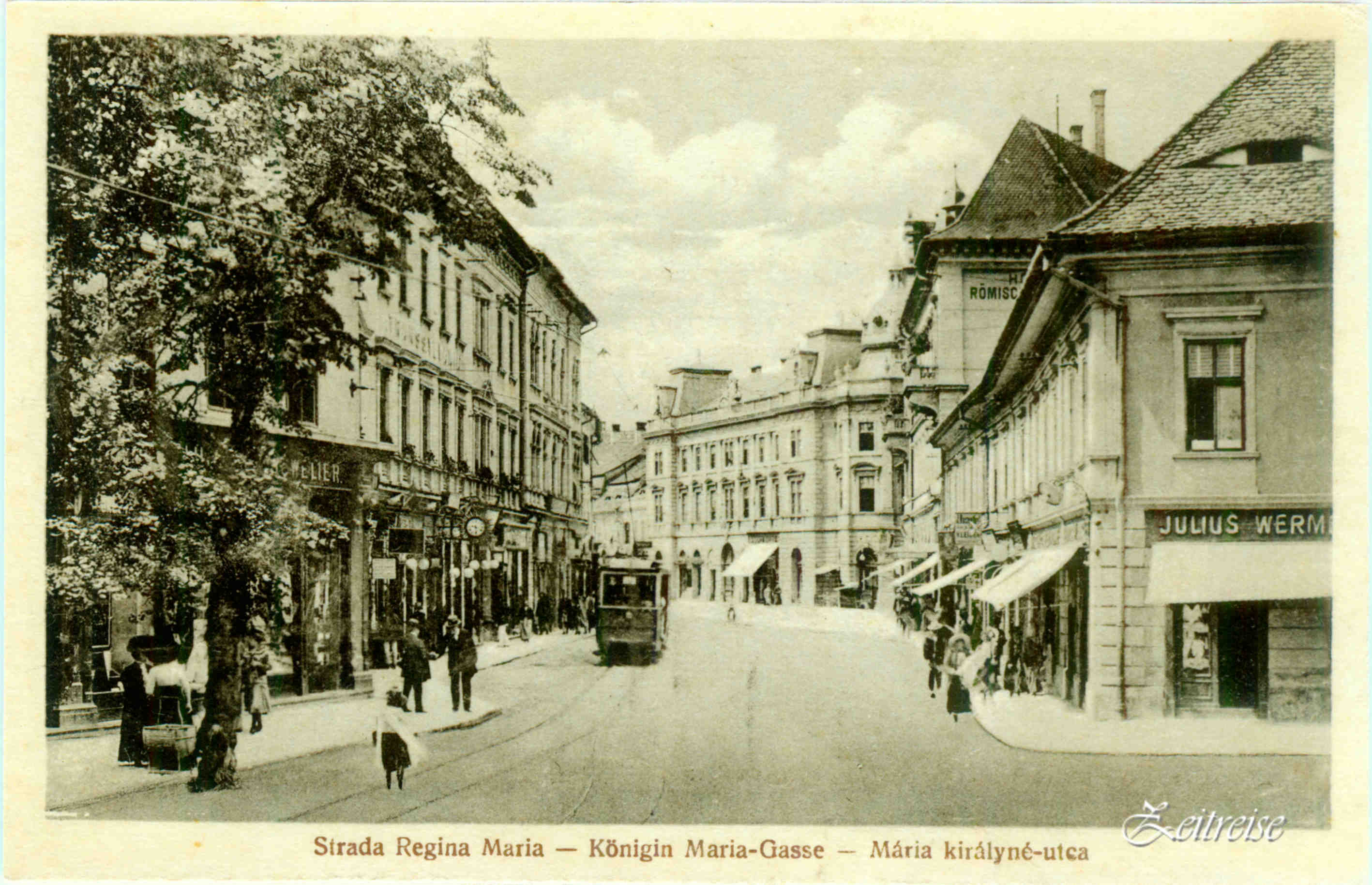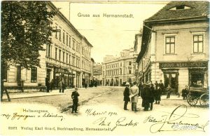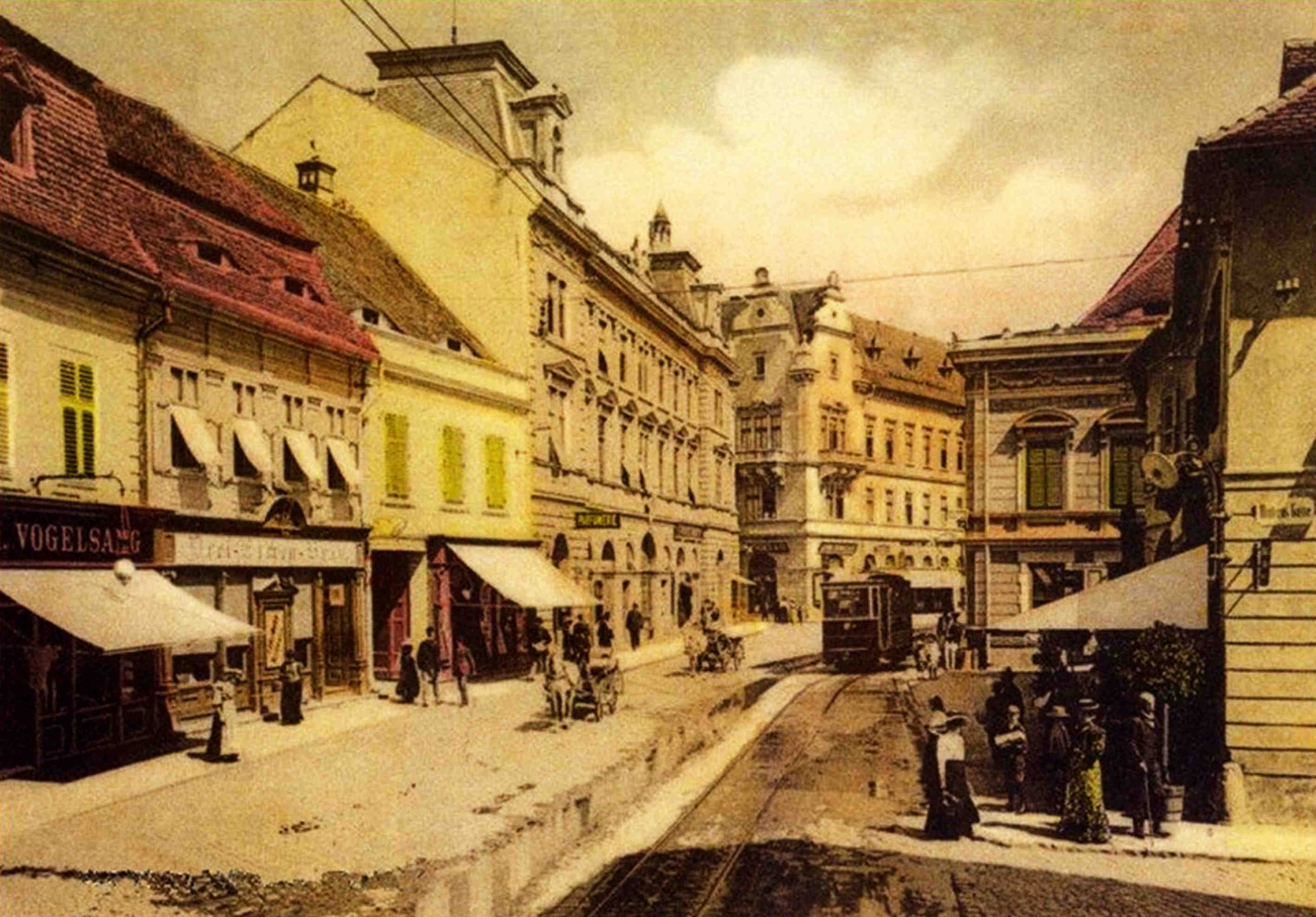 Strada N. Bălcescu înainte și după introducerea linii de tramvai 1905 // Heltauer Gasse ohne und mit Straßebahn… „Tram“