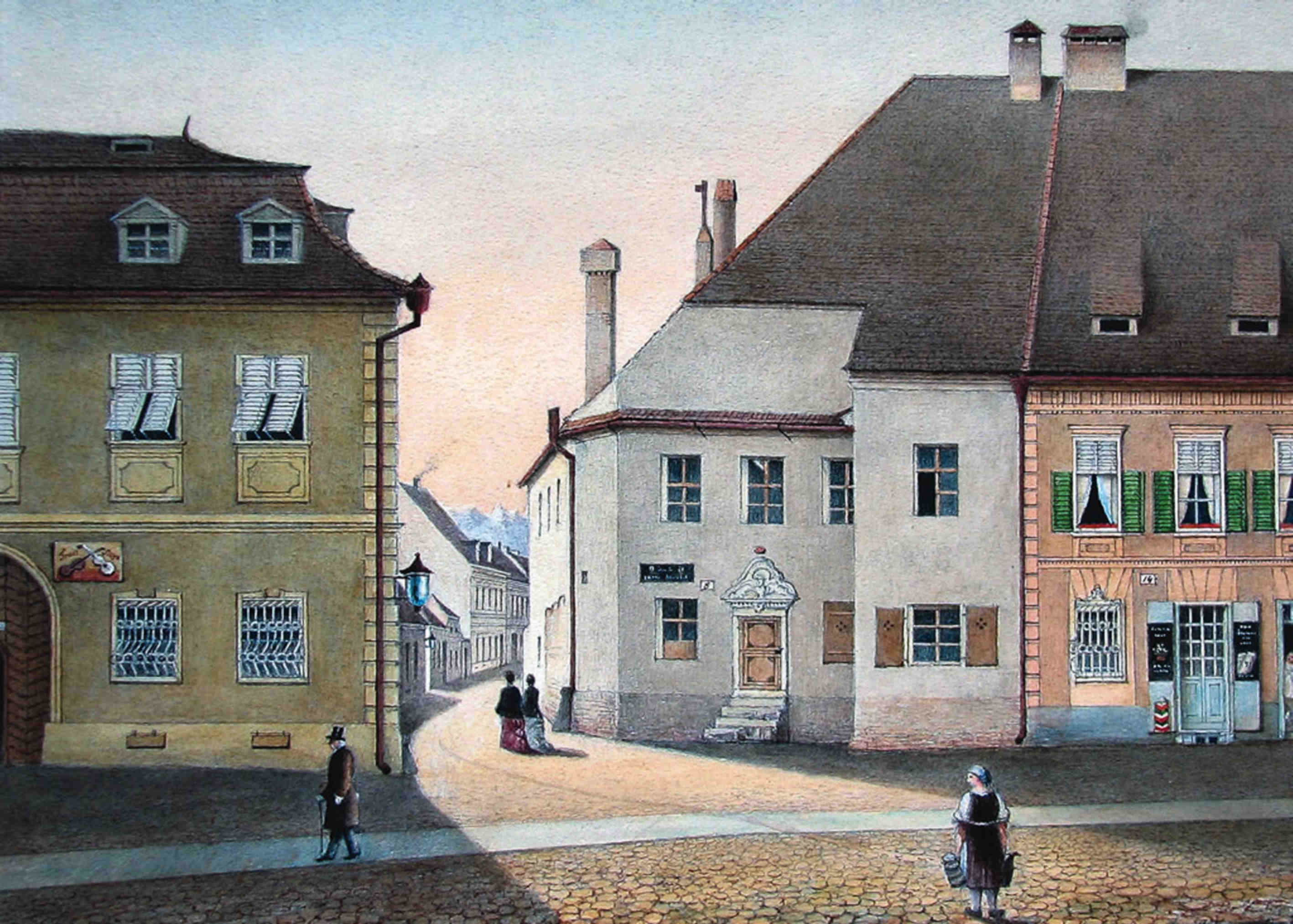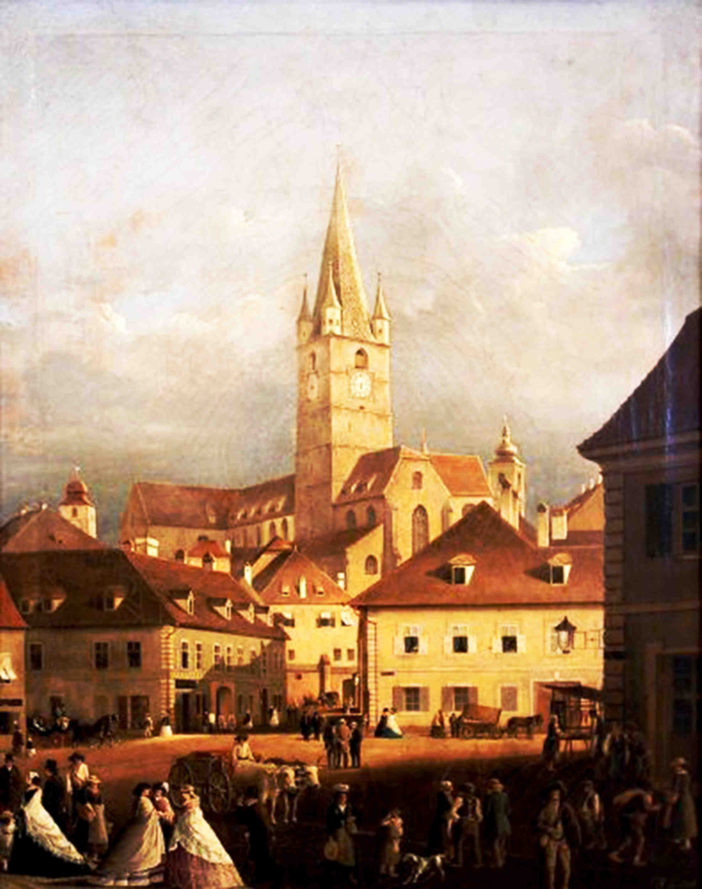 Strada Turnului si Biserica Evanghelica – pictură realizată de Johann Böbel