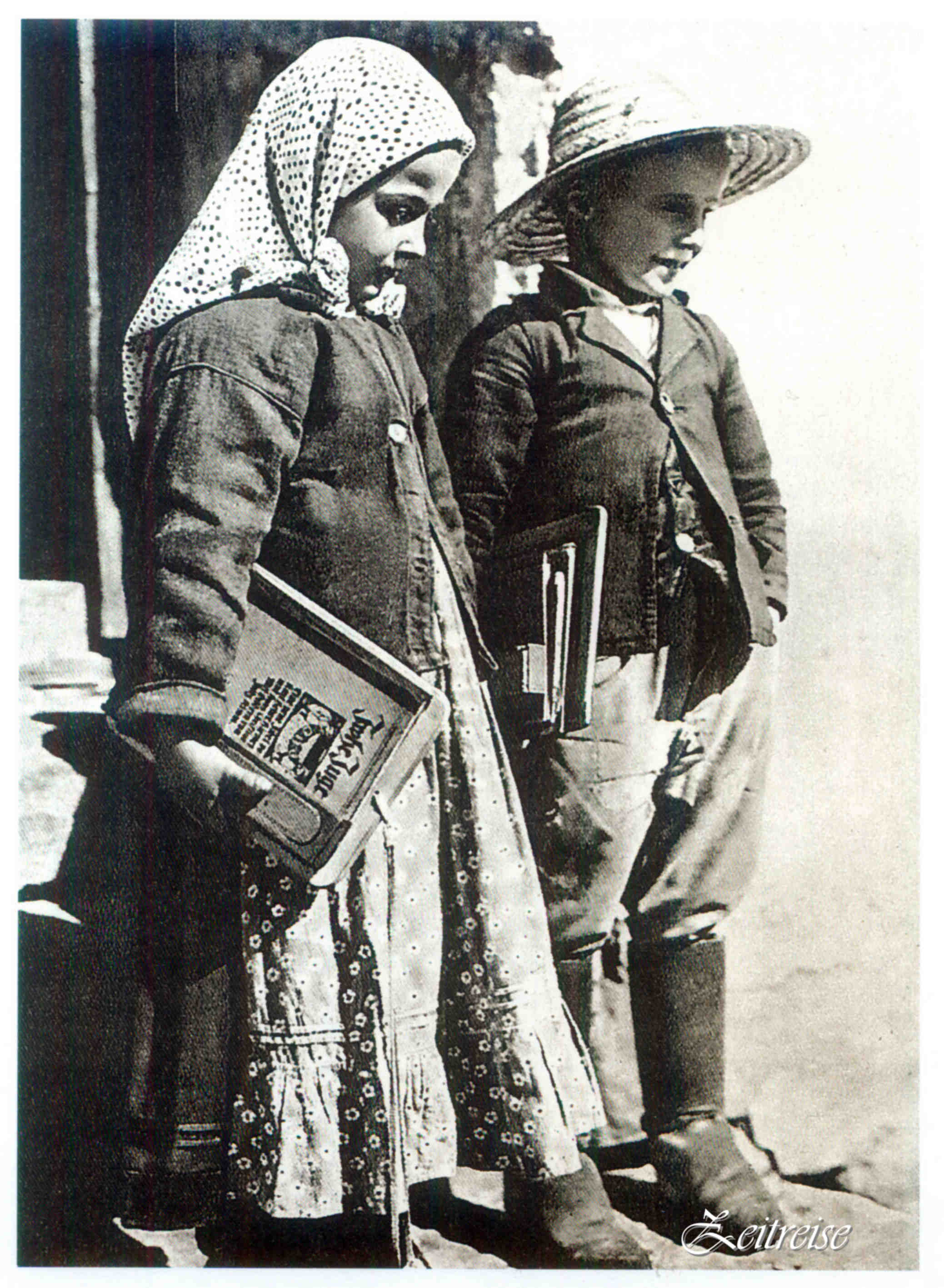 Copii școlari din Ardeal cu Abecedare si penare din lemn, în drum spre școală