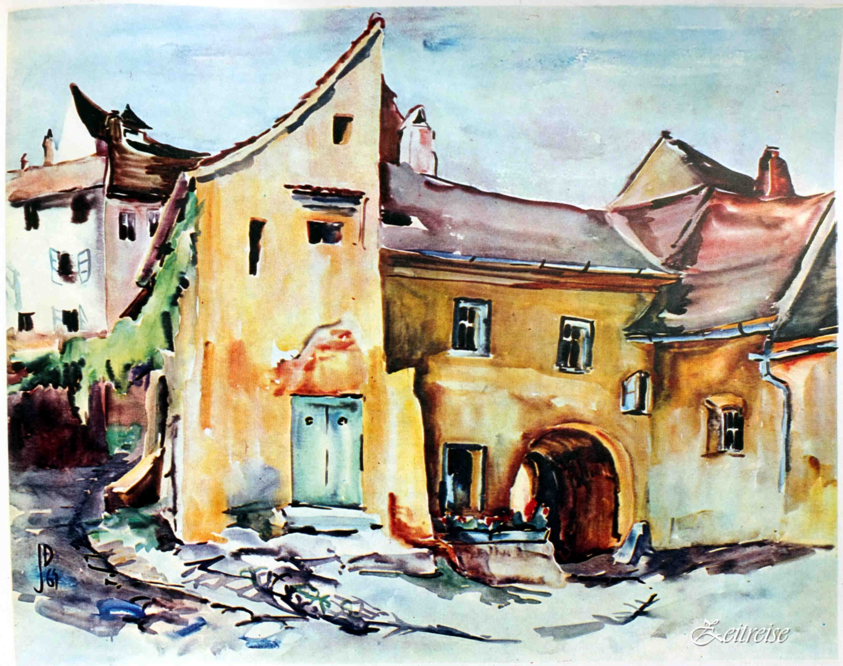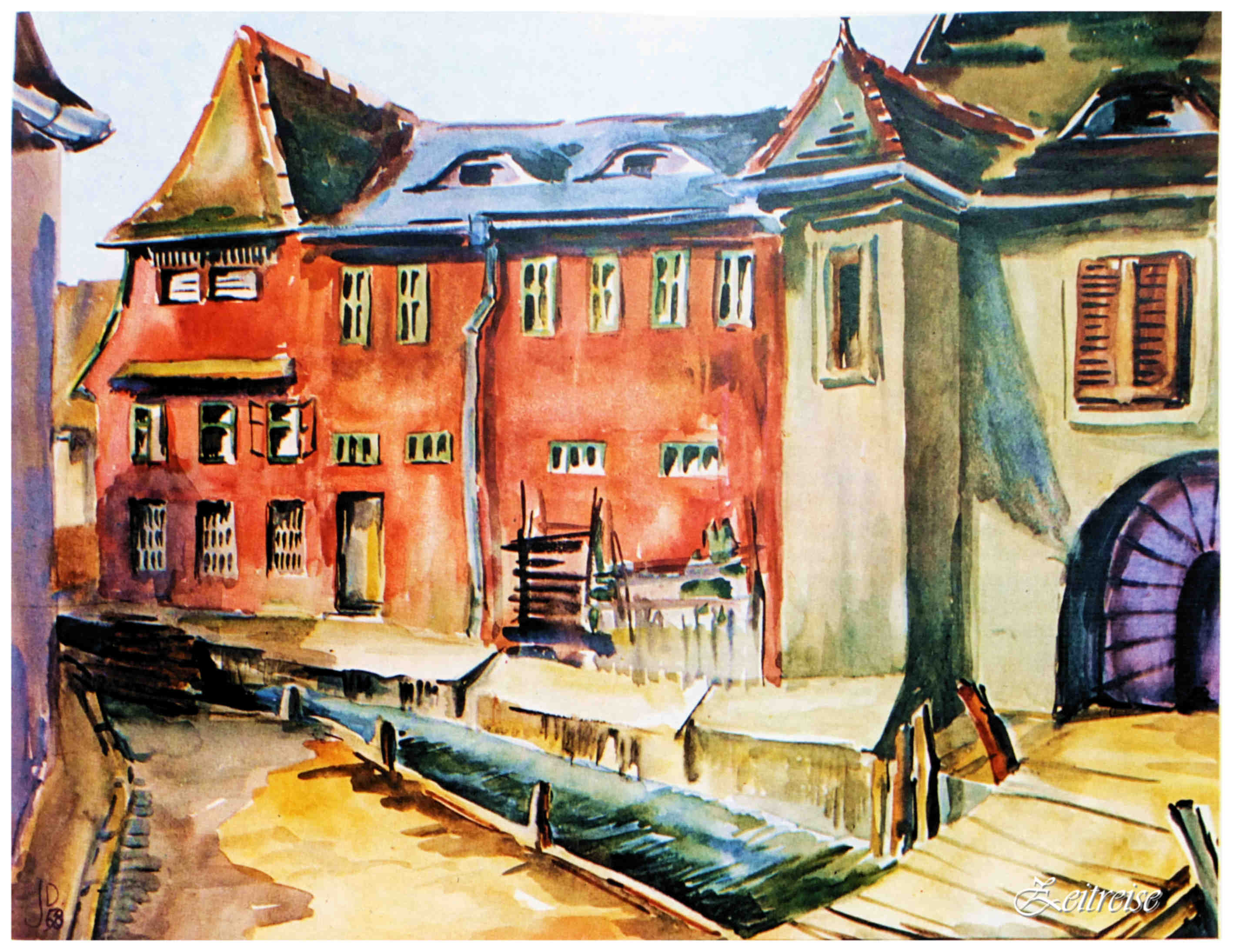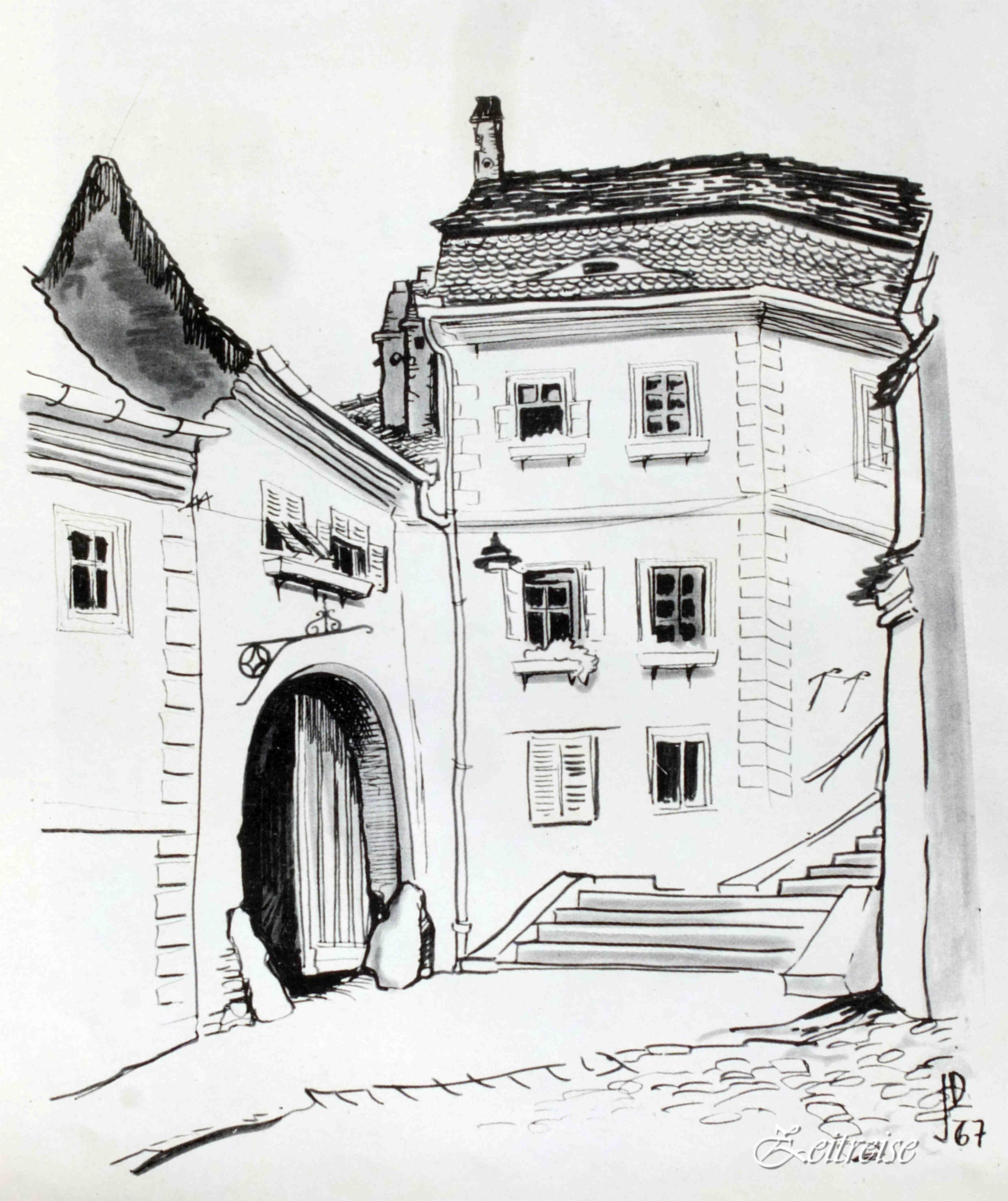 Strada Vopsitorilor / Färbergasse – acuarelă și desen de Juliana Fabritius-Dancu din anii ’50/60. În dreapta se vede podețul peste pârăiaș si poarta cu motiv solar de la casa nr.13