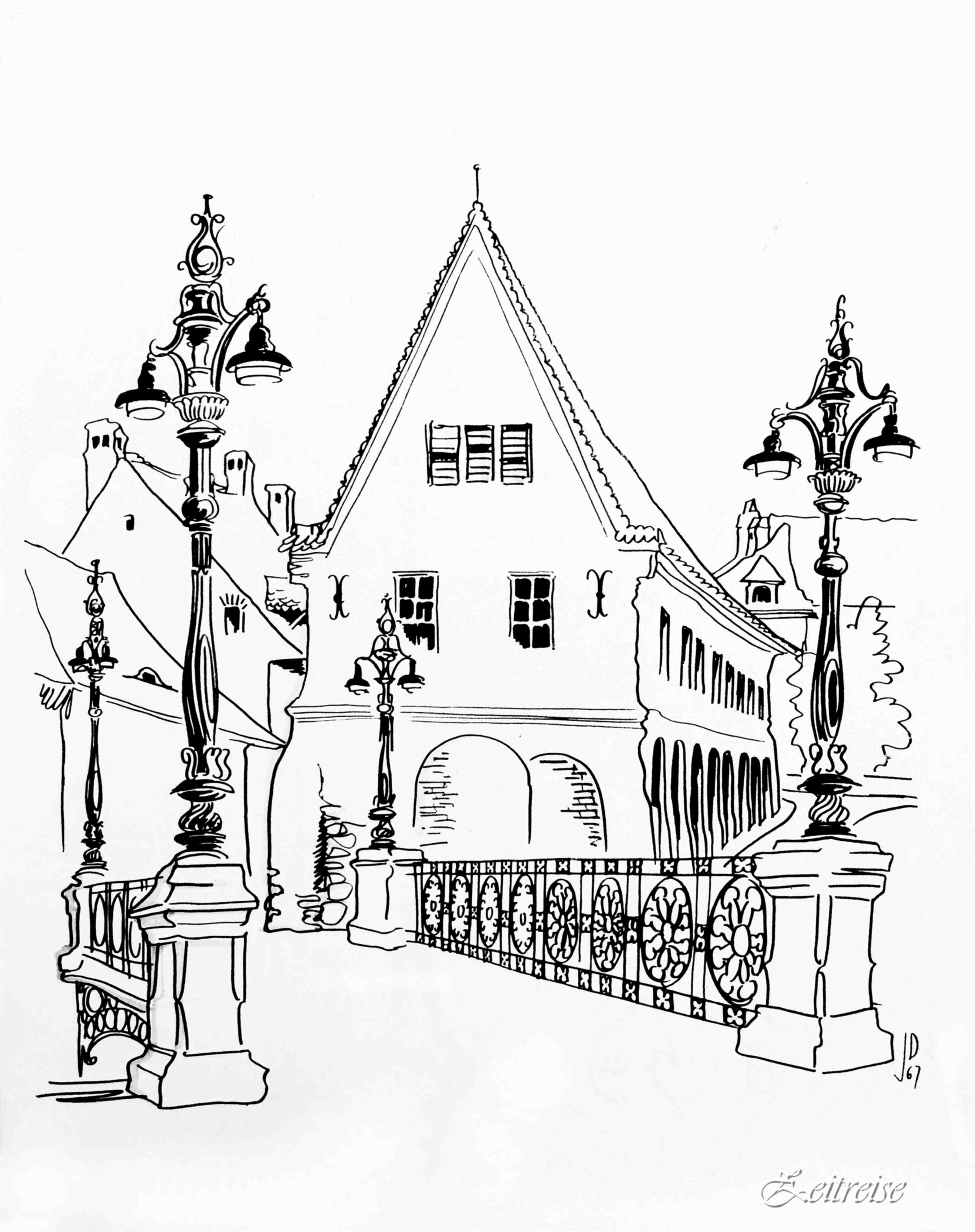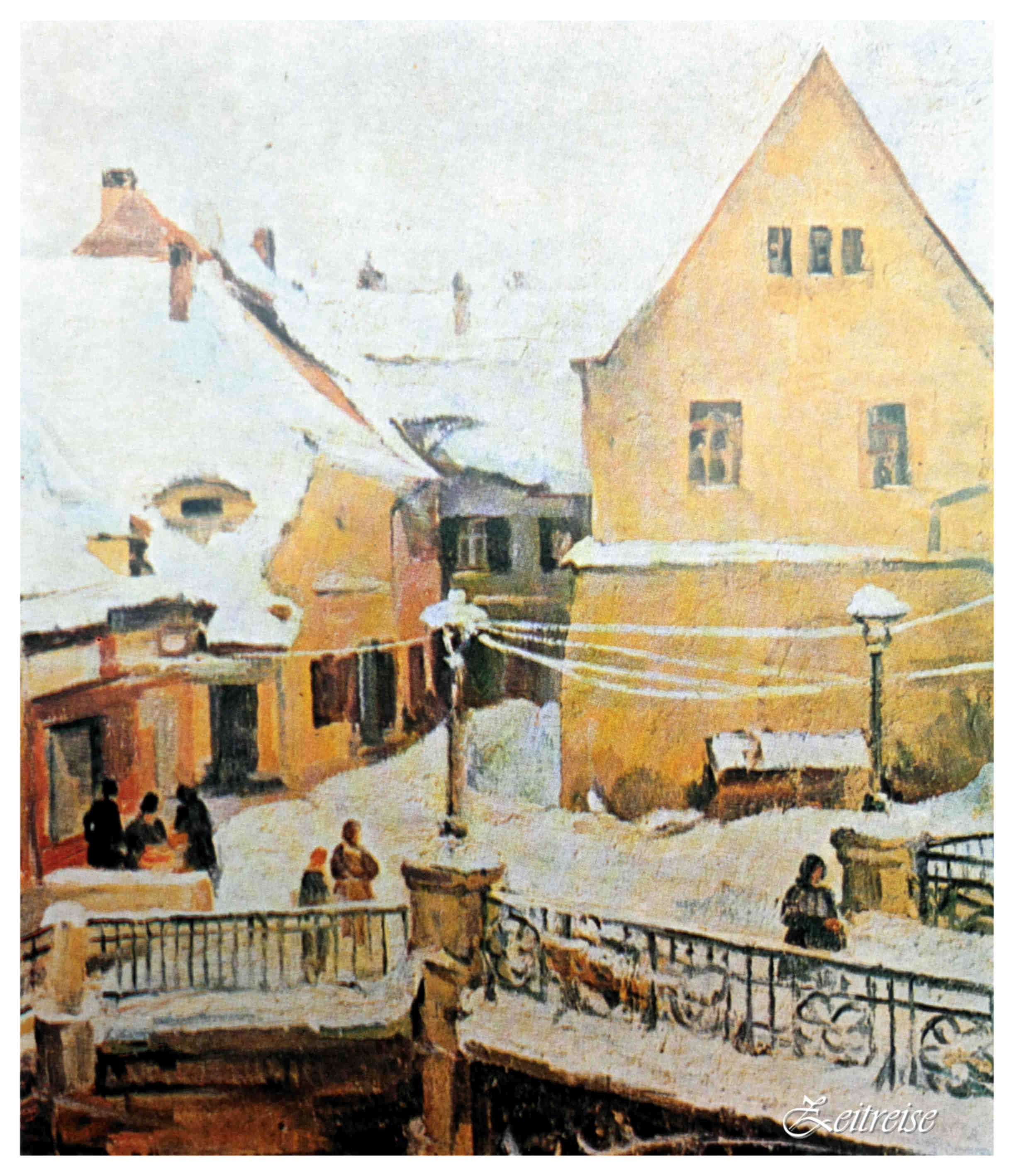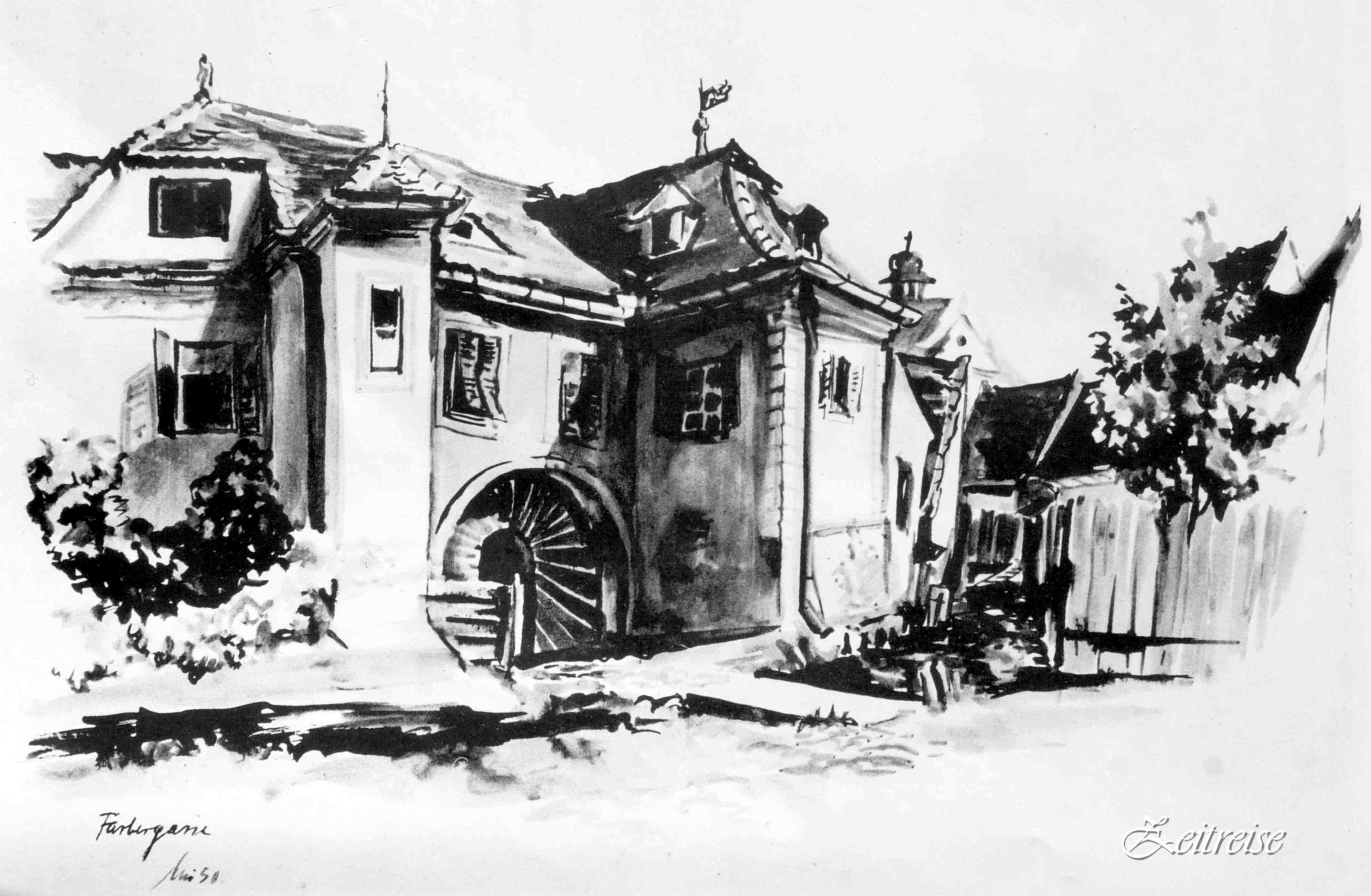 Strada Vopsitorilor / Färbergasse – acuarelă și desen de Juliana Fabritius-Dancu din anii ’50/60. În dreapta se vede podețul peste pârăiaș si poarta cu motiv solar de la casa nr.13