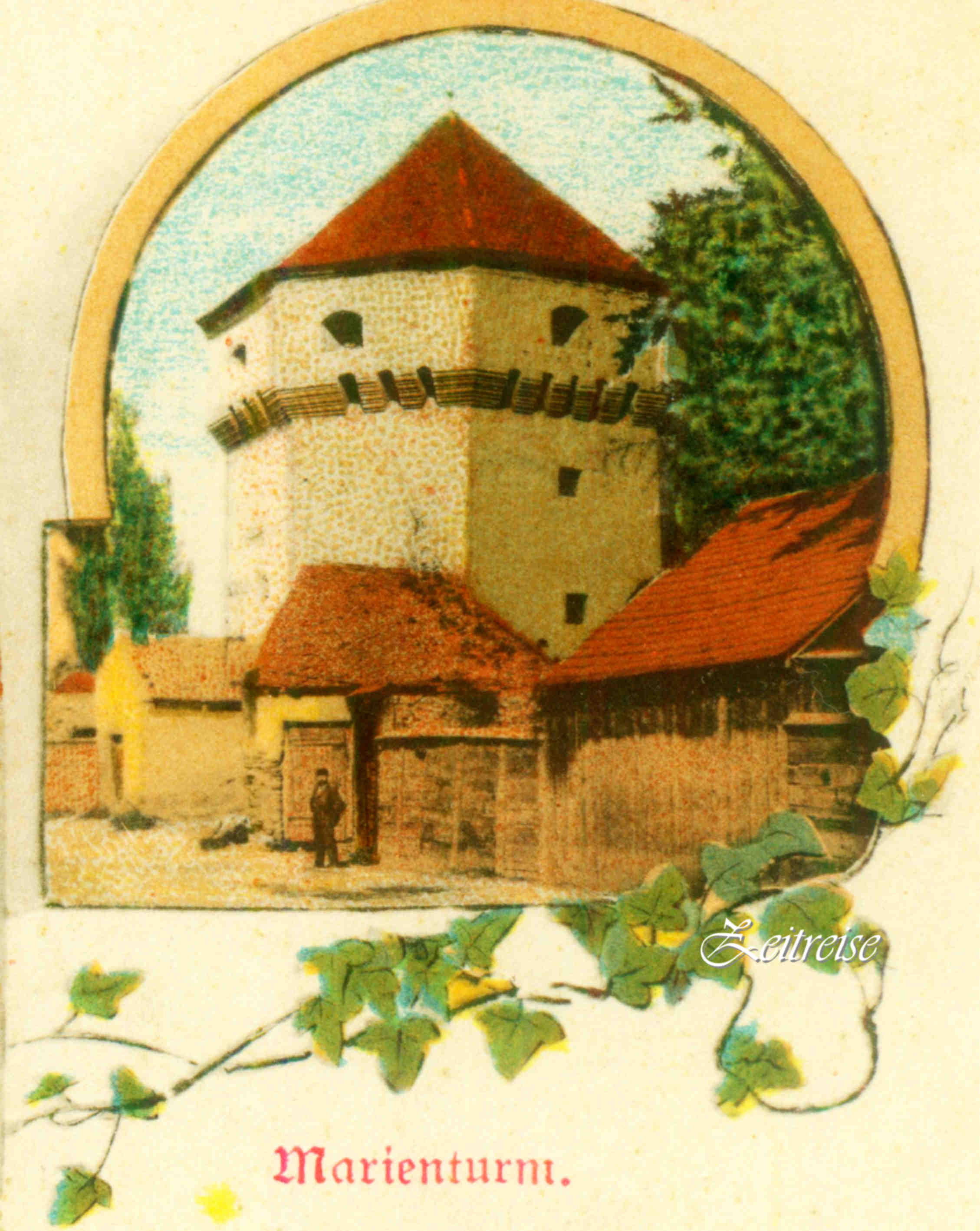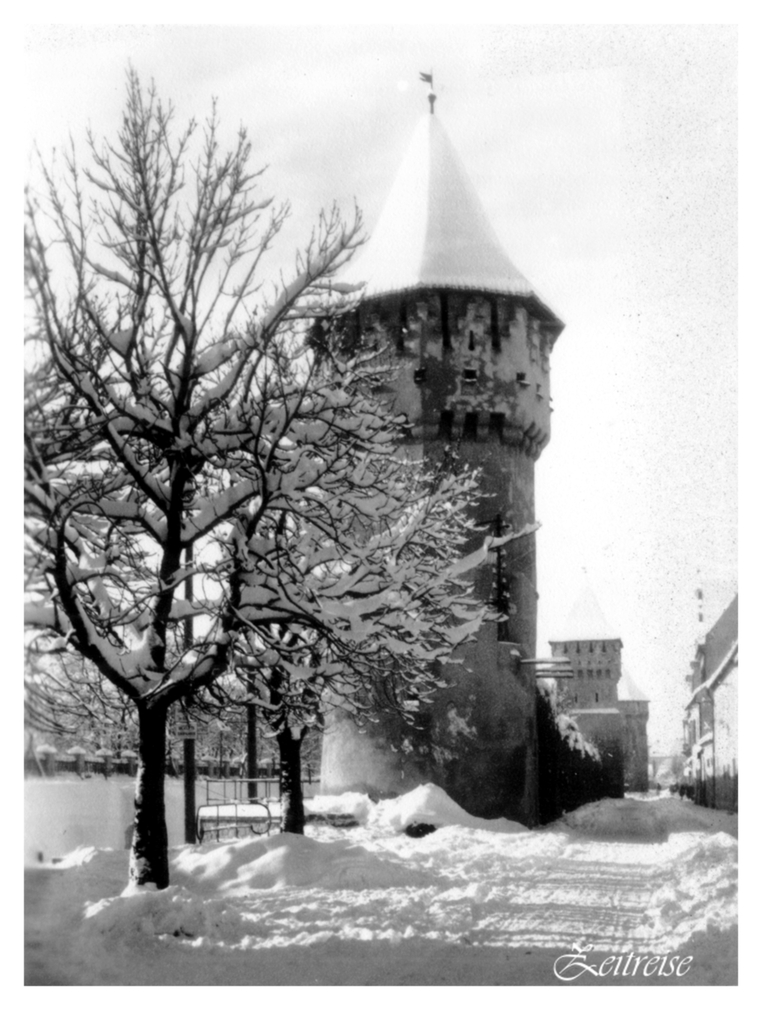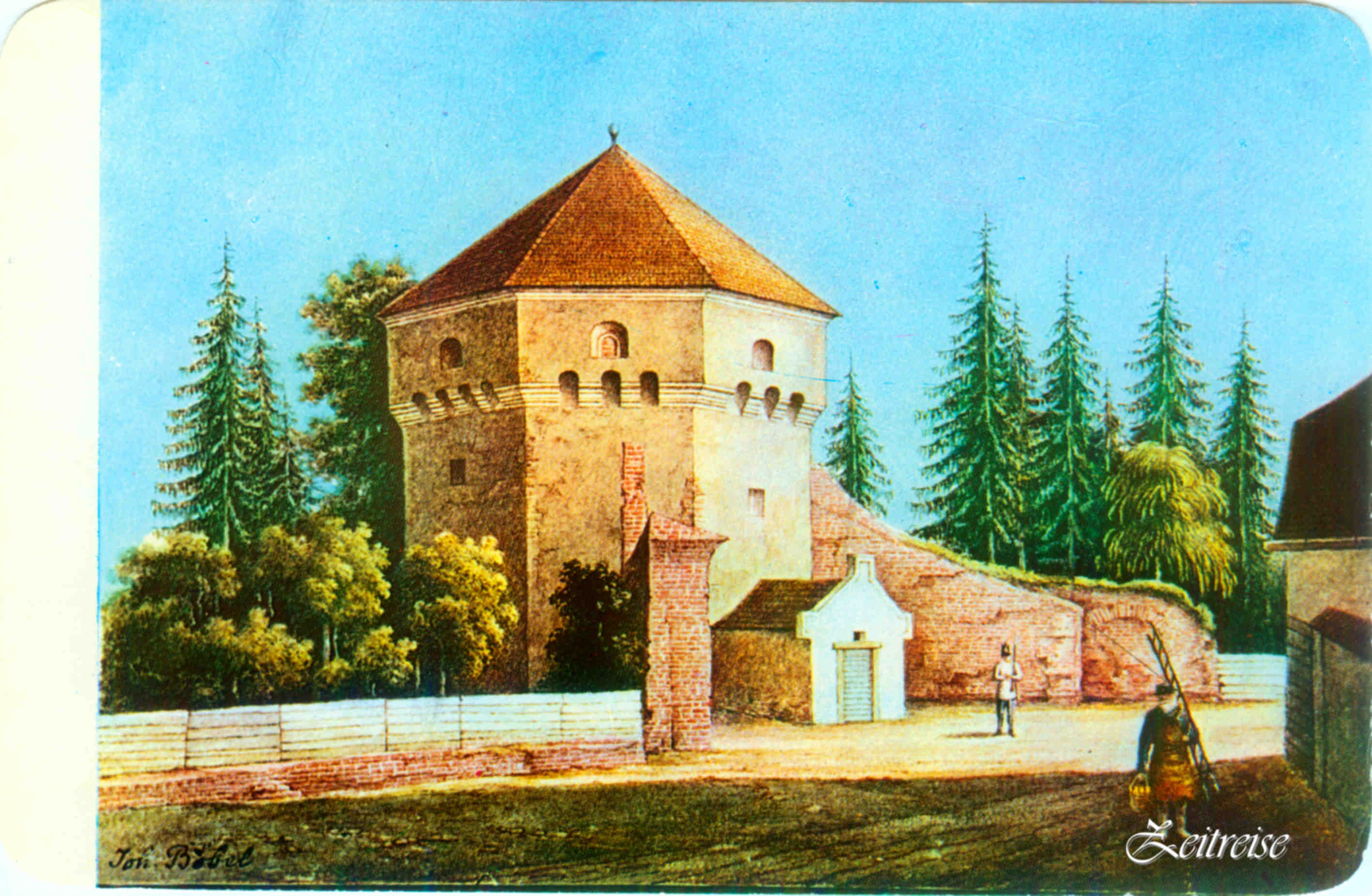 „Turnul Pielarilor văzut dinpre str.Pulberăriei // „Lederer Turm“. În spatele turnului și al zidului de apărare se văd brazii și copacii din Grădina Studenților – pictură de Johann Böbel – Carte Poştală, dintr-un set cu picturi executate de Johann Böbel, tipărite la Întreprinderea Poligrafică Sibiu