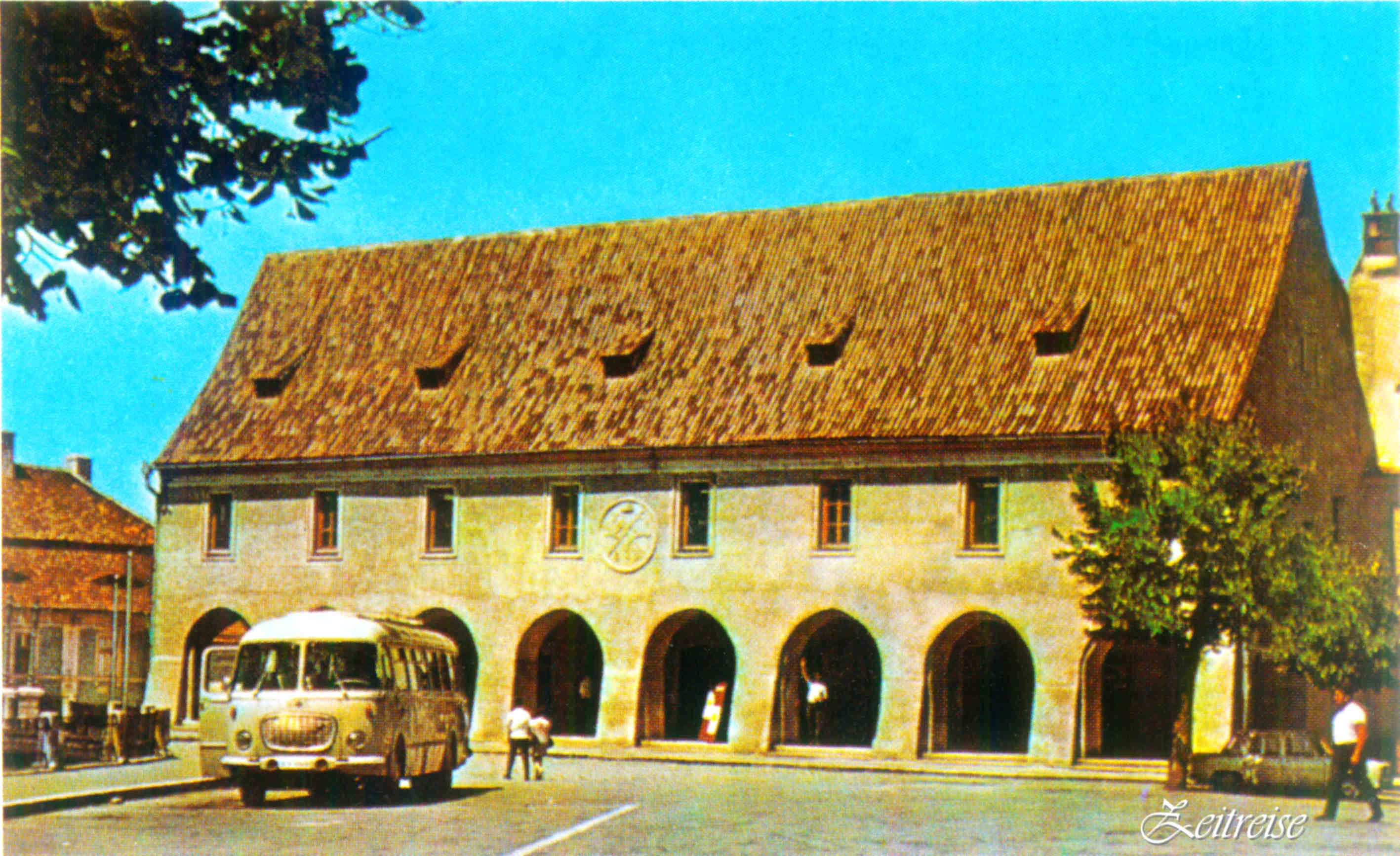 Clădirea apare deja în 1370 într-un matricol bisericesc sub denumirea de „Fleischerlauben“, „Halele măcelarilor“. De-a lungul timpului, încăperea spaţioasă de la etaj (2o metri lungine, 8 metri lăţime) a fost folosită de bresla Cojocarilor / Postăvarilor ca depozit pentru mărfuri, iar în sec. 18 a funcţionat ca depozit orăşenesc pentru ovăz. În toamna anului 1765 spaţiul de la etaj a fost folosit, scurt timp, ca sală de teatru pentru Trupa de Comedianţi condusă de Gertraut Bodenburger şi în 1787 de Trupa de Actori condusă de Franz Düwald. La parter au funcţionat, multă vreme, halele Măcelarilor. Din timpul renovărilor efectuate 1787-1789 datează şi Stema oraşului de pe faţada clădirii. În 1967-1969 clădirea a fost restaurată, trecerea boltită şi cele 8 arcade au fost redeschise şi clădirea a primit înfăţişarea actuală.Adriana Moscicki