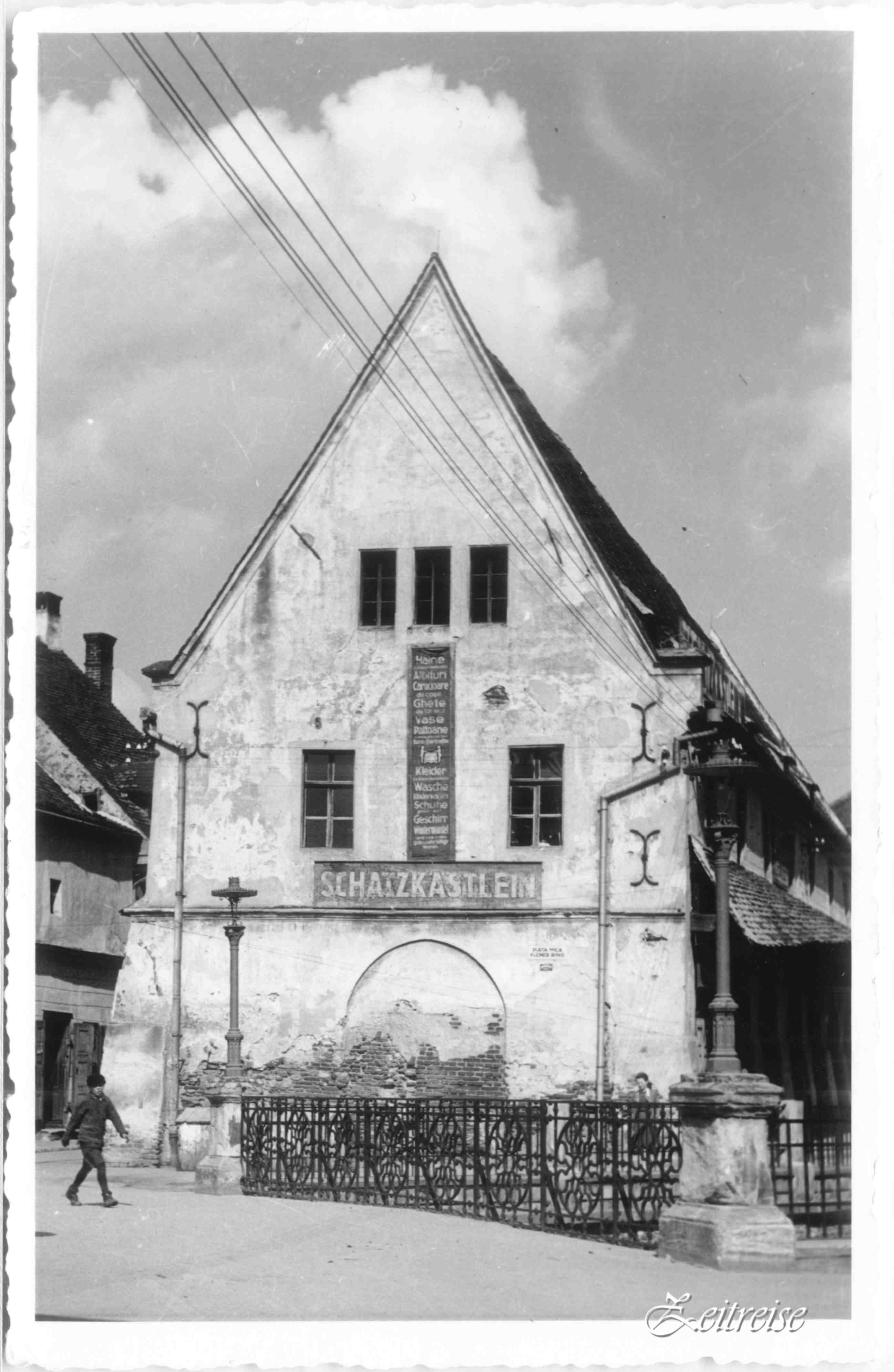 Numele clădirii din Piaţa Mică 21, „Scrinul cu comori“ – „Schatzkästlein“, provine de la cel al magazinului deschis în data de 19 ctombrie 1920 de către „Reuniunea petru ocrotirea copiilor din Sibiu“ (Kinderschutzverein) în încăperea de la etaj şi a funcţionat acolo mai mult de două decenii. De fapt nu era doar un magazin, o prăvălie ci şi Casă de amanet, „Pfandleihaus“!