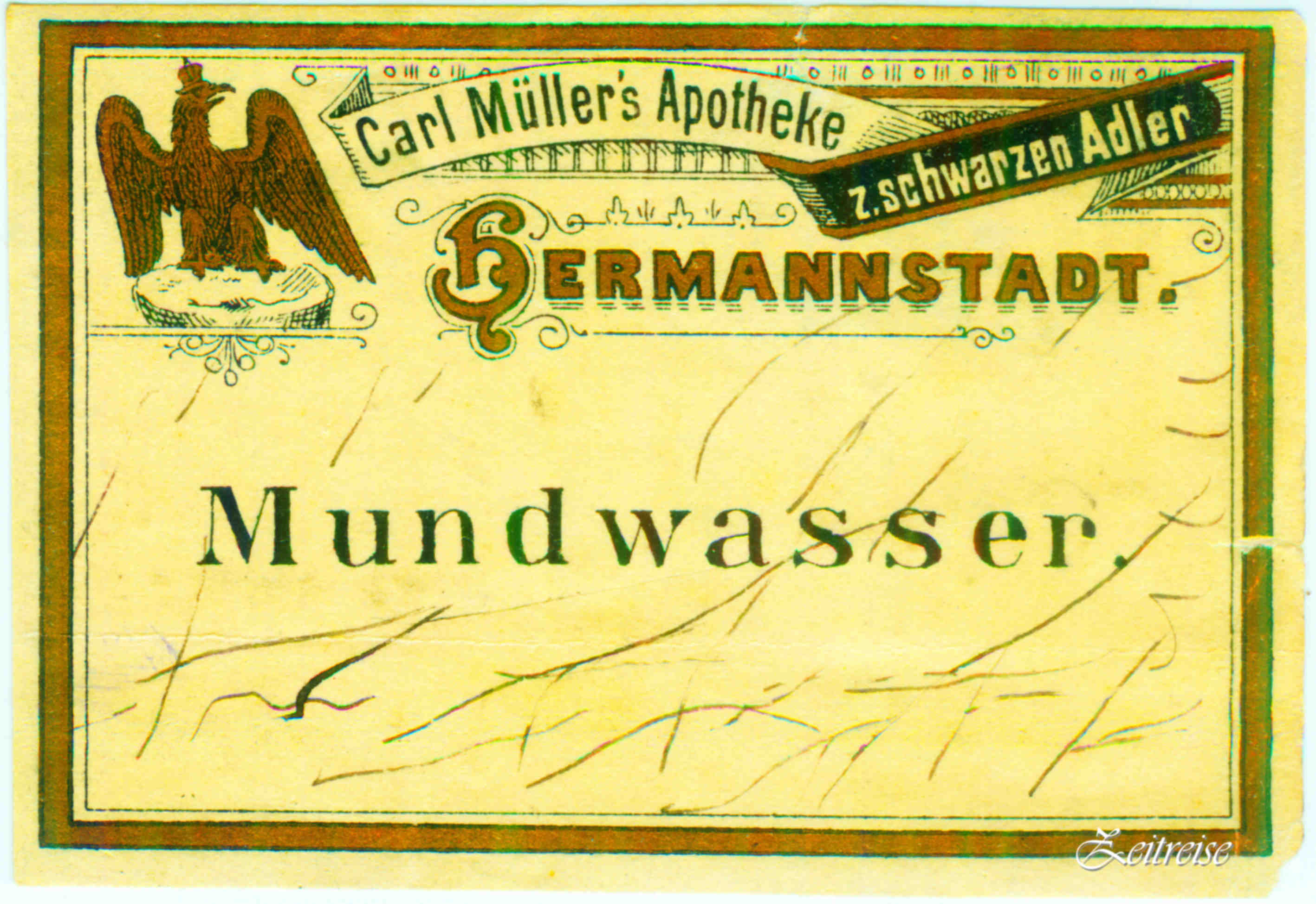 Într-un „top“ naţional, oraşul nostru deschide demn o grămadă de liste! Să nu lăsăm nimic în uitare! Orice imagine, loc, amintire să fie prilejul unei rememorări! Din plimbările mele indepărtate vă pot spune, orice oraş are un locaş care se numeşte „La Vulturul…“, poate hotel acum de lux altă dată han, poate restaurant, altă dată un birt. Noi am avut o farmacie „La Vulturul Negru“… Poate unii dintre cititori îşi amintesc de existenţa ei, poate doar din auzite.Iată eticheta unui recipient pentru „apă de gură“ cu emblema farmaciei lui Carl Müller „La Vulturul Negru“ (Zum Schwarzen Adler), prilej să ne amintim. Farmacia „La Vulturul Negru“ a functionat sub acest nume din 1704 pina la nationalizare in 1949.
