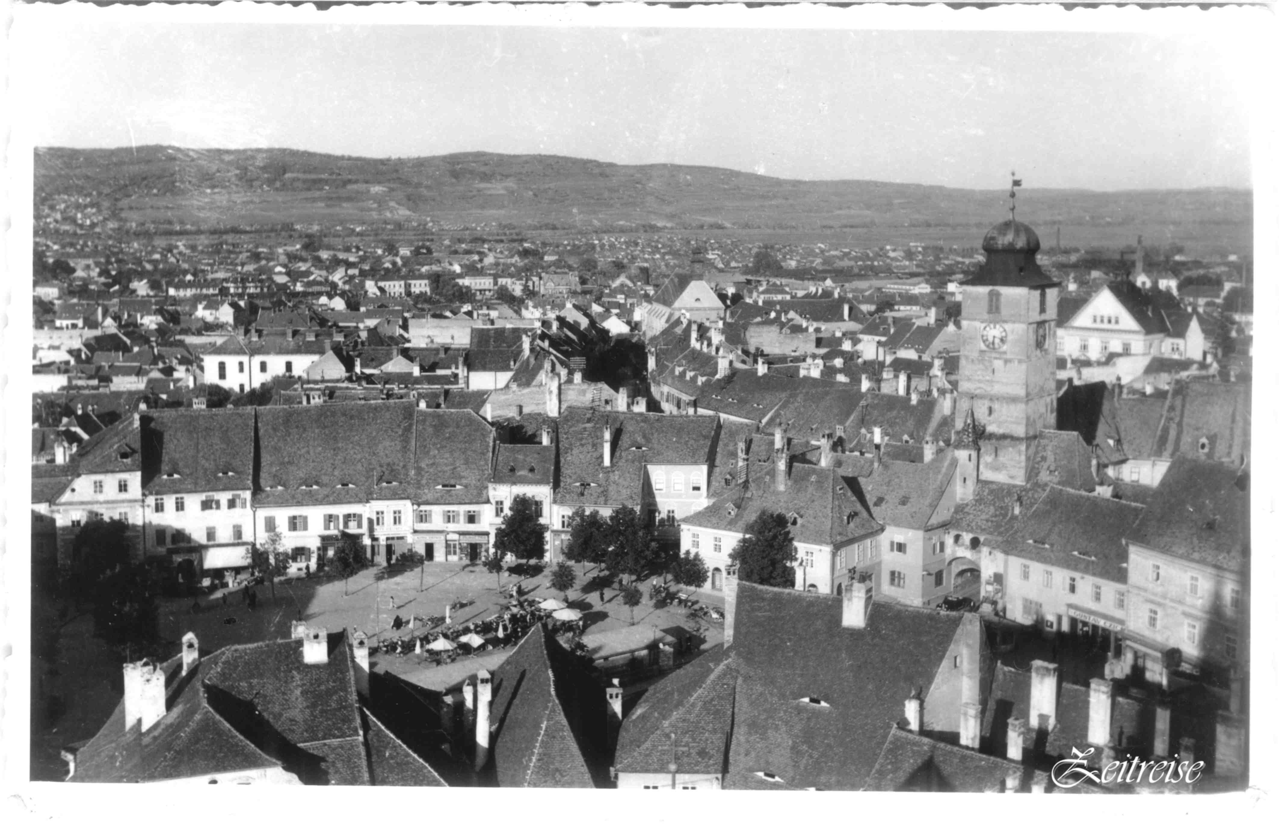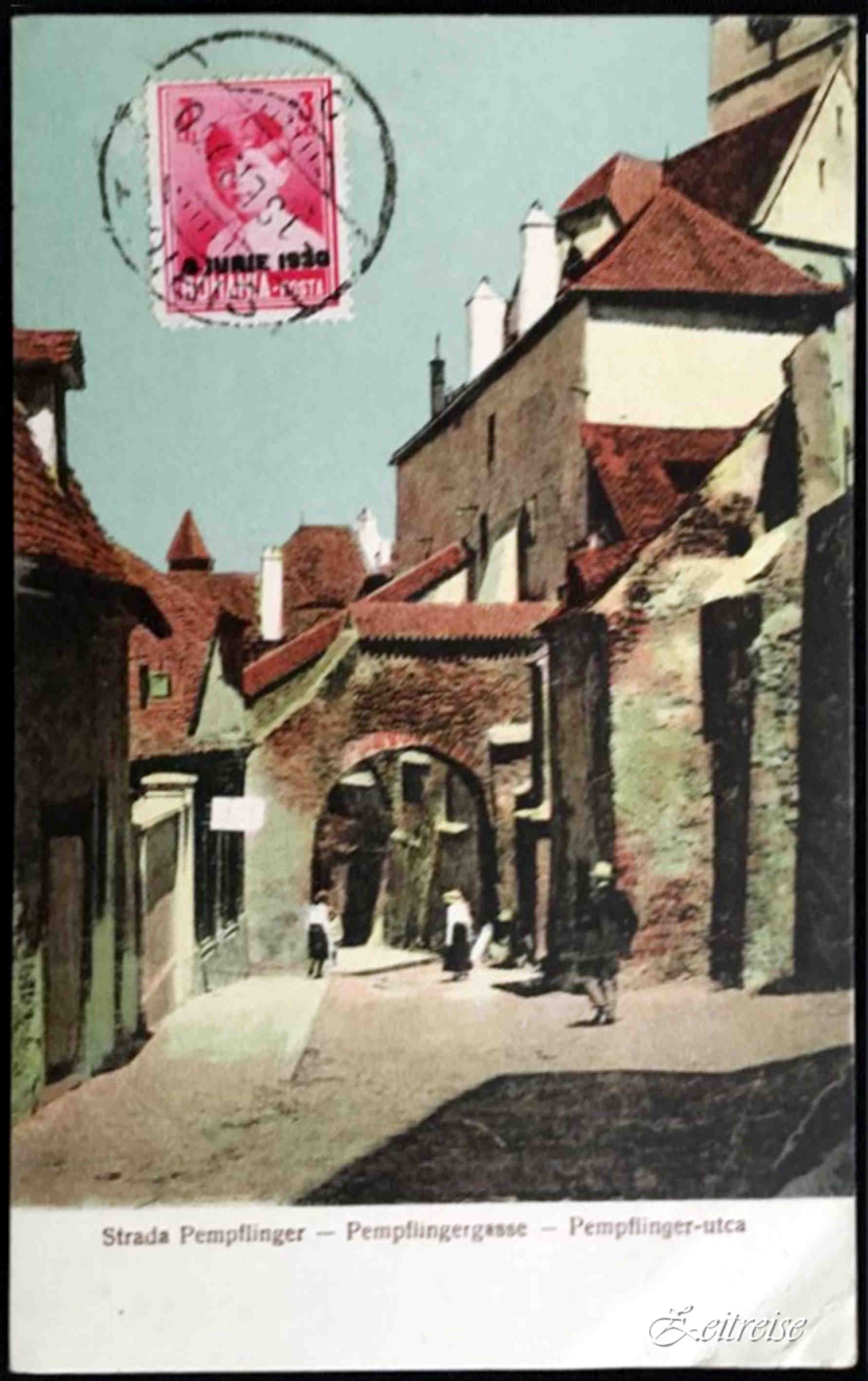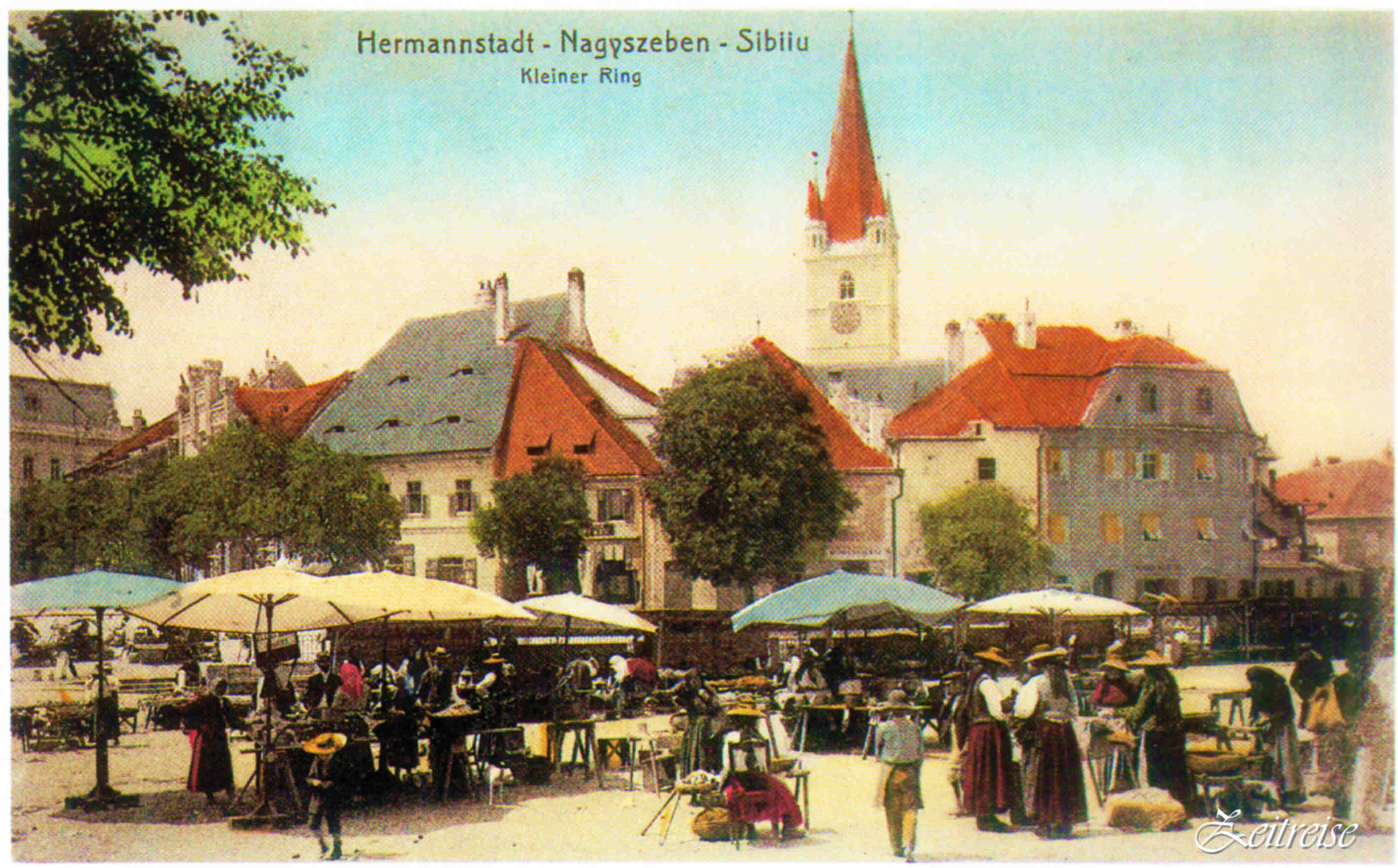 „Piaţa Mică cu Turnul Sfatului“ – Carte Poştală editată 1918, circulată 1920/21. Ştampila poştală este dedicată Asociaţiei corale sibiene „Eintracht“ înfiinţată 1880 (Hermannstädter Gesangverein „Eintracht“).
