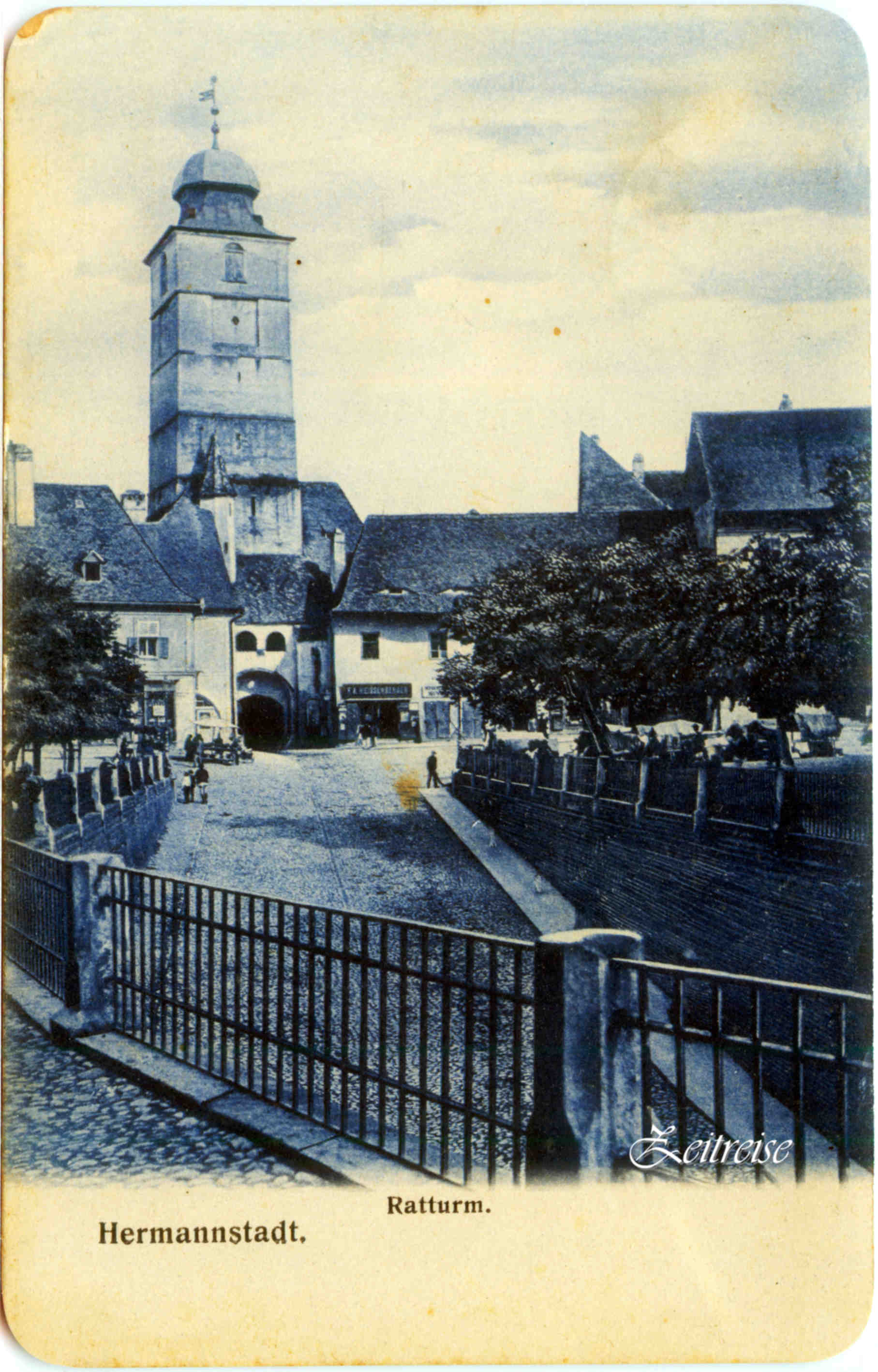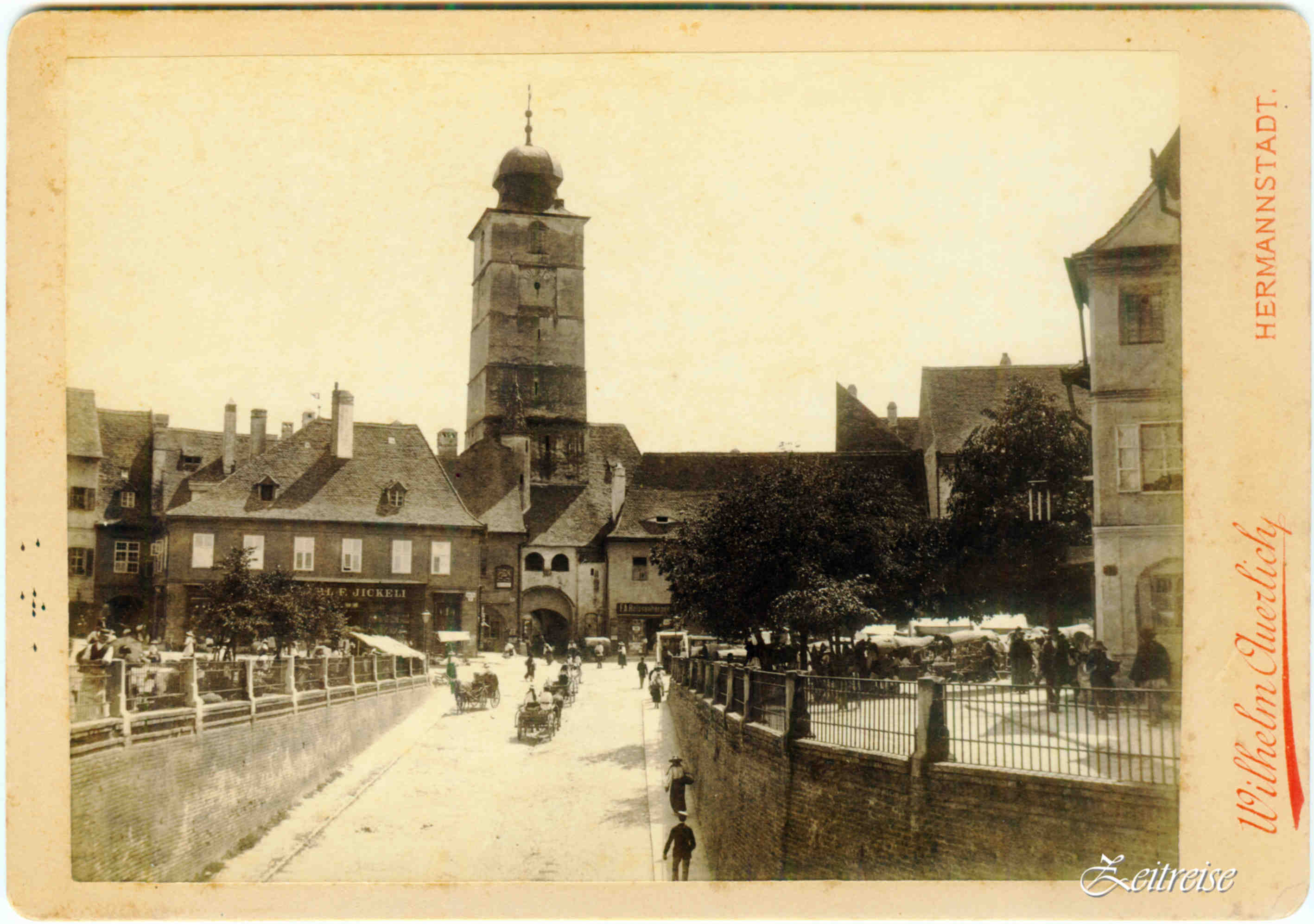 ca în poveste, de mişti vreo baghetă magică, căruţele ar începe a scîrţăi peste pietre, ţărăncile a-şi învîrti fustele şi pălăriile din colo încoace, turnul a suna un gong grav şi prelung, tîrgoveţii a bate palma. Drumul însăilat pe sub umbră de porţi şi pe sub pod din Oraşul de jos în cel de sus şi înapoi, tropotitul paşilor în depărtarea vreunei amintiri… Bijuterie în sepia din atelierul lui Wilhelm Auerlich (1853 Braşov – 1917 Sibiu) devenit, şi el, fotograf al Cetăţii şi membru al Societăţii fotografice din Viena.