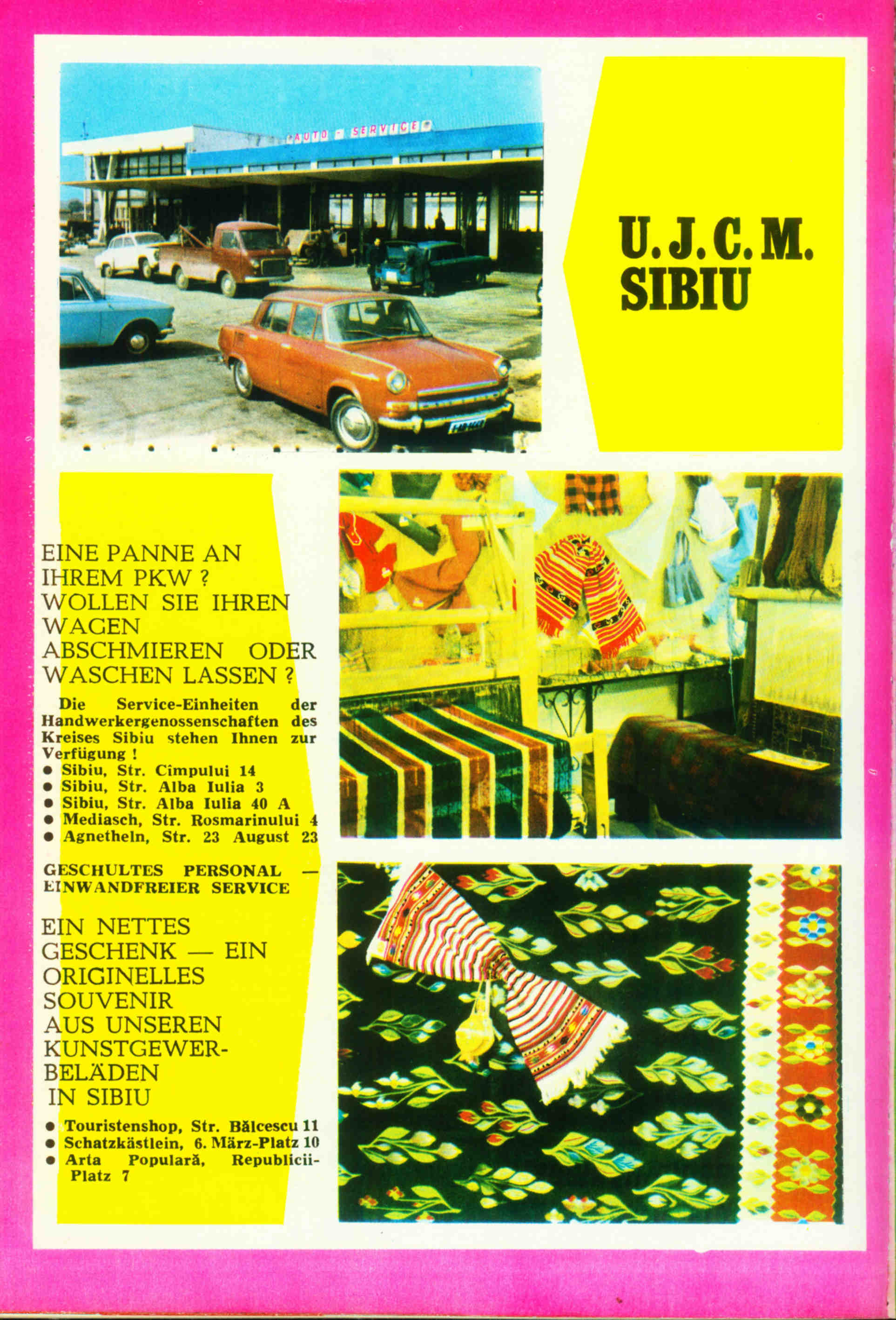 Ce puteam oferi prietenilor mai vechi ori mai noi de prin străinătăţuri??? Ii în broderii de mătase, feţe de masă şi şervete înflorite în cruciuliţe ori cu alesătură, ştergare ţesute în roşu şi negru, trăişti, ploşti de lemn pline cu ţuică locală, farfurii cu cetăţi şi blazoane Transilvănene, ceramică smălţuită, opaiţe şi căni de vin, pardesie de postav cu fir negru alambicat, rochii de in topit în interpretare modernă, păpuşi îmbrăcate în port naţional şi bine închise în cutii de plastic trasparent şi toate ieşite din cooperativele meşteşugăreşti, aceste „bresle“ de modă nouă. Le-am uitat şi pe ele, aşa cum am uitat magazinele de cadouri înţesate cu artizanat şi alte mici „suveniruri“, uneori kitsch, alteori artă şi frumuseţe, pete colorate în cenuşiul rutinei noastre!