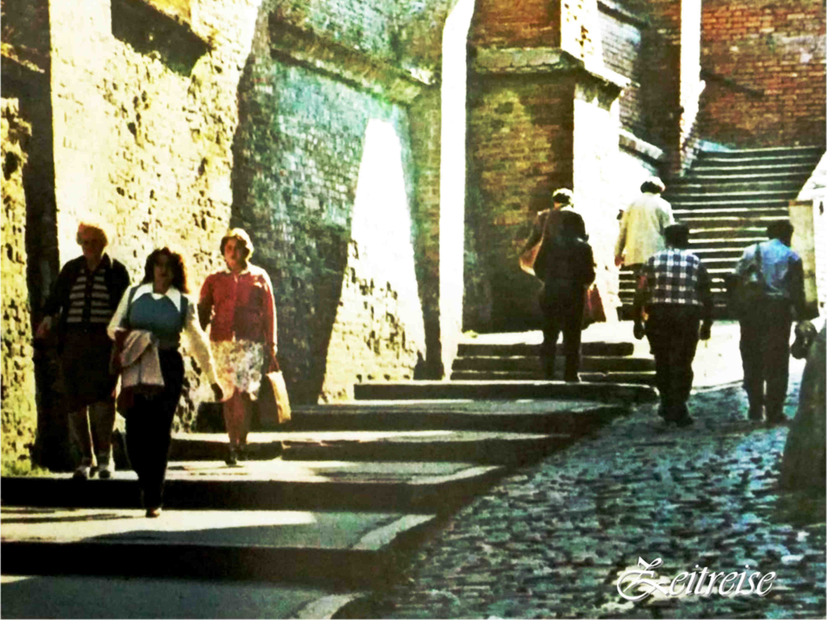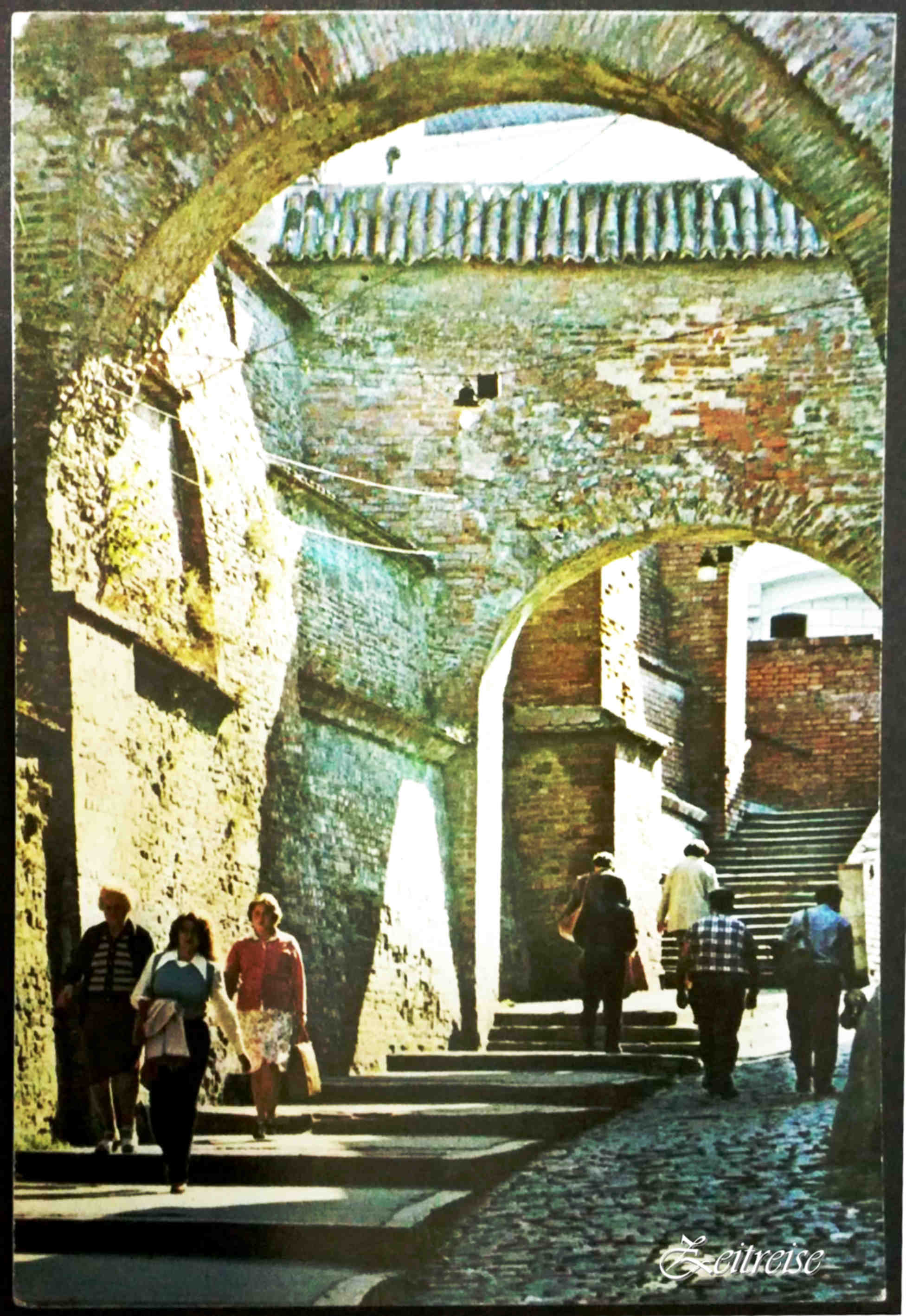Carte poștală, text verso: Sibiu – Pasajul Scărilor – The Stairway Passage – Le Passage des Escaliers – Treppenpassage – Сибич Лестничный пассаж