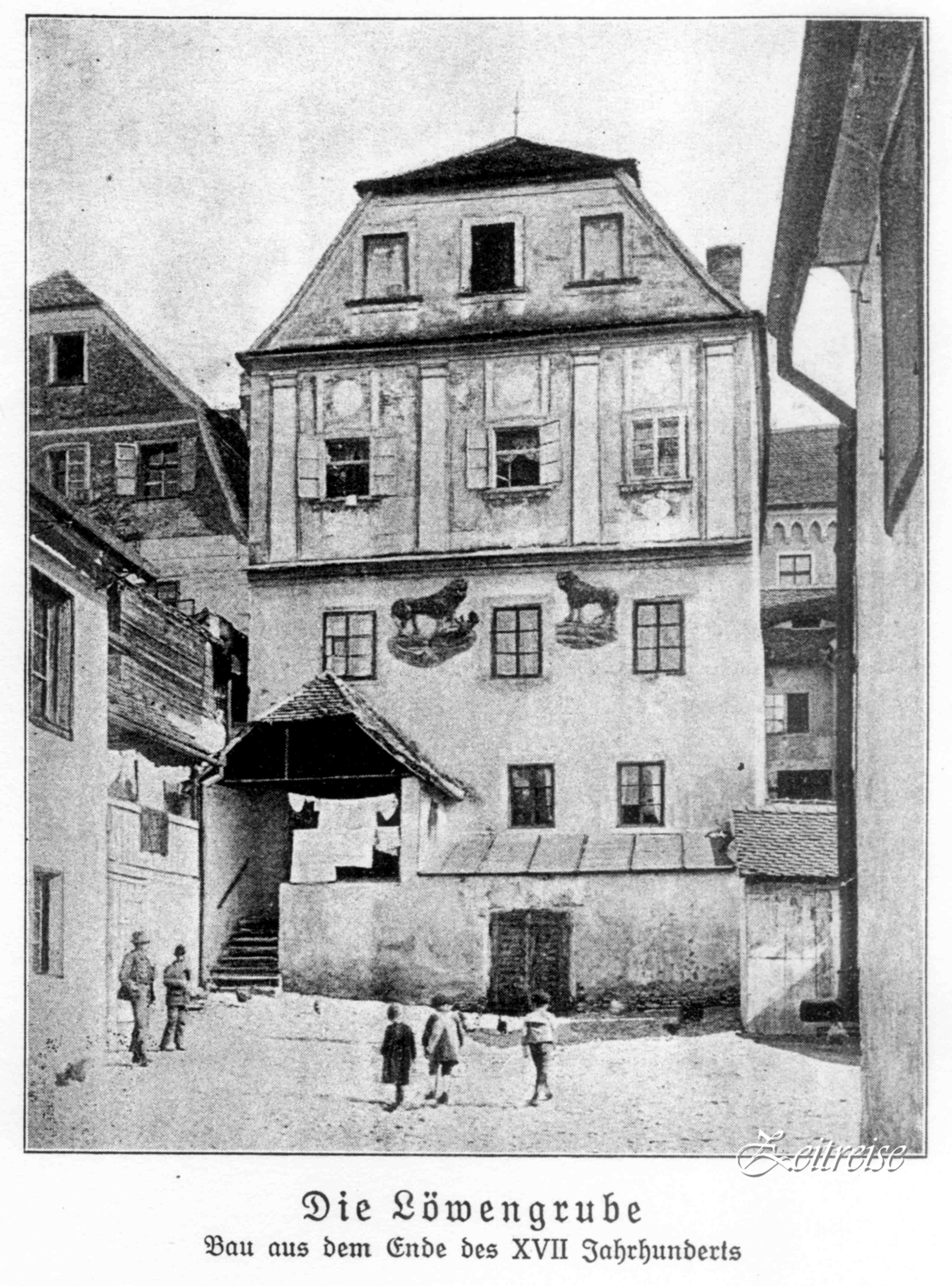 Casa cu lei, str. Alexandru Odobescu nr.18 – Spre Str. Moş Ion Roată, la etajul 2 al clădirii, se aflau doua basoreliefuri pictate reprezentând tema biblică – proorocul Daniel in Groapa cu lei. Complexul de clădiri „Groapa cu lei“ (Löwengrube) a fost demolat 1934 – sursa foto: „Alt-Hermannstadt“
