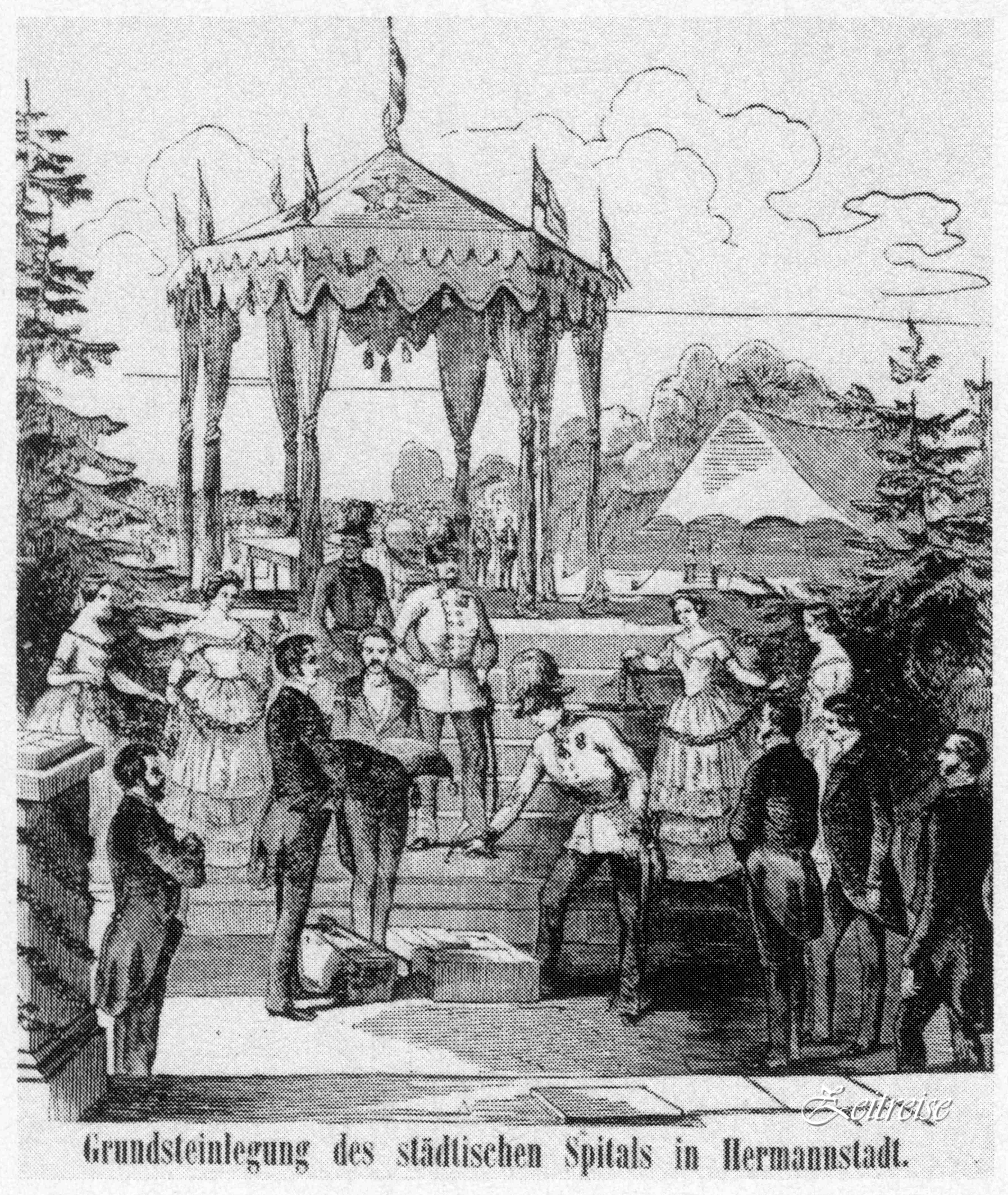 Împăratul Franz Joseph I – în timpul festivităţii punerii pietrei de temelie a Spitalului Orăşenesc şi la sărbătoarea din Pădurea Dumbravă, pe estrada stejaului care îi va purta numele – sursa ilustrații: „Alt-Hermannstadt“