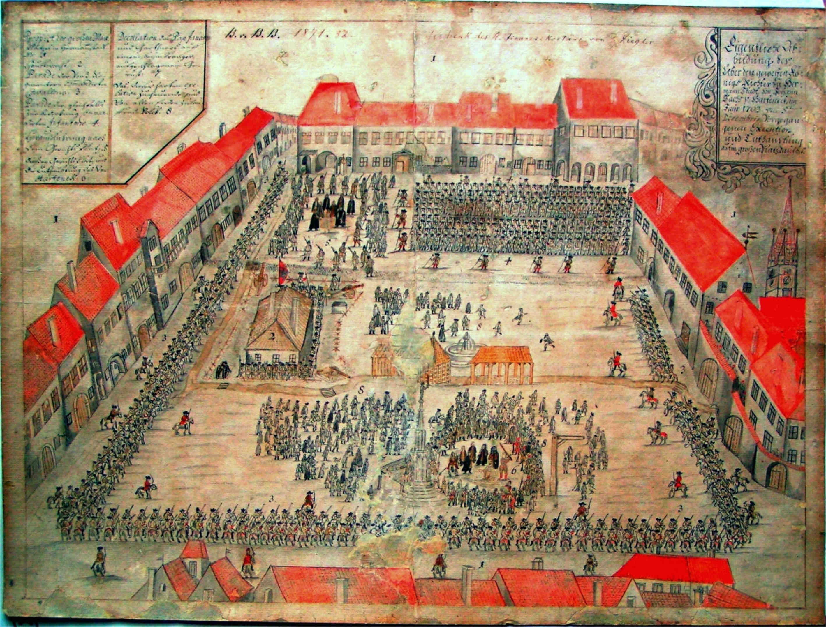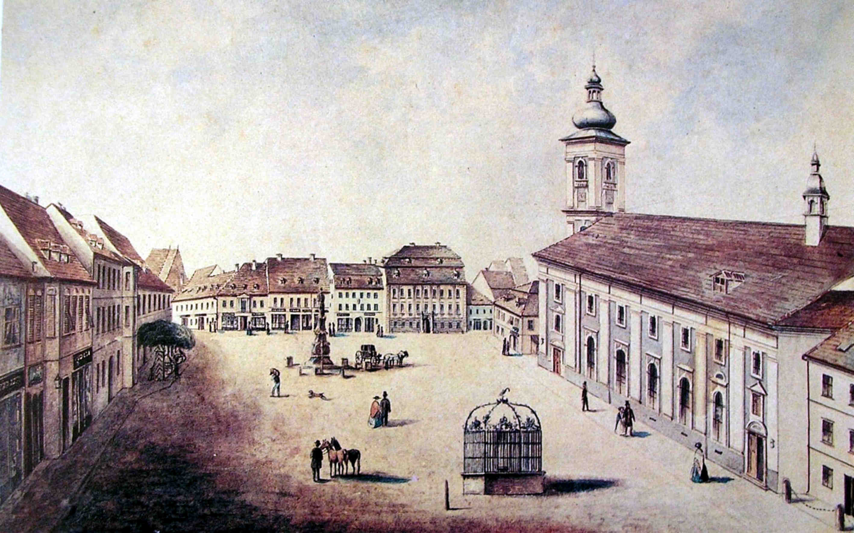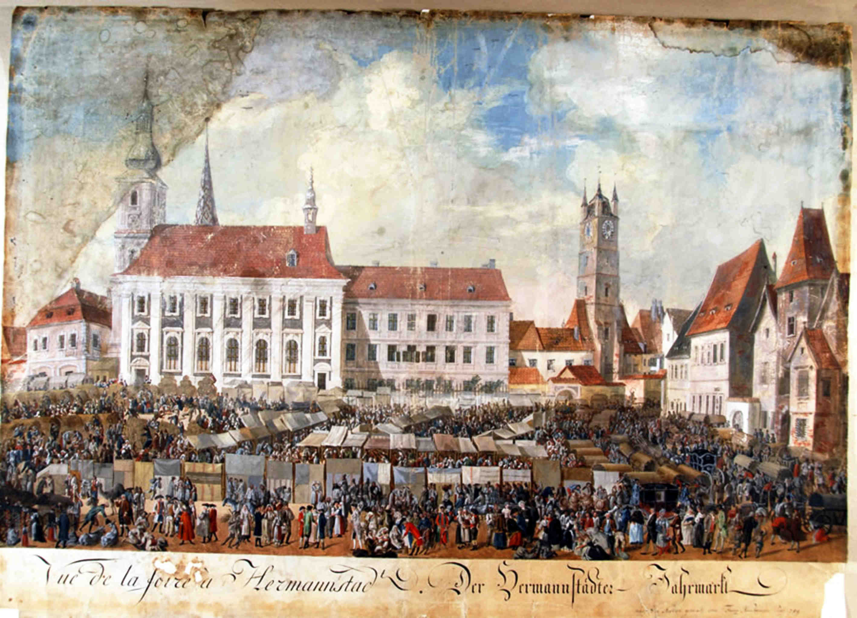 Şi, de privim în timp spaţiul pieţei,( şi nu putem să o facem decât de sus, din înălţimea acoperişurilor „ochiate“, ori a cerului liber!), descoperim scena în care evoluează actorii zilei. Uneori piesa e tragică şi se moare – execuţiile aveau loc în Piaţa Mare – alteori urcă hohote de râs şi batjocură – căci nu departe de stâlpul infamiei, cu statuia lui Roland şi sabia ridicată crestând cerul, se afla și renumita cuşcă pentru nebuni în care erau închişi, pentru o perioada scurtă de timp, cei care tulburau liniştea şi armonia publică!Susurul unei fântâni se aude mereu: aici se adăpau animalele, de aici se despărţeau apele ce se prelingeau apoi pe obrazul năclăit al Cetăţii primenindu-l, ori astupându-i nările cu miasme! Fântâna se plimbă, în timp, dintr-un loc în altul, ca un pion pe care jucătorii îl poartă în funcţie de dorinţa şi interes!