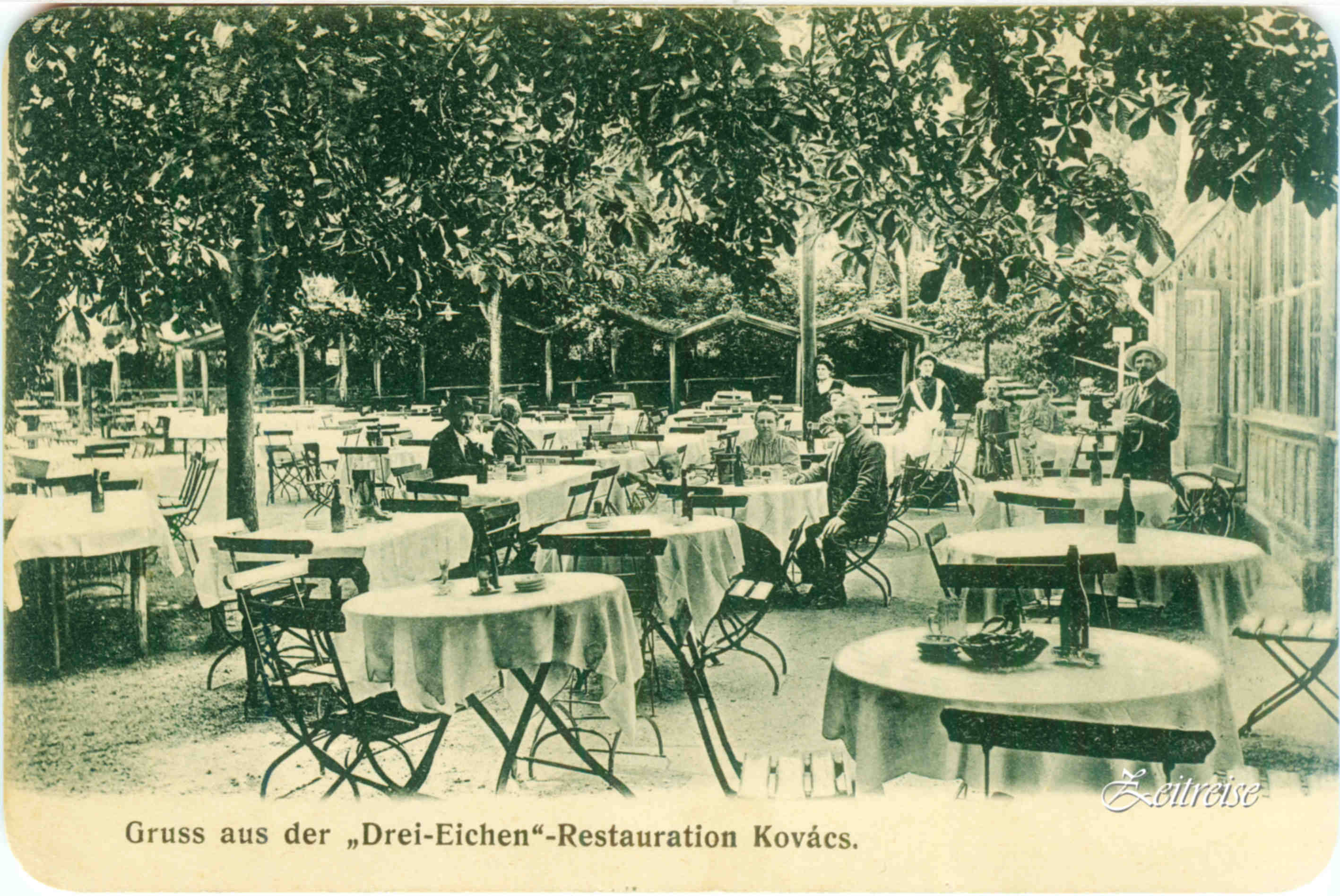 Salutări din Restaurațiunea Kovacs „Trei Stejari“ – Carte Poștală circulată 1908