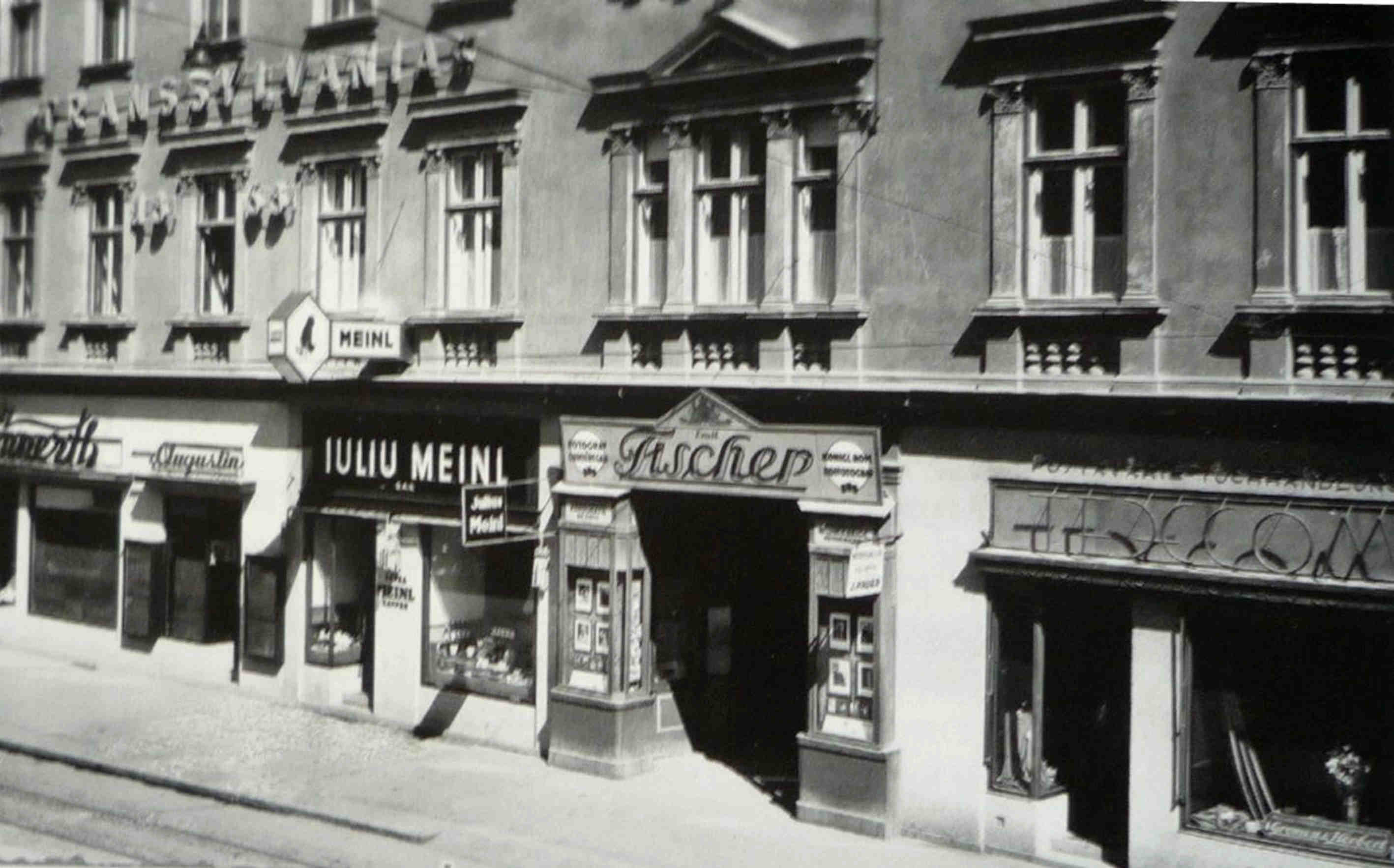 În stânga fotografiei se vede clădirea de lângă „Casă cu lei“, din fostul ansamblu de clădiri „Groapa cu lei“ – Str. A.Odobescu nr.18, demolată 1934. // „Löwengrube“ – Pempflingergasse. Spre Str. Moş Ion Roată, la etajul 2 al clădirii, se aflau două basoreliefuri pictate reprezentând tema biblică – proorocul Daniel în Groapă cu lei. În spatele acestei clădiri se află Şcoala evanghelică primară de băieţi (Evangelisch Knabenelementarschule A.B.) construită 1897, astăzi Liceul de Artă.Adriana Moscicki