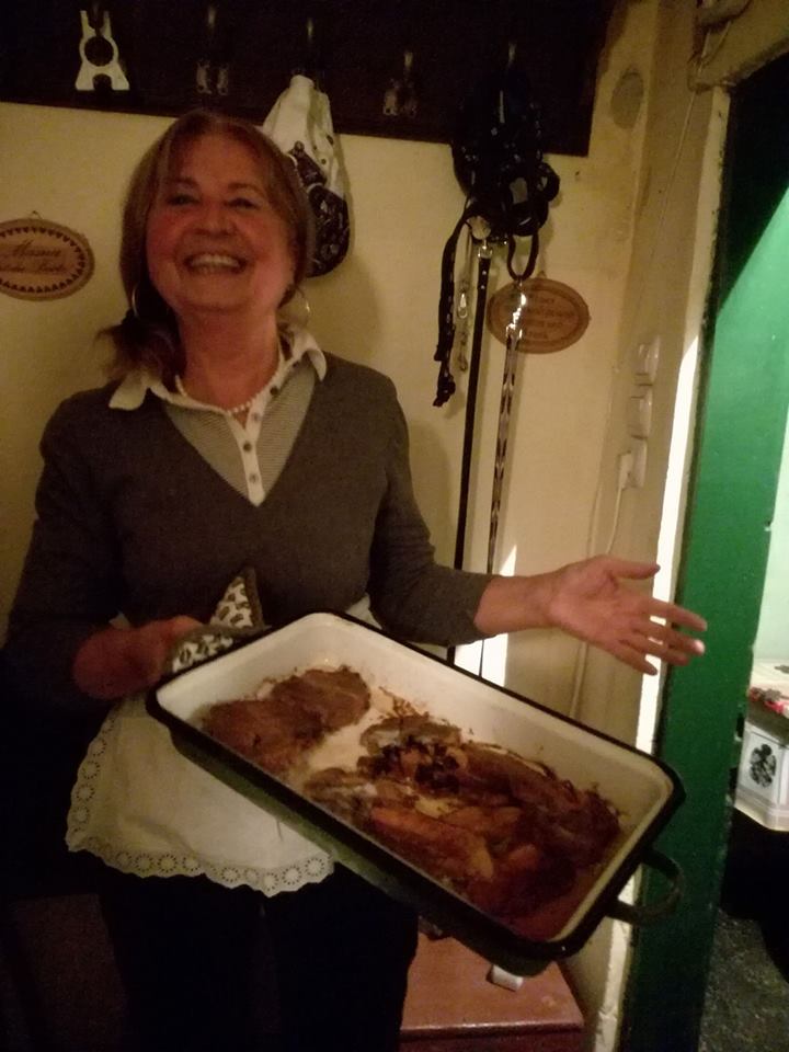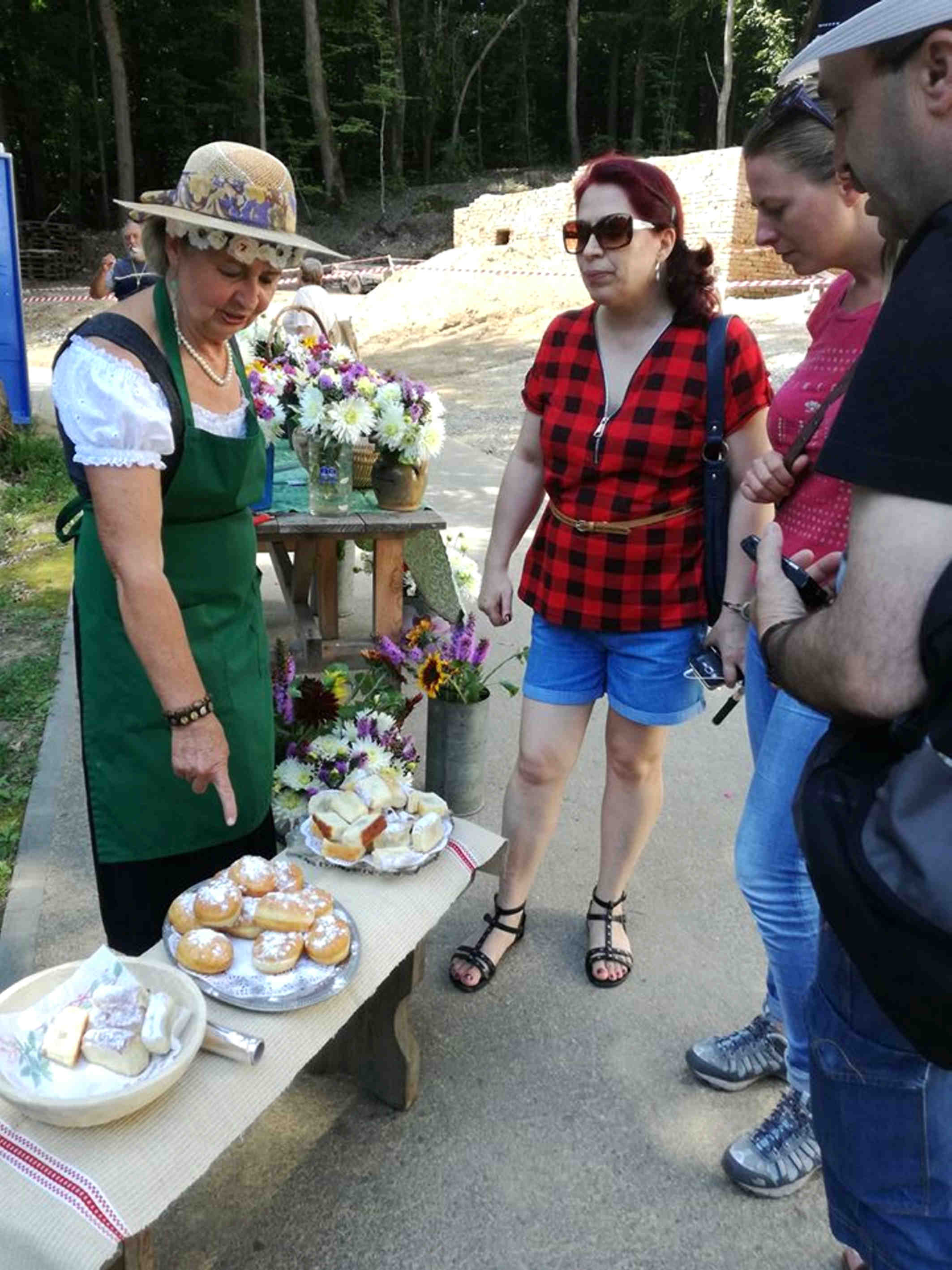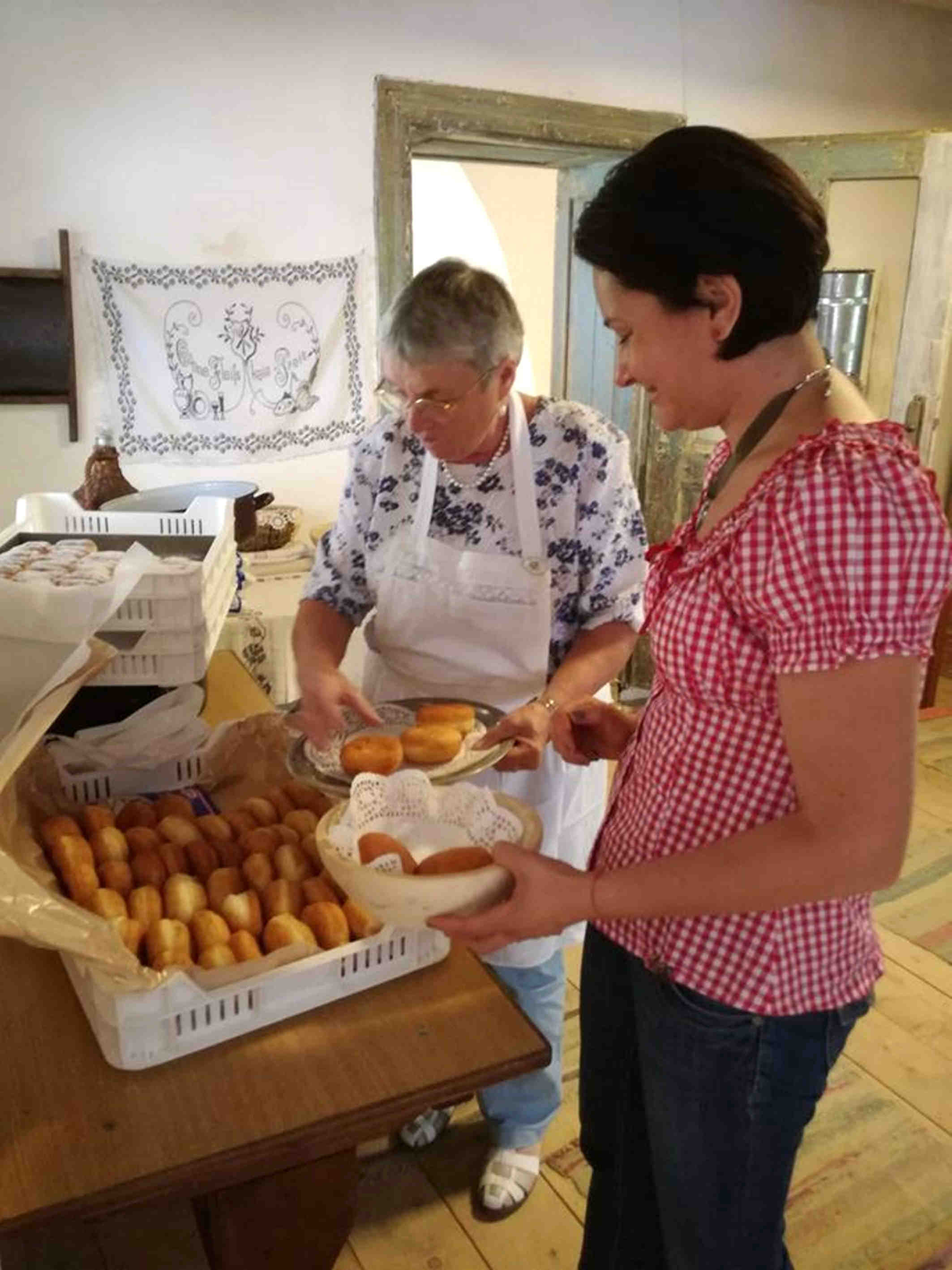 Am găsit-o pe Sara „maestră de ceremonii“ în acțiune, etalându-și zâmbetul și florile, am găsit o splendidă gospodărie săsească în care robotea Frau Dickinger. Pe plita încinsă fierbea în bulbuci gemul de afine sub privirea atentă a televiziunii. Om fi și noi prin cadru acolo și ne-am hlizit apoi, gândindu-ne dacă am apărut din partea cea „mai fotogenică“, dar nici nu ne-a păsat, că eram cu gură de plină de Buchteln!