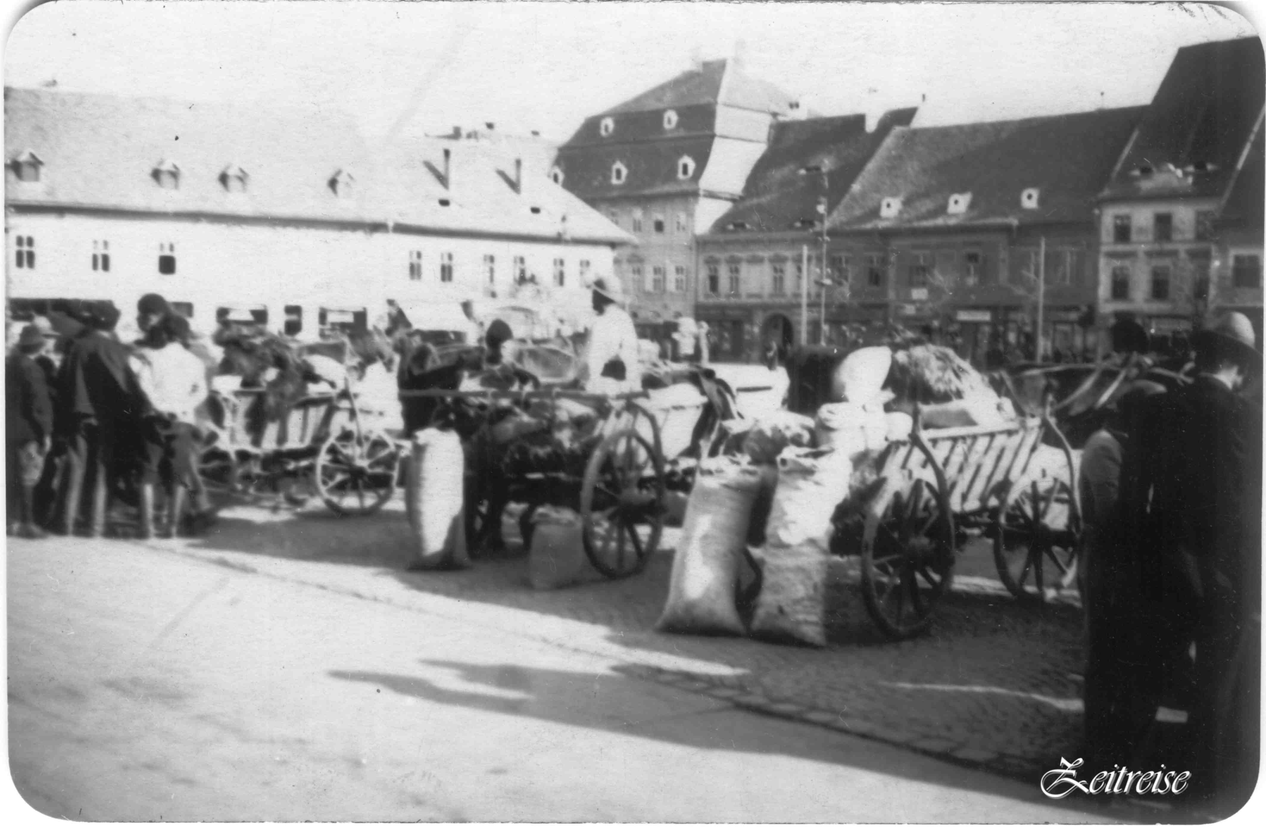 Un grup de soldați, în haine militare din Primul Război, patrula pe alee, pe o prispă se cânta durerea unei mame după fiul plecat la oaste, săsoicile treceau legănându-și panglicile, clarinetul suna până-n cer de-ți venea să rupi pingelele jucând, o mireasă emoționată, mai pe la umbra stejarilor, zâmbea fericită pentru album, doar câinii nimănui picoteau în iarbă, nestingheriți și cu burtă plină.