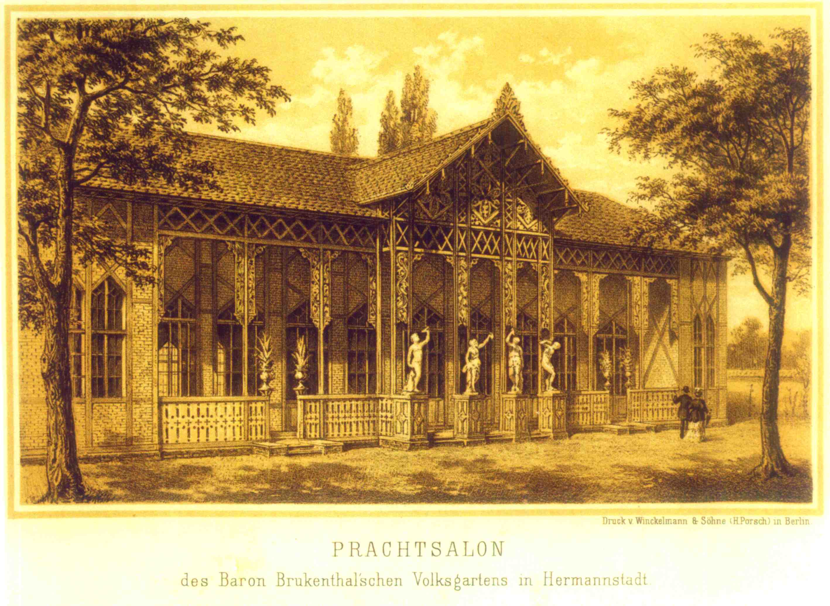 Pavilionul de dans „Prachtsalon” (Pavilionul măreției), sau „Glaspavillon“ (Pavilionul de sticlă) a fost construit în 1870 de baronul Hermann von Brukenthal (ultimul descendent al lui Samuel von Brukenthal) în grădina „Volksgarten”. Grădina „Volksgarten” a fost deschisă de baron în 1869 și era situată între str. A. Șaguna nr. 5 și str. Banatului nr. 2, pe locul unde se află astăzi Colegiul Agricol.Din cartea lui E. Sigerus „Despre vechiul Sibiu“ (Vom alten Hermannstadt) aflăm că, pe locul unde a fost ridicat pavilionul de dans „Prachtsalon”, exista în jurul anilor 1850 o grădină de vară cu un pavilion (Sommer-Salon) unde concerta fanfara militară. Grădina de vară aparținea de hanul „Stadt Wien” al cărui proprietar era Johann Wanke. În 1869 grădina a primit numele „Volksgarten“ (Grădina populară). După moartea baronul Hermann von Brukenthal, în anul 1872, numele grădinii a fost schimbat în „Hermannsgarten“, și a devenit cea mai celebră grădină de vară Sibiană.